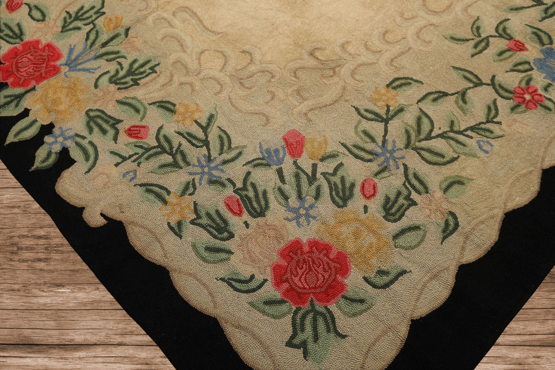 This 9'8'' × 13'7'' hand-hooked wool garden rug celebrates botanical beauty through classic English design. The elegant beige field framed by coral, mint, and blue blooms creates a harmonious floral medallion center. Crafted on a durable cotton foundation with a low 0.25-inch pile, it offers softness, longevity, and refined texture. Each loop and petal is expertly formed to capture vintage appeal and graceful symmetry. Ideal for living rooms, formal dining spaces, or country-inspired homes, this hand-hooked rug adds a touch of romance and timeless craftsmanship to any interior.