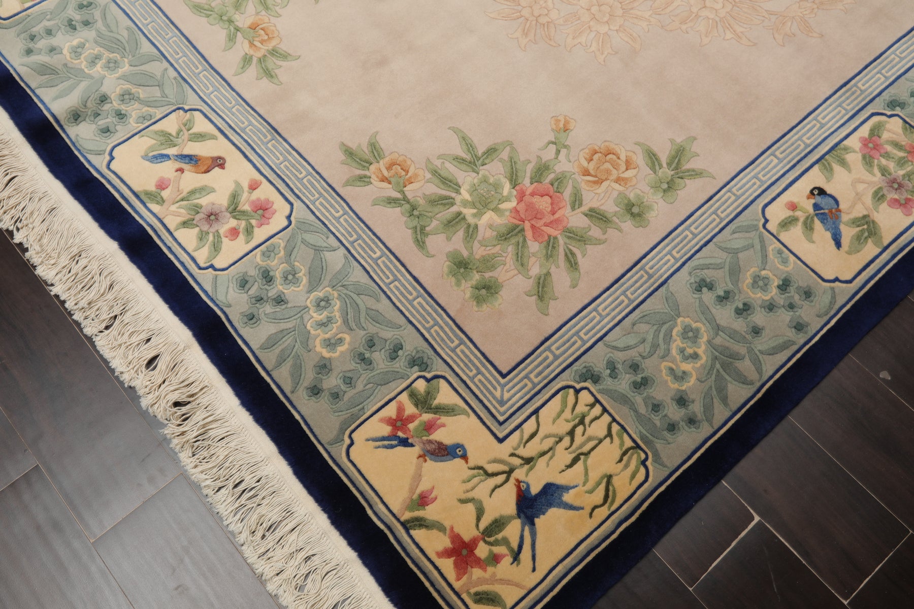 A whisper of old-world Chinese Art Deco charm defines this hand-knotted wool rug, where birds in flight and delicate blossoms unfold on a velvety beige field. Sculpted pile adds dimensional texture, while aqua, coral, blush, and sage tones bring soft vibrancy. A deep navy border grounds the composition with classic contrast. With its silky sheen and 0.75" pile height, this rug delivers both elegance and comfort—perfect for bedrooms, refined living spaces, or formal sitting rooms seeking serene Art Deco refinement.