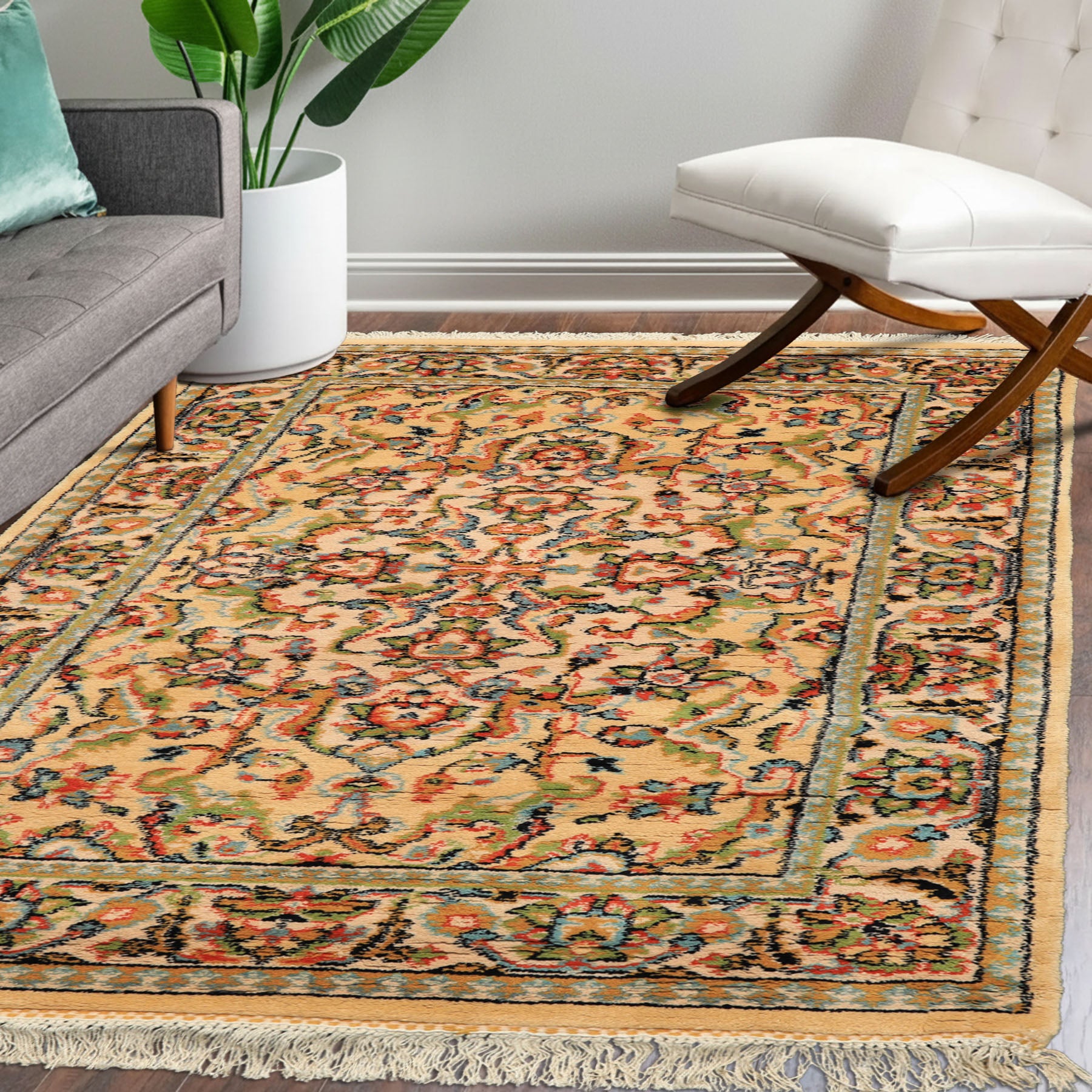 Story Behind the Art: Celeste Rugs’ Indo Oushak styles reinterpret classic Oushak motifs through Indian craftsmanship, known for its mastery of large-scale botanicals, softened outlines, and atmospheric color palettes. These rugs often blend wool or wool-silk fibers, gently faded tones, and open, spacious layouts that emphasize balance. Earth-inspired shades—cream, saffron, muted green, and soft gray—give these rugs a calm presence suitable for modern interiors.