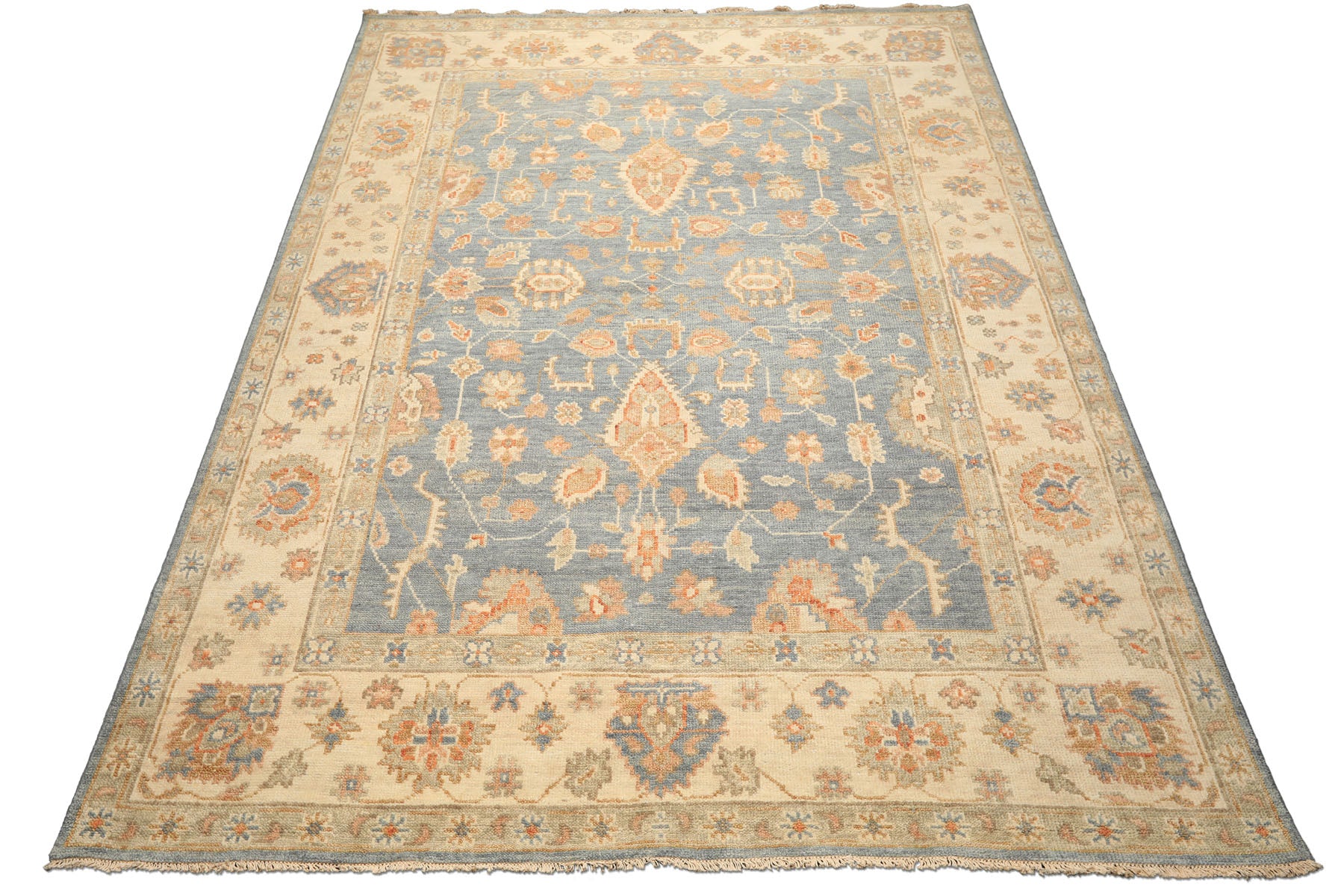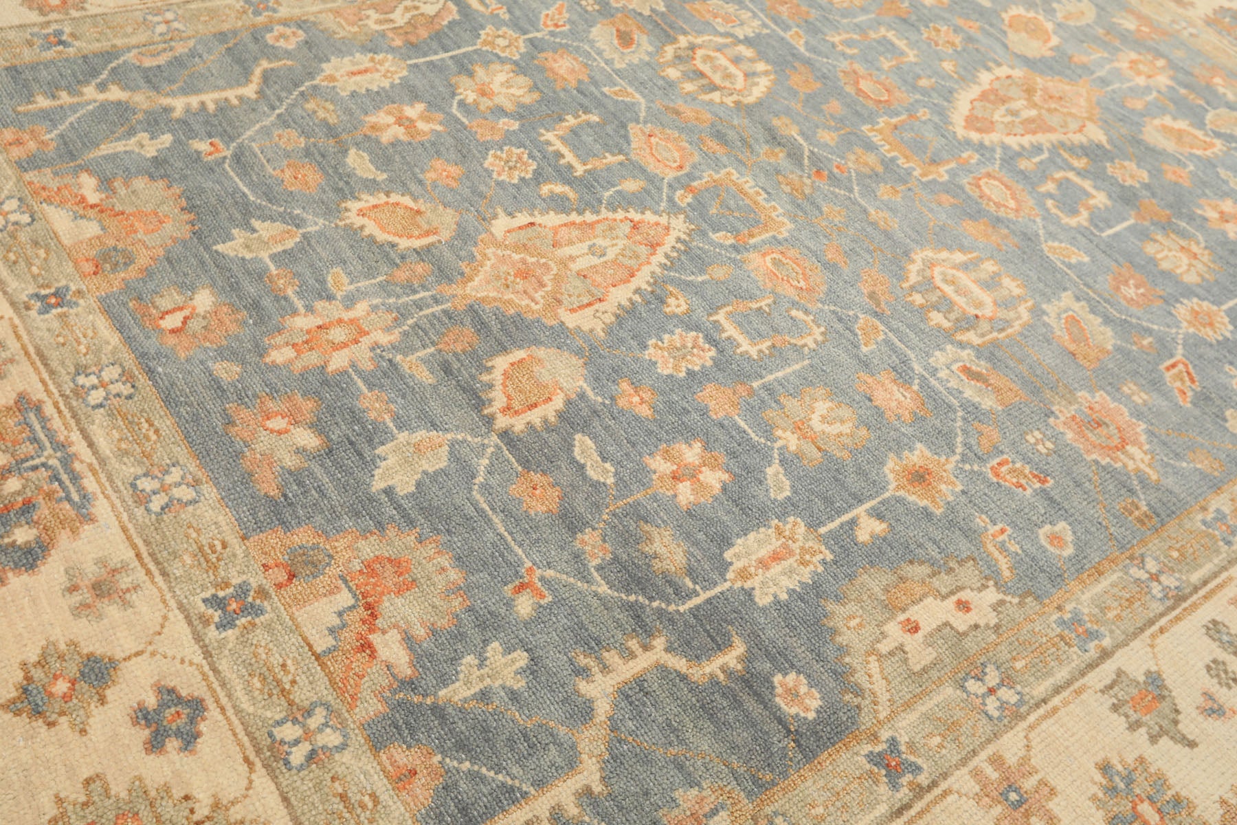 LoomBloom Rugs reimagines tradition with modern clarity in this 9x12 hand knotted Tibetan rug suited for searches like modern traditional wool rug, 9x12 hand knotted rug for living room, and transitional oriental rug USA. A soft powder blue field supports palmettes, flowering vines, and botanical motifs in beige, soft gold, taupe, and aqua tones. Inspired by Persian and Oushak traditions yet interpreted with lighter spacing and contemporary balance, the design feels both timeless and current. A generous beige border with medallions and floral accents adds layered refinement. Hand knotted in 100% wool cut pile on a cotton foundation, it delivers durability, softness, and subtle tonal variation valued in American designer interiors.