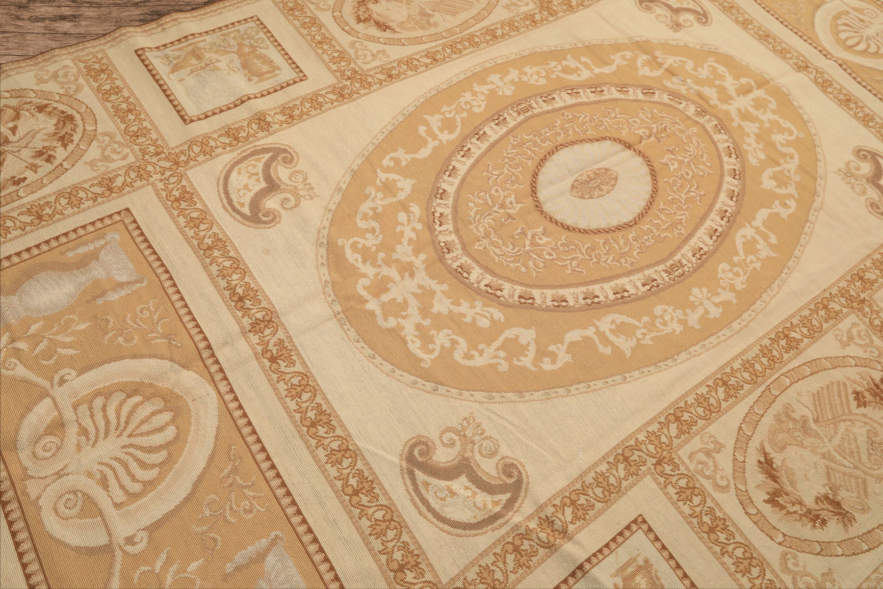 Exuding classic European refinement, this 6'1" x 9'1" handwoven Needlepoint flatweave rug captures the enduring elegance of French neoclassical design. Skillfully crafted from fine wool on a durable cotton foundation, it showcases a central medallion surrounded by ornate vases, scrolling vines, and pastoral flourishes, all depicted in a graceful palette of beige, tan, brown, and soft gray.