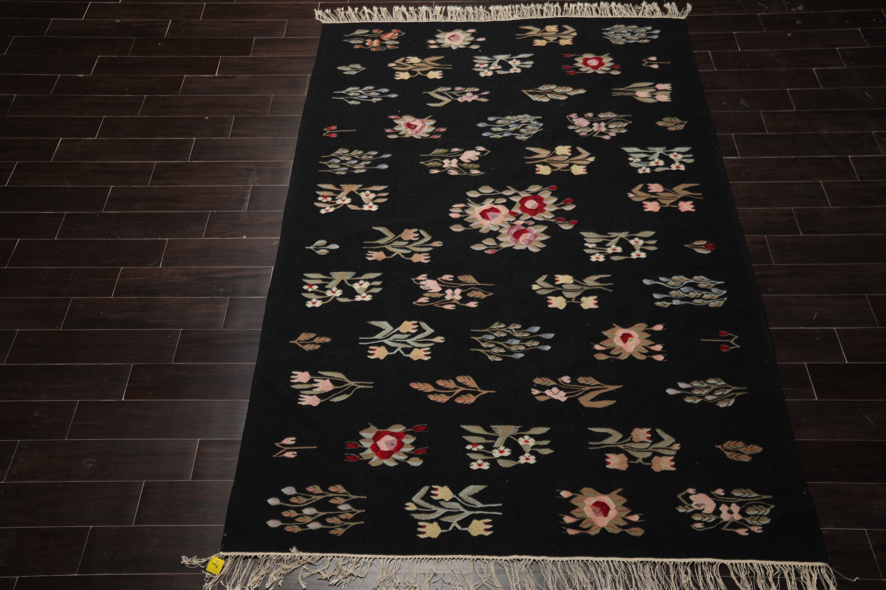 Handwoven in Romania, this wool Kilim features striking floral motifs rendered in black, red, sage, ivory, aqua, blue, pink, and coral tones. Built on a cotton base with a flat 0.1" profile, the rug is decorative, lightweight, and versatile—best suited for low to moderate traffic areas. Its bold palette and traditional craftsmanship make it a standout accent that adds cultural richness and timeless character to any interior.