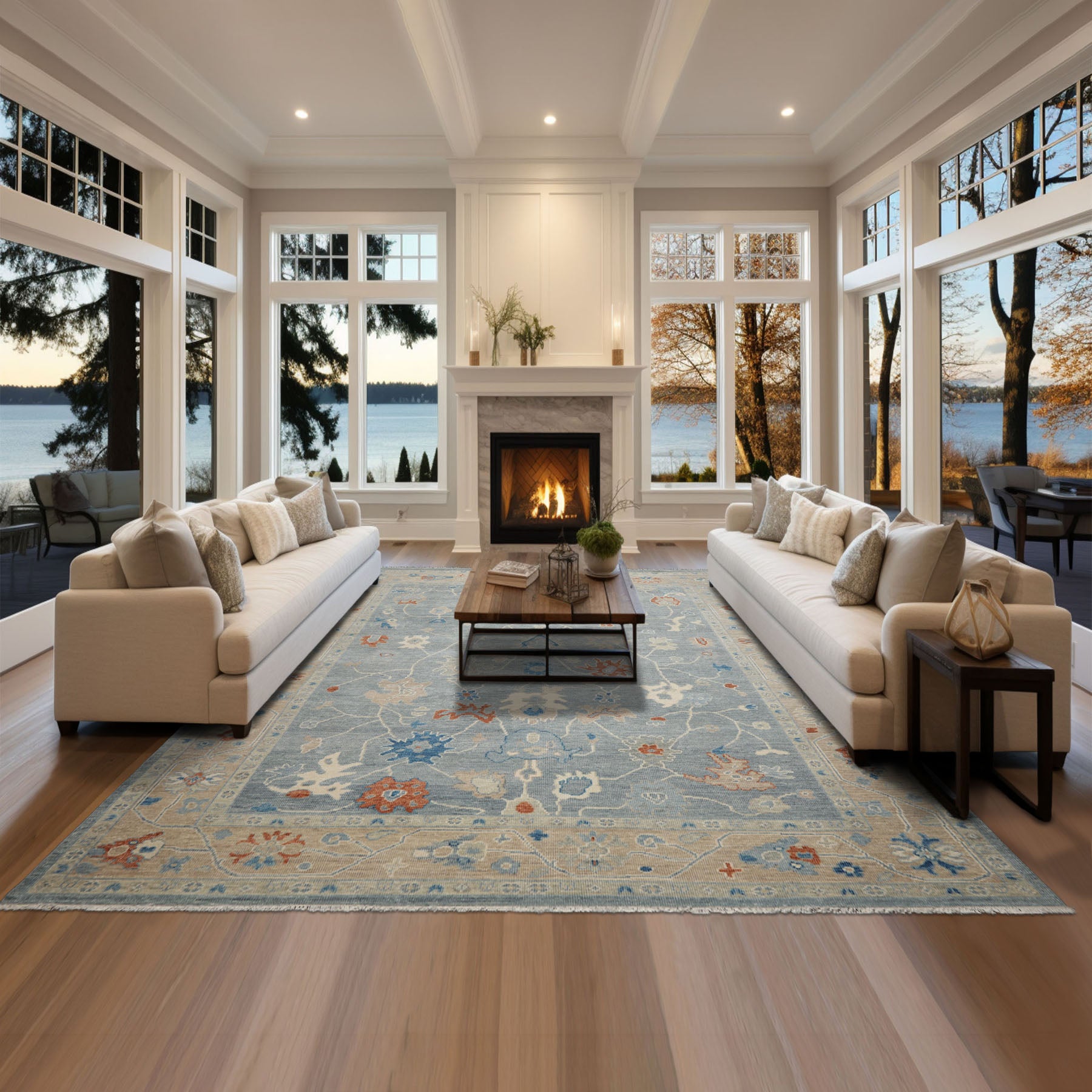 This expertly crafted LoomBloom hand-knotted Oushak rug from India blends old-world Turkish weaving heritage with a fresh, design-forward appeal tailored for today’s U.S. interiors. Made from premium wool, it features a refined Arts & Crafts palette of soft blue, taupe, ivory, burnt orange, navy, gray, and moss—colors prized in transitional and modern home décor. The light blue field carries open floral and vine motifs that create a calm, airy aesthetic, while the taupe-and-ivory border provides subtle framing without visual weight. With its low 0.3-inch textured pile, this rug delivers durability and a polished feel ideal for commercial environments, high-traffic homes, hospitality spaces, boutique offices, and contemporary living areas. Its understated elegance and balanced color story make it a versatile designer rug that enhances a wide range of interior styles.