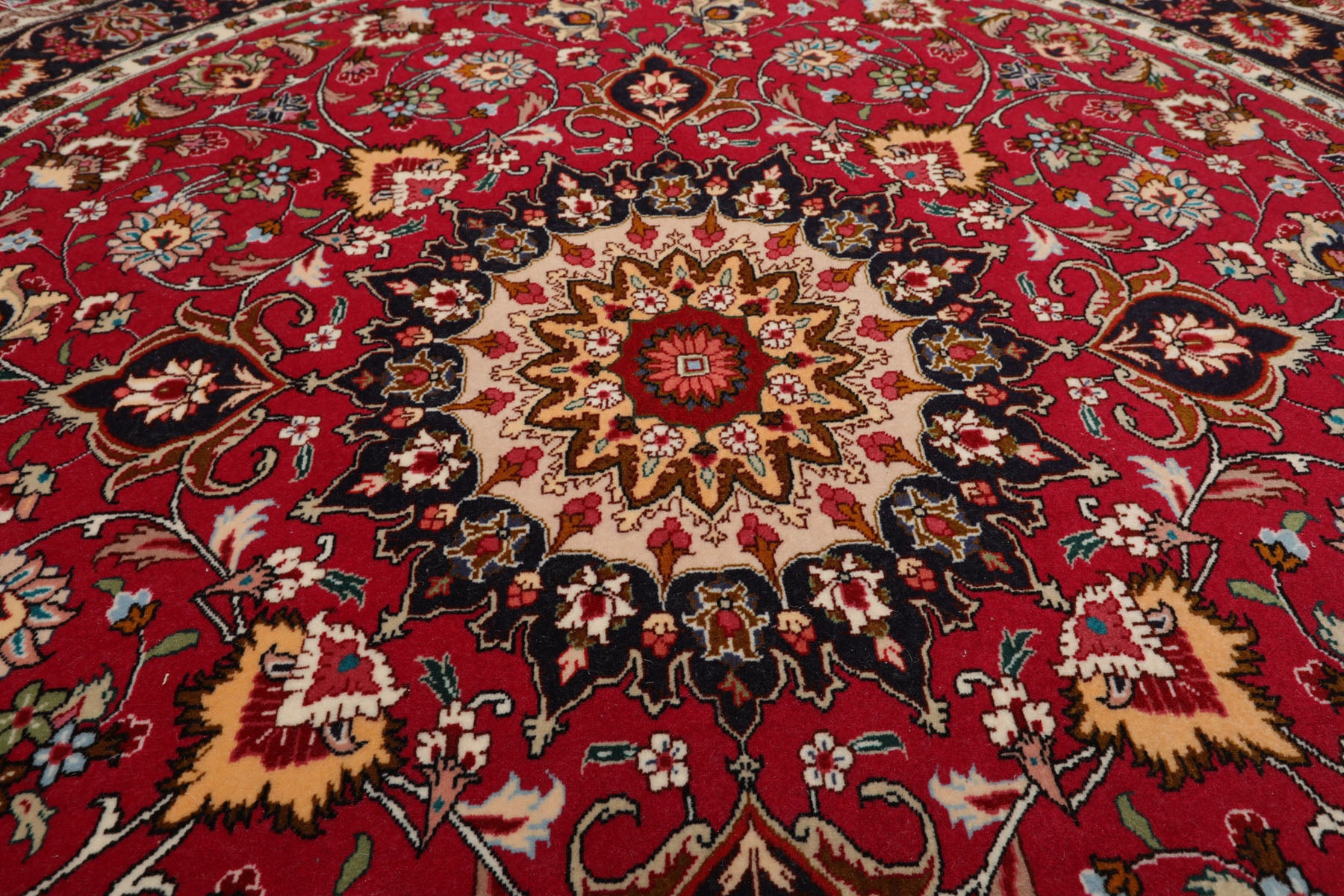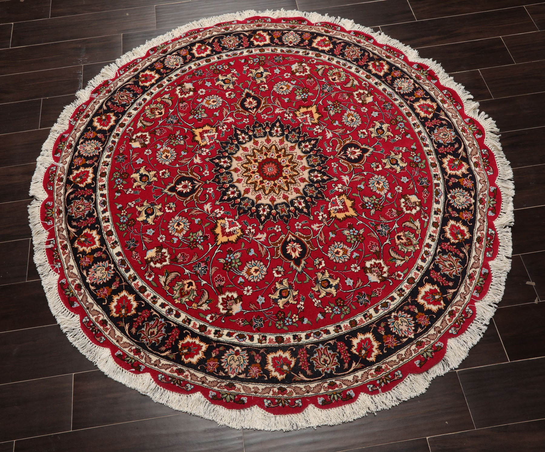 Round Burgundy, Black, Ivory Color Hand Knotted Tabriz Round Wool & Silk Traditional Oriental Rug