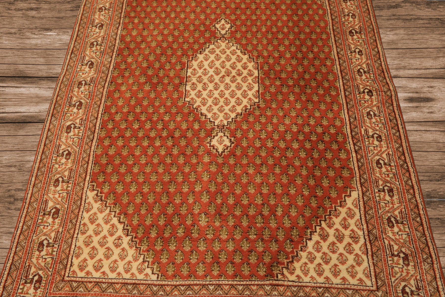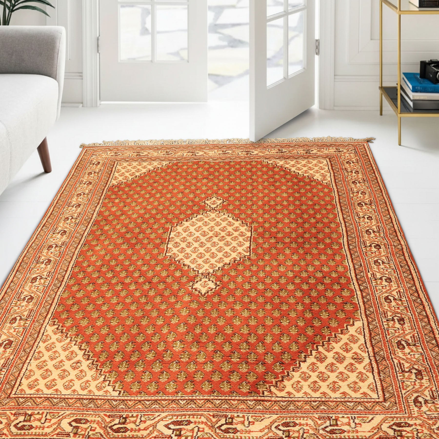 This burnt orange wool rug showcases a repeating boteh paisley pattern symbolizing movement and tradition. Accents of ivory, lime, and brown add contrast. Stepped borders give structure. High wool pile enhances color richness and comfort.
