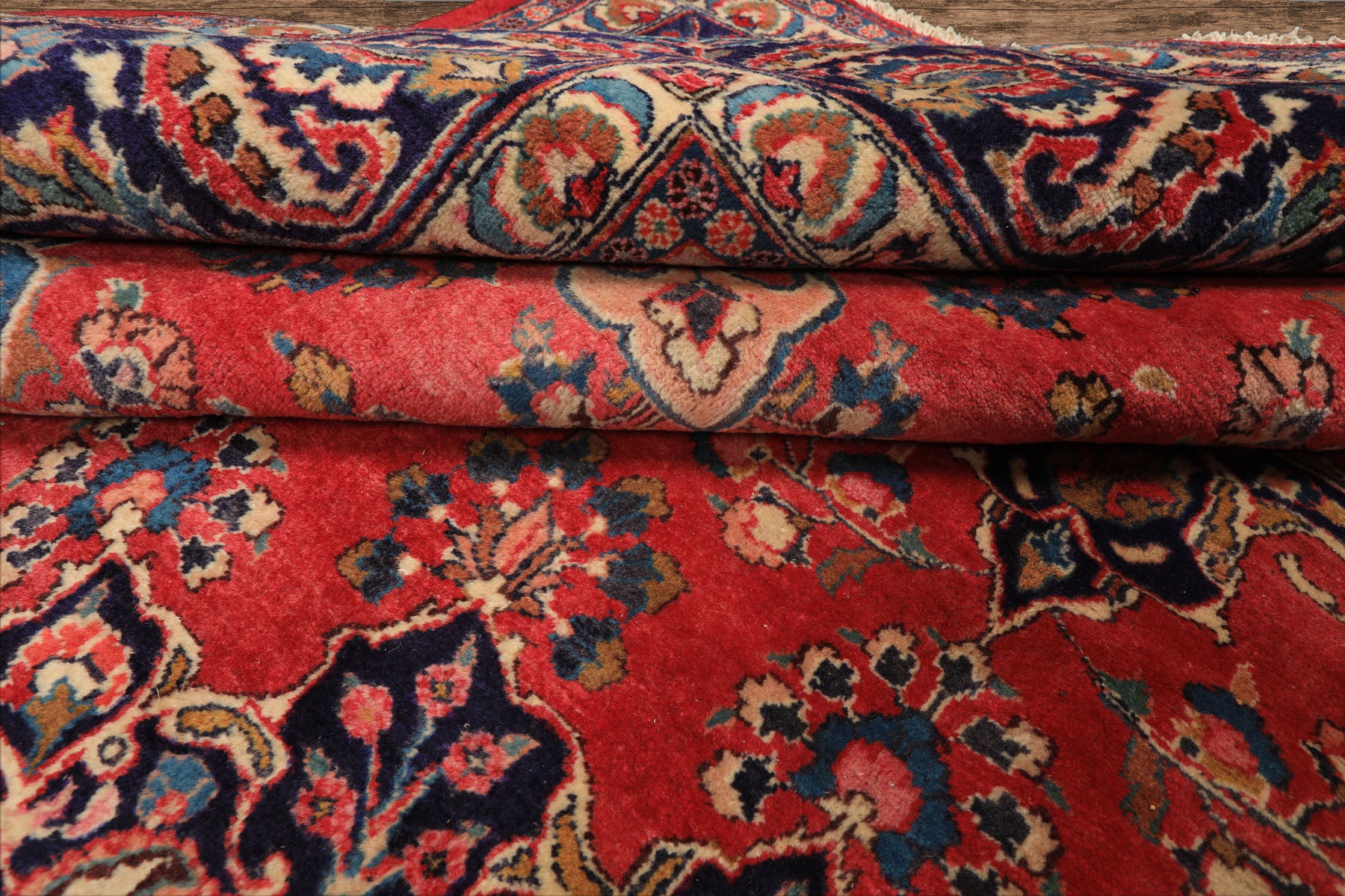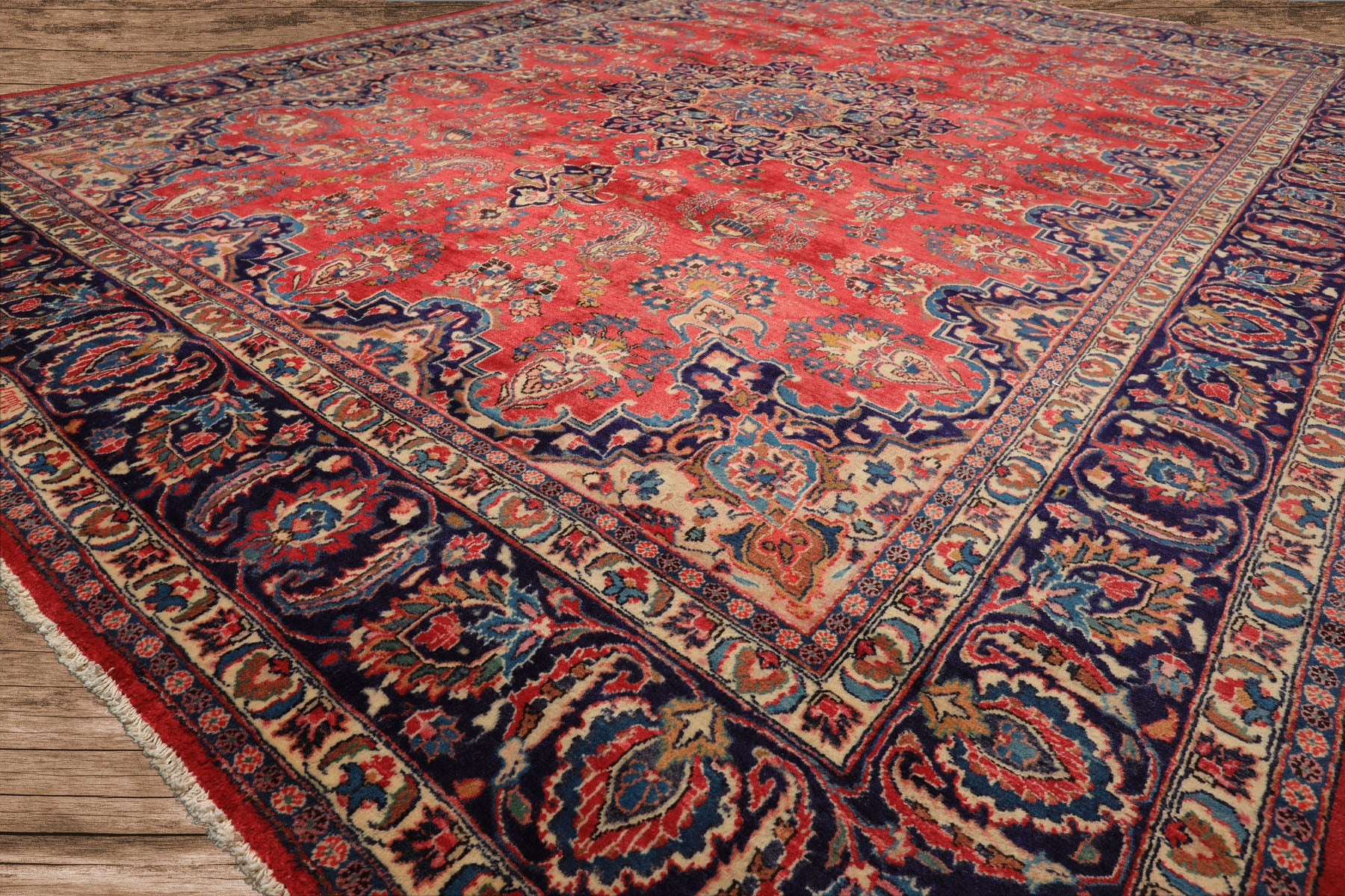 9x12 Coral, Navy, Ivory Color Hand Knotted Kashan Wool Traditional Oriental Rug