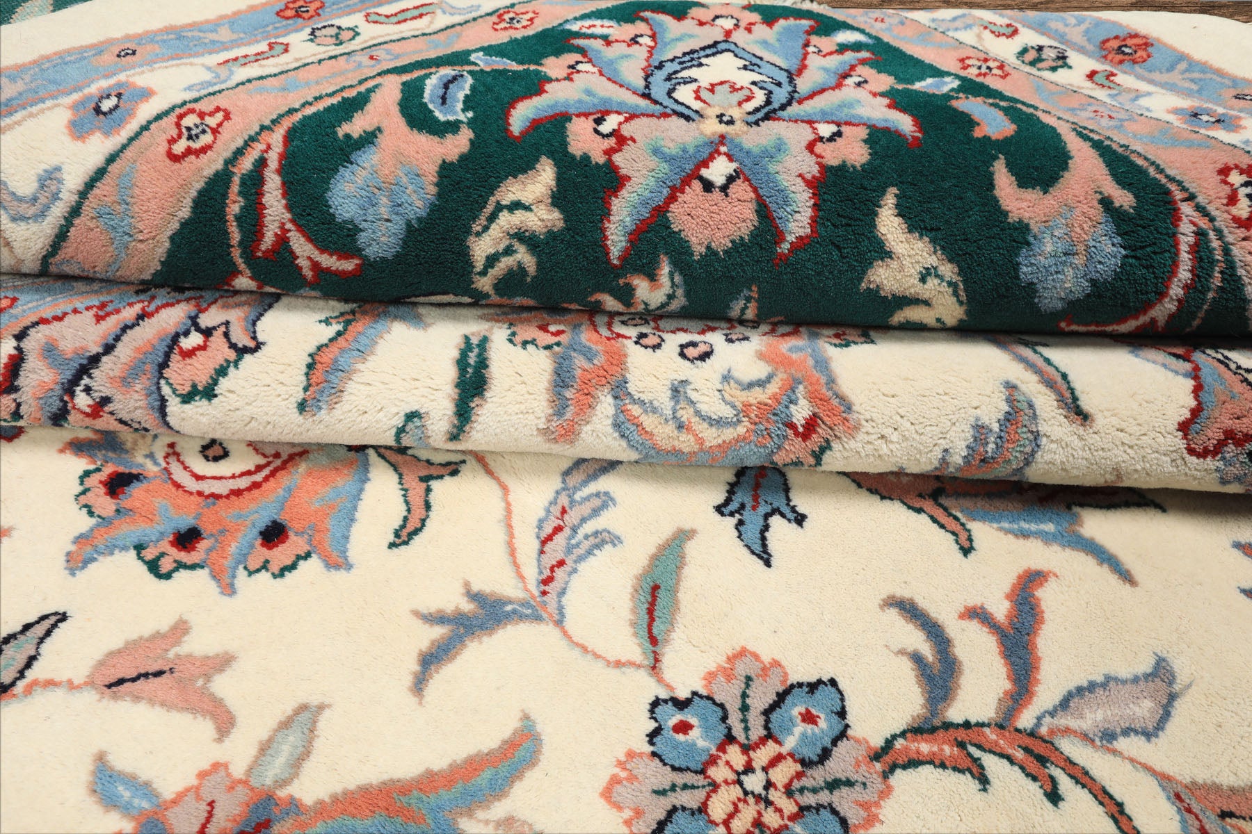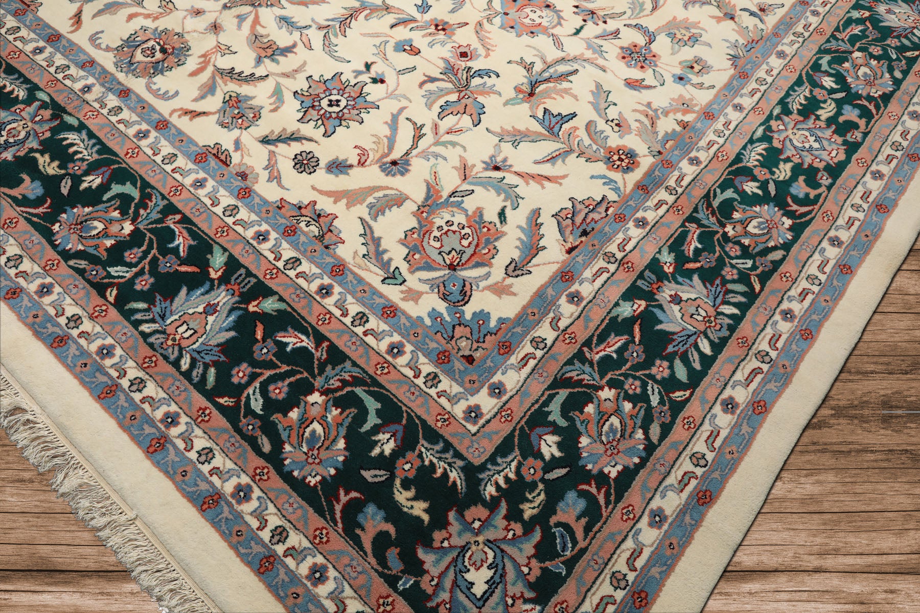 A masterpiece of Persian botanical design, this 12x15 Kashan wool rug radiates elegance and heritage. Hand-knotted with fine wool on a strong cotton foundation, its cream field blossoms with blush, blue, taupe, and red floral motifs, bordered by emerald green accents. The 0.75-inch high pile provides lush softness, ideal for large living rooms, formal dining areas, or open foyers. Combining Persian weaving tradition with rich, airy tones, this luxury hand-knotted Kashan rug adds light, texture, and timeless sophistication to spacious interiors.