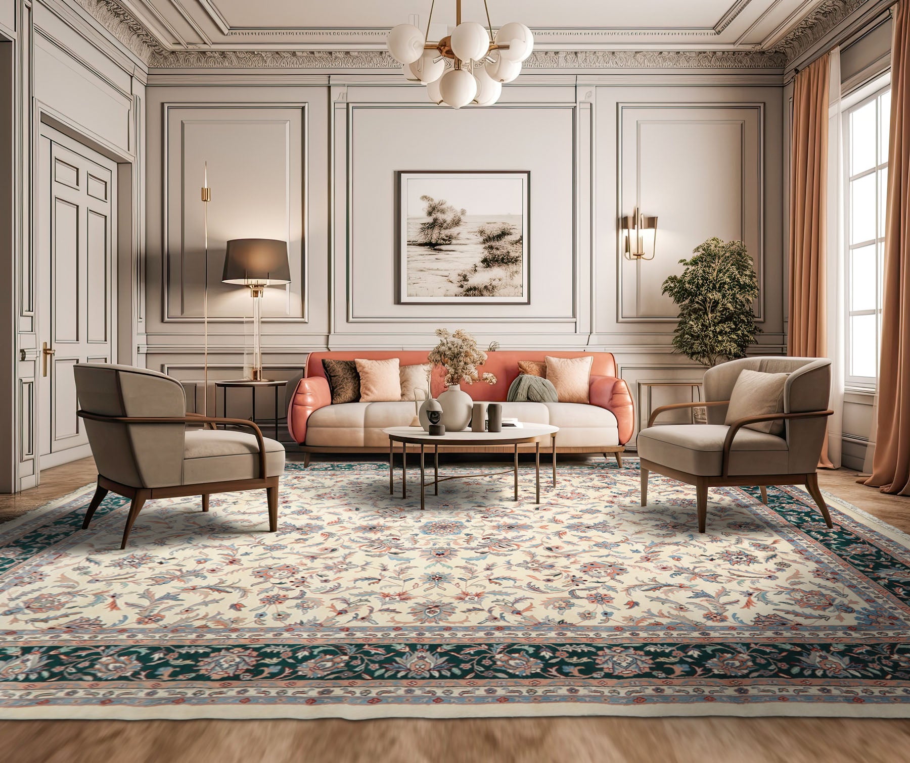 Story Behind the Art: Kashan rugs, among the most distinguished Persian designs, derive their name from the historic city of Kashan, Iran. Renowned for their fine knot density and exquisite floral ornamentation, these rugs feature arabesques, rosettes, palmettes, and flowing vines arranged around a central medallion with corner spandrels. Woven on cotton or silk foundations, they display a dense composition of blossoms and scrolling leaves that symbolize life and continuity. During the 16th century, the art of Kashan weaving spread to India and Pakistan, where artisans refined the tradition even further. Today, Kashan-style rugs remain symbols of precision, harmony, and timeless Persian craftsmanship.