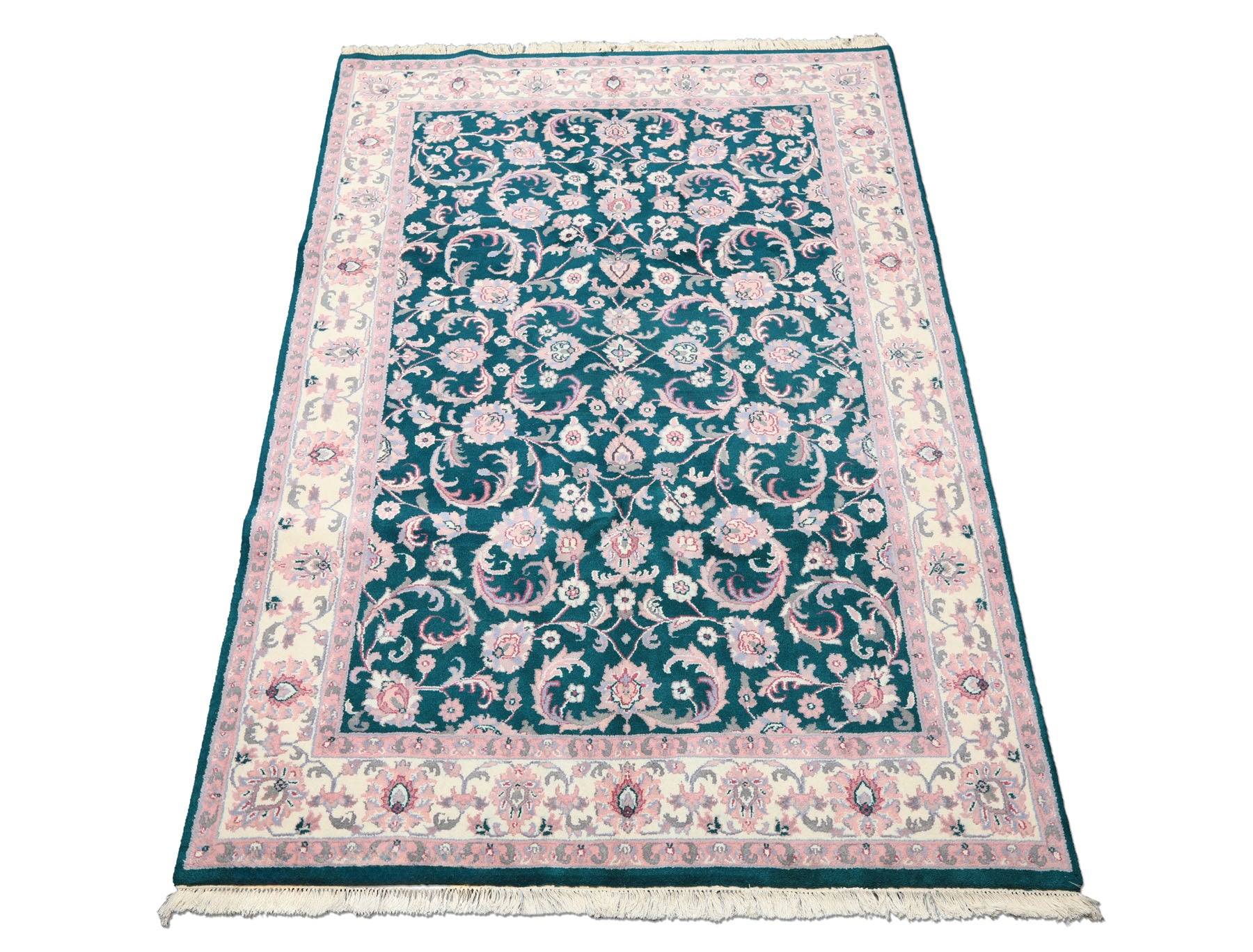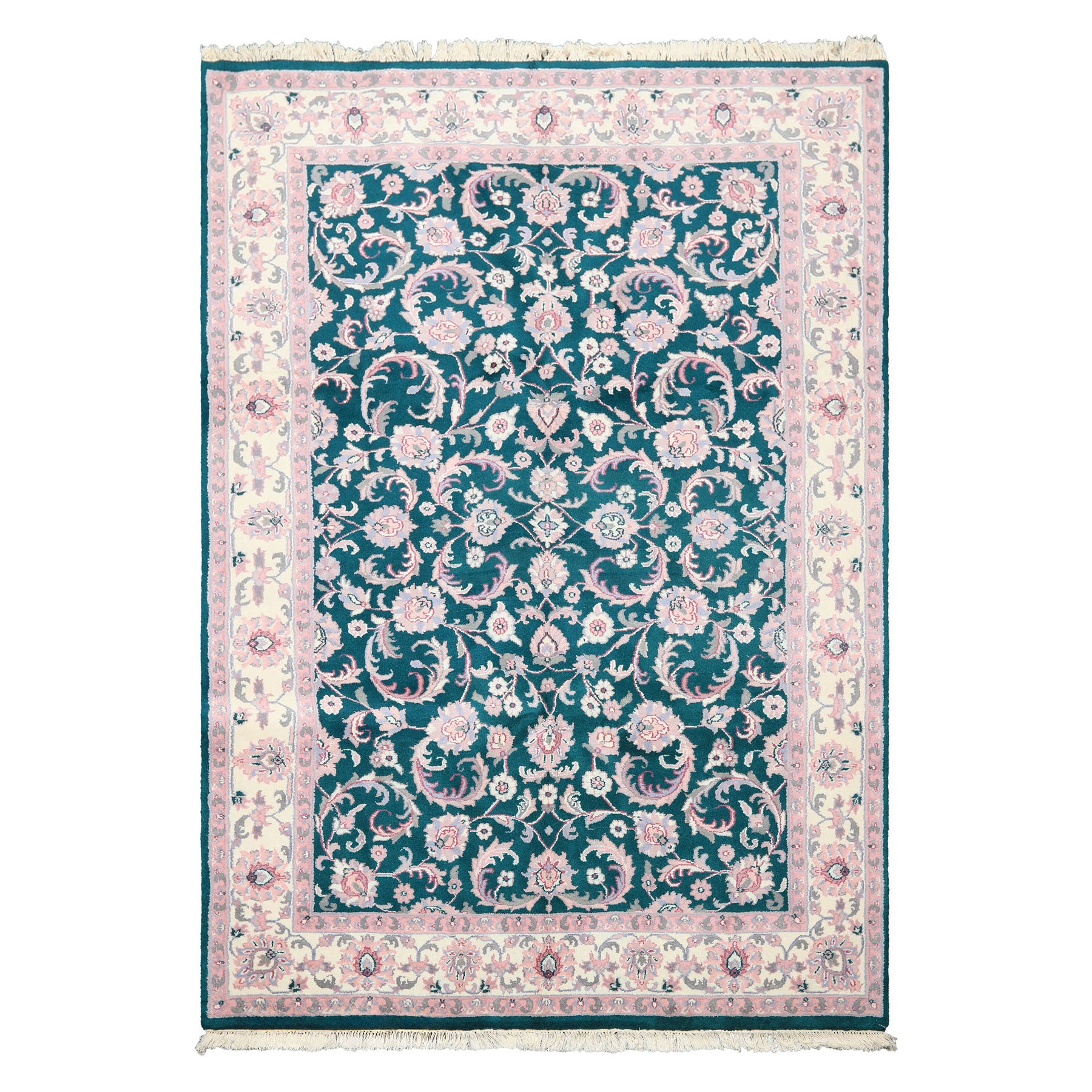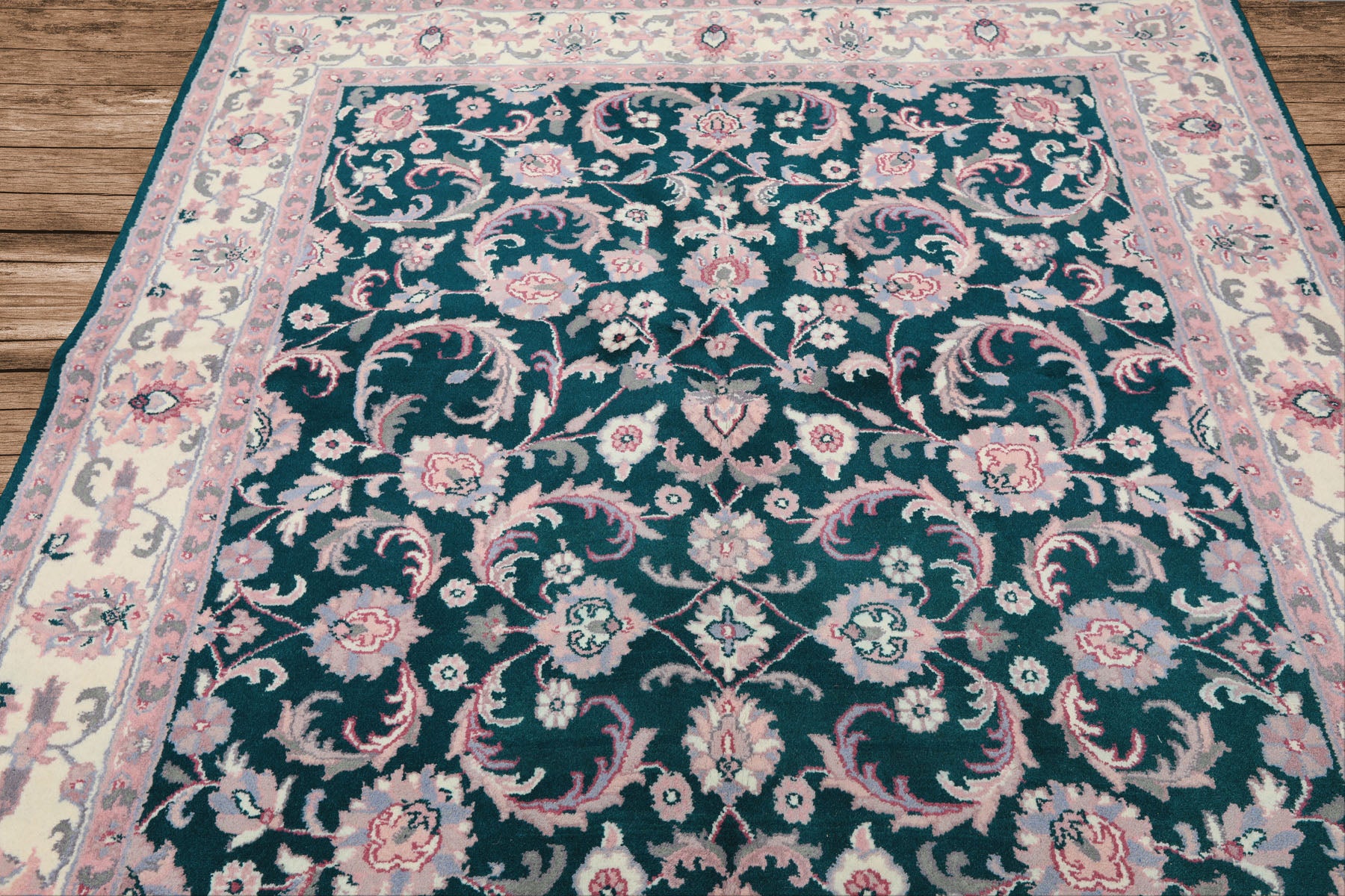 6x9 Emerald, Ivory, Pink Color Hand Knotted Indo Kashan Wool Traditional Oriental Rug
