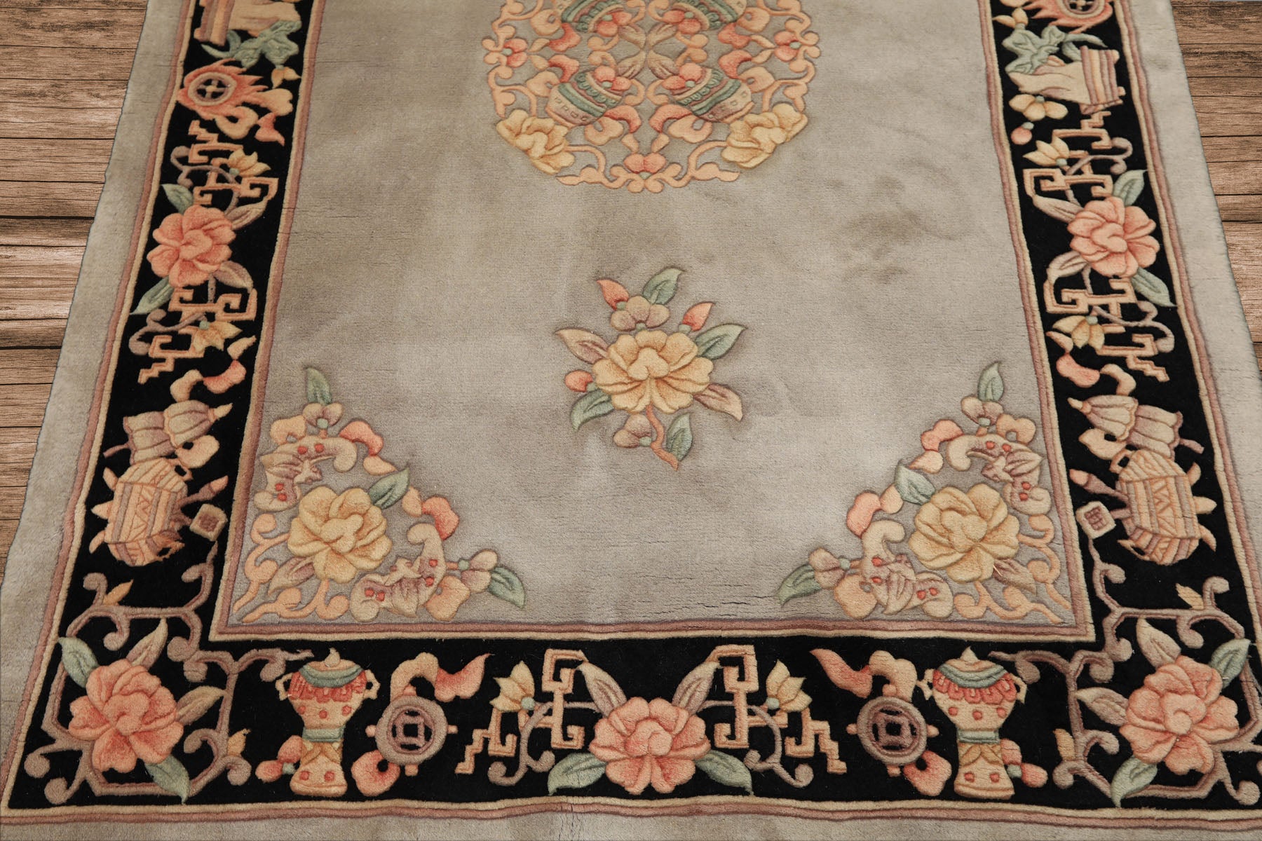 The contrasting black border, embellished with ornate florals and classical decorative emblems, frames the composition with elegant definition while enhancing the clarity of the pastel interior palette. Dense and velvety underfoot, this rug brings both comfort and visual sophistication, making it ideal for bedrooms, dressing areas, reading lounges, or interiors seeking a touch of European heritage softened by contemporary tones. Perfect for U.S. shoppers looking for Aubusson–Savonnerie rugs, plush botanical wool rugs, or French-inspired luxury décor pieces.