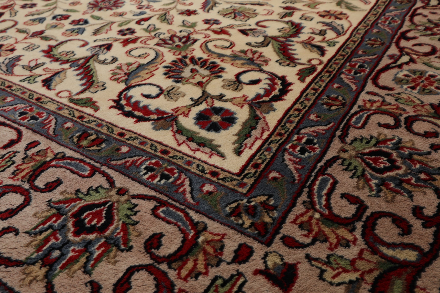 Classic Indian craftsmanship meets modern comfort in this hand-knotted Agra rug, where an ivory field hosts intricate vine and floral motifs rendered in taupe, red, sage, black, blue, and rose. Crafted from premium New Zealand wool, its dense 0.75" plus pile offers a velvet-soft touch and enduring durability. Perfect for living rooms, dining areas, or bedrooms, this traditional Agra area rug adds timeless elegance, warmth, and refined detail to any interior seeking richness without overpowering the space.