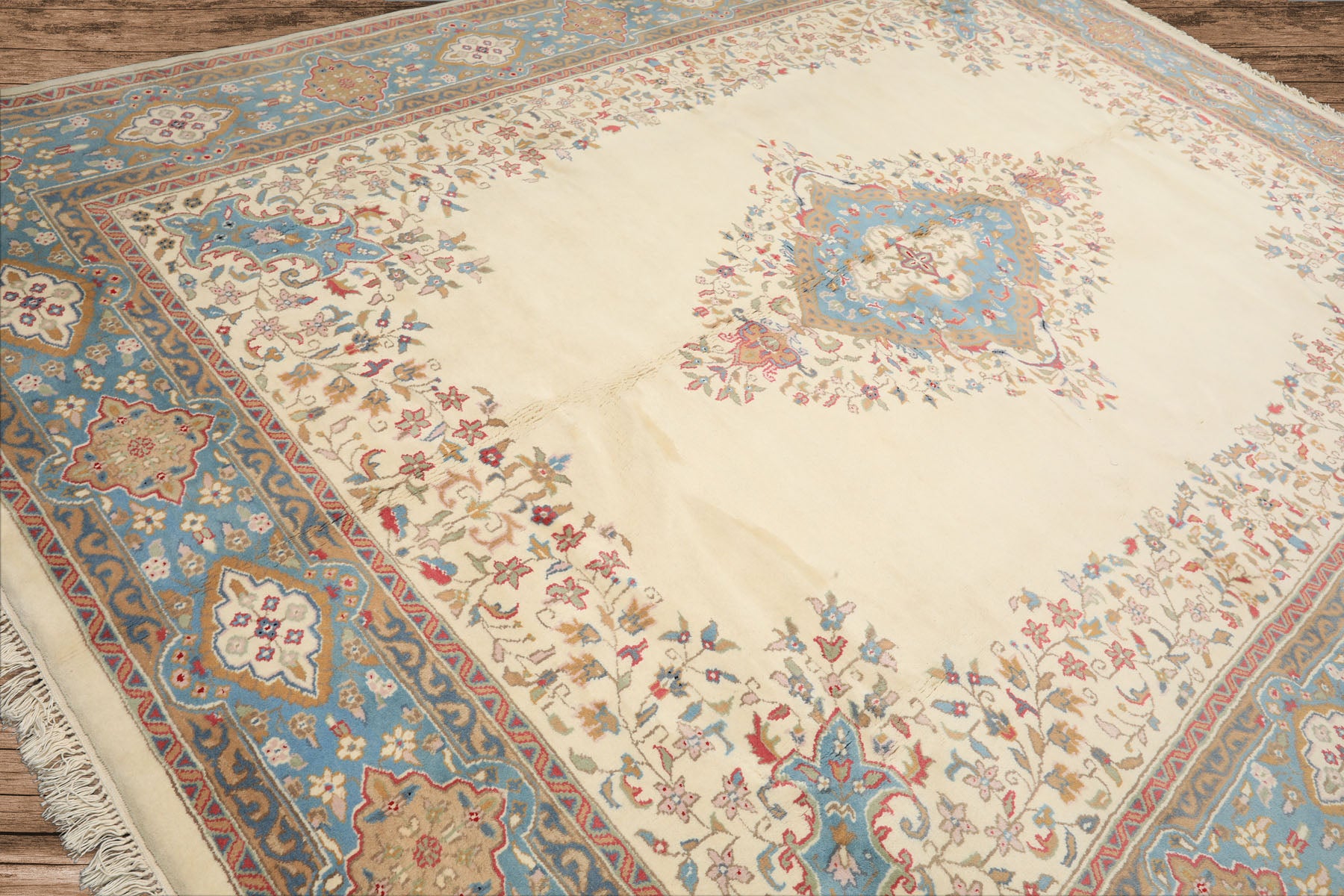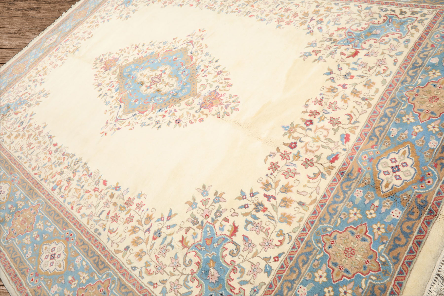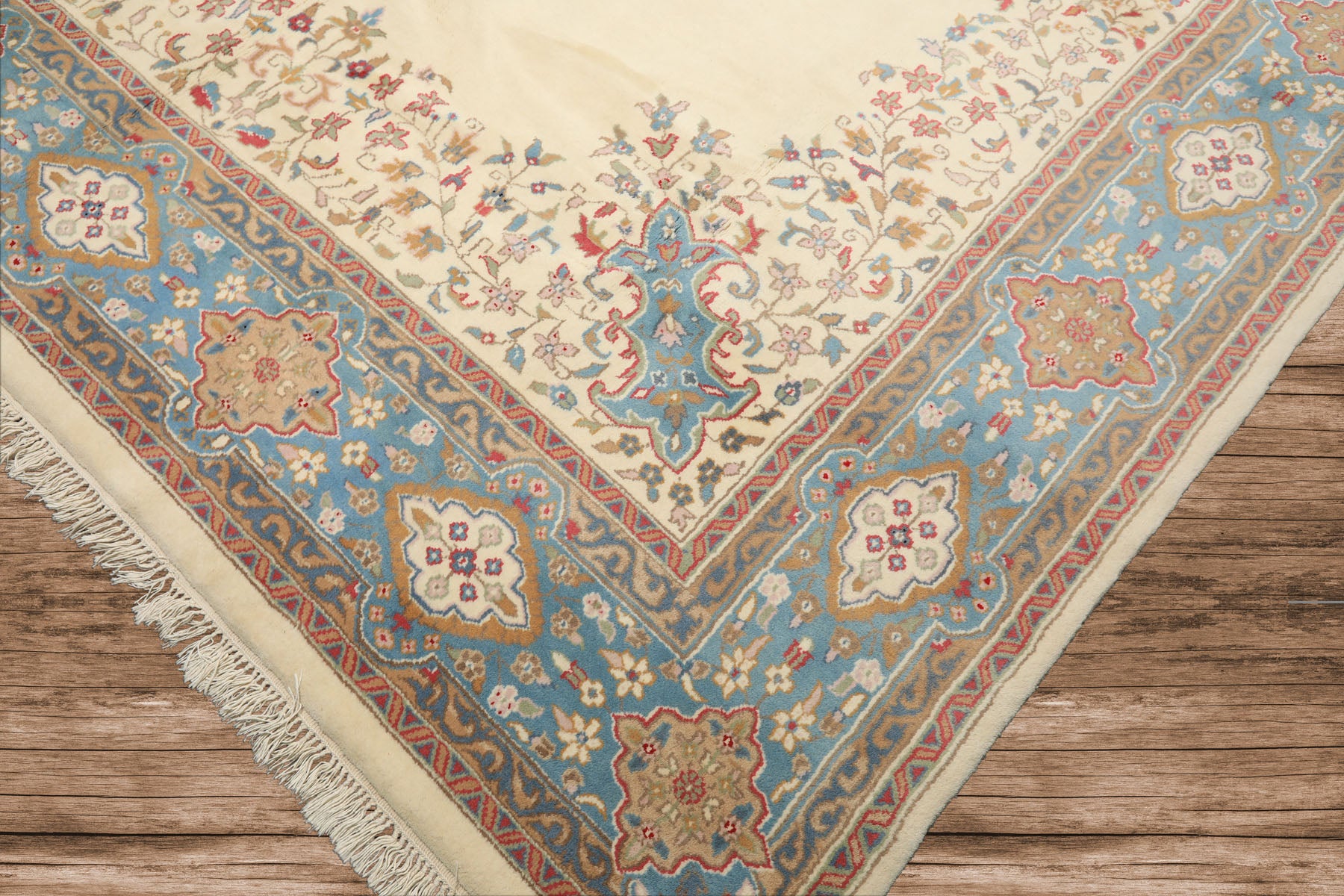 Evoking the grandeur of classic Persian craftsmanship, this 9x12 ft hand-knotted Kerman rug brings refined artistry and graceful symmetry to life. Crafted with a luxurious 1.00-inch high pile on a sturdy cotton base, it offers a plush surface that enhances both comfort and durability. The medallion design—ornamented with intricate floral details in blue, beige, blush, and aqua—captures the harmony of the Kerman weaving tradition, celebrated for its elegant geometry and nuanced shading. Ideal for living rooms or formal lounges, this Persian-style Kerman rug provides a rich focal point for refined interiors. Each knot reflects precision and patience, resulting in a masterpiece that balances timeless beauty with exceptional craftsmanship.