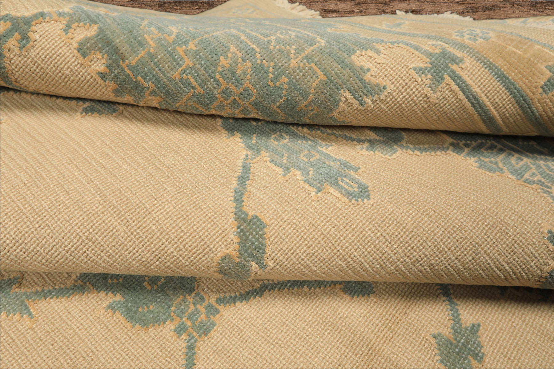 The ivory, aqua, and light gold palette enhances its transitional floral and geometric pattern, creating a serene composition that bridges classic and contemporary design. With its 0.25-inch sleek pile height, the rug maintains a refined, smooth surface ideal for living rooms, dining spaces, or formal studies.