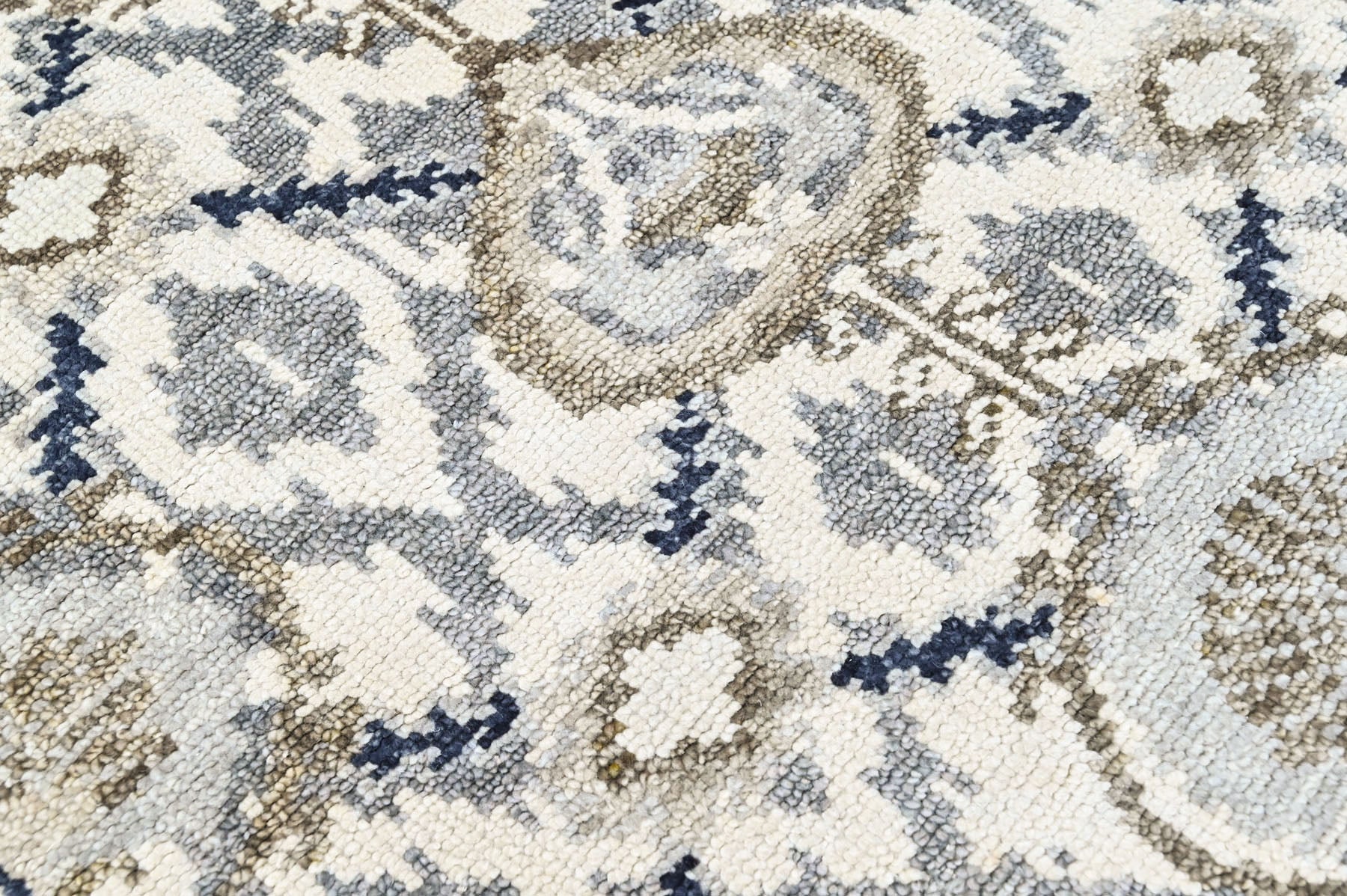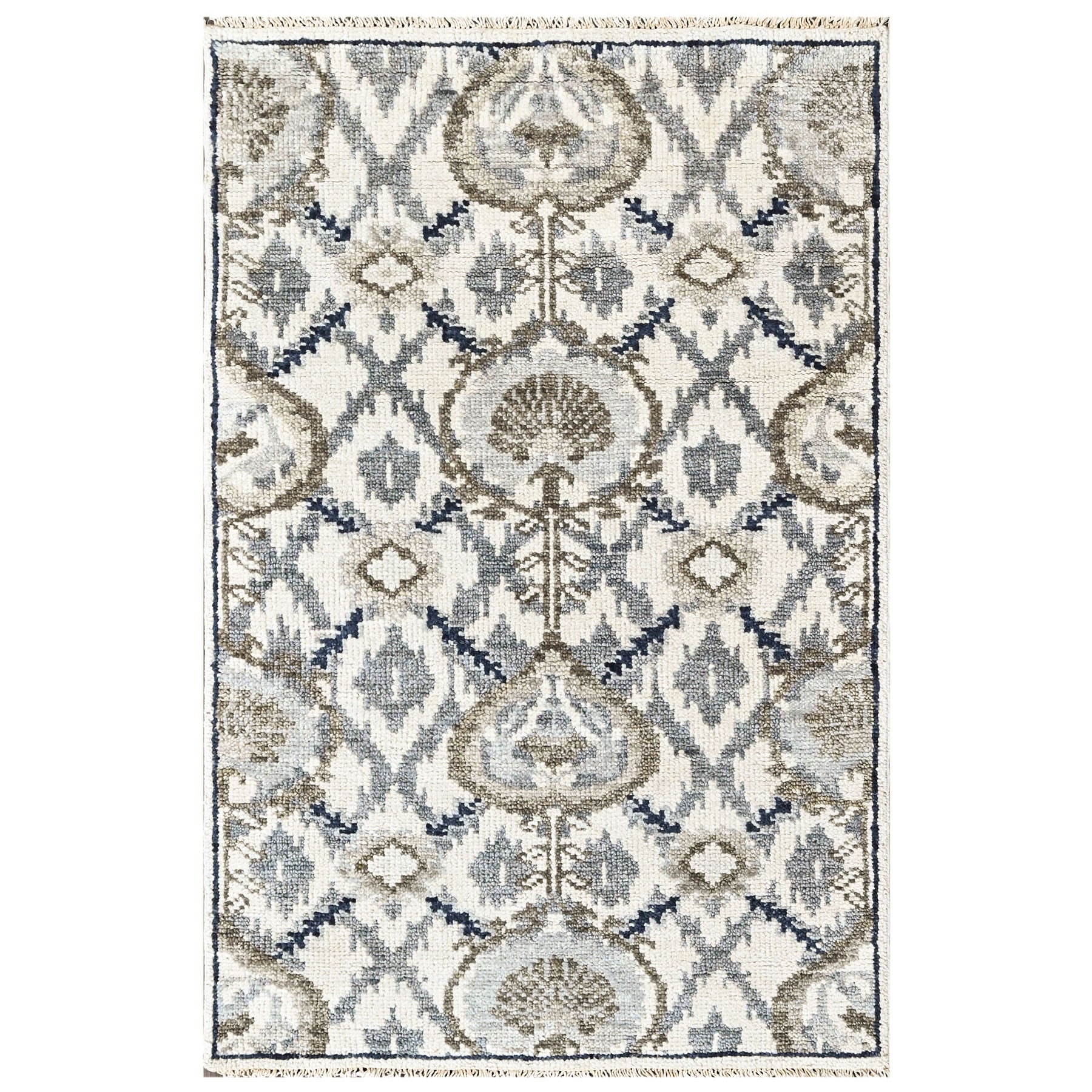 This hand-knotted wool transitional rug features a repeating lattice of medallion and diamond shapes, accented by small geometric details. The ivory, beige, gray, and muted blue palette reads softly layered, allowing the pattern to emerge gradually. Perfect for bedrooms, nooks, entryways, and compact interiors, it fits U.S. demand for neutral transitional rugs with timeless appeal.