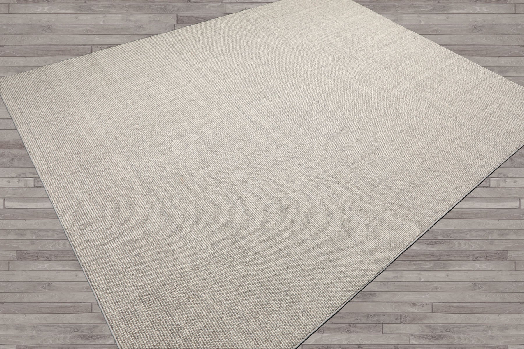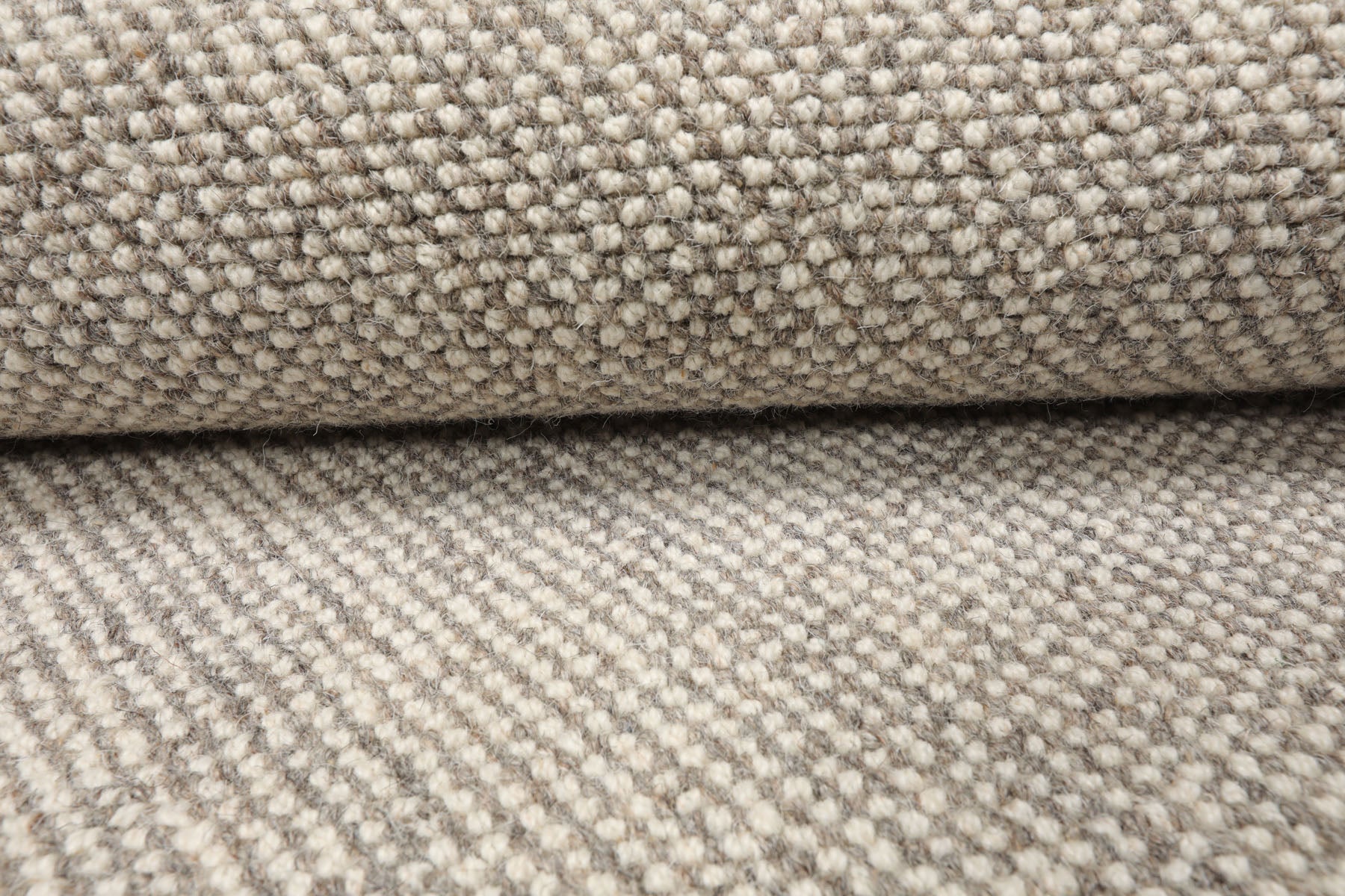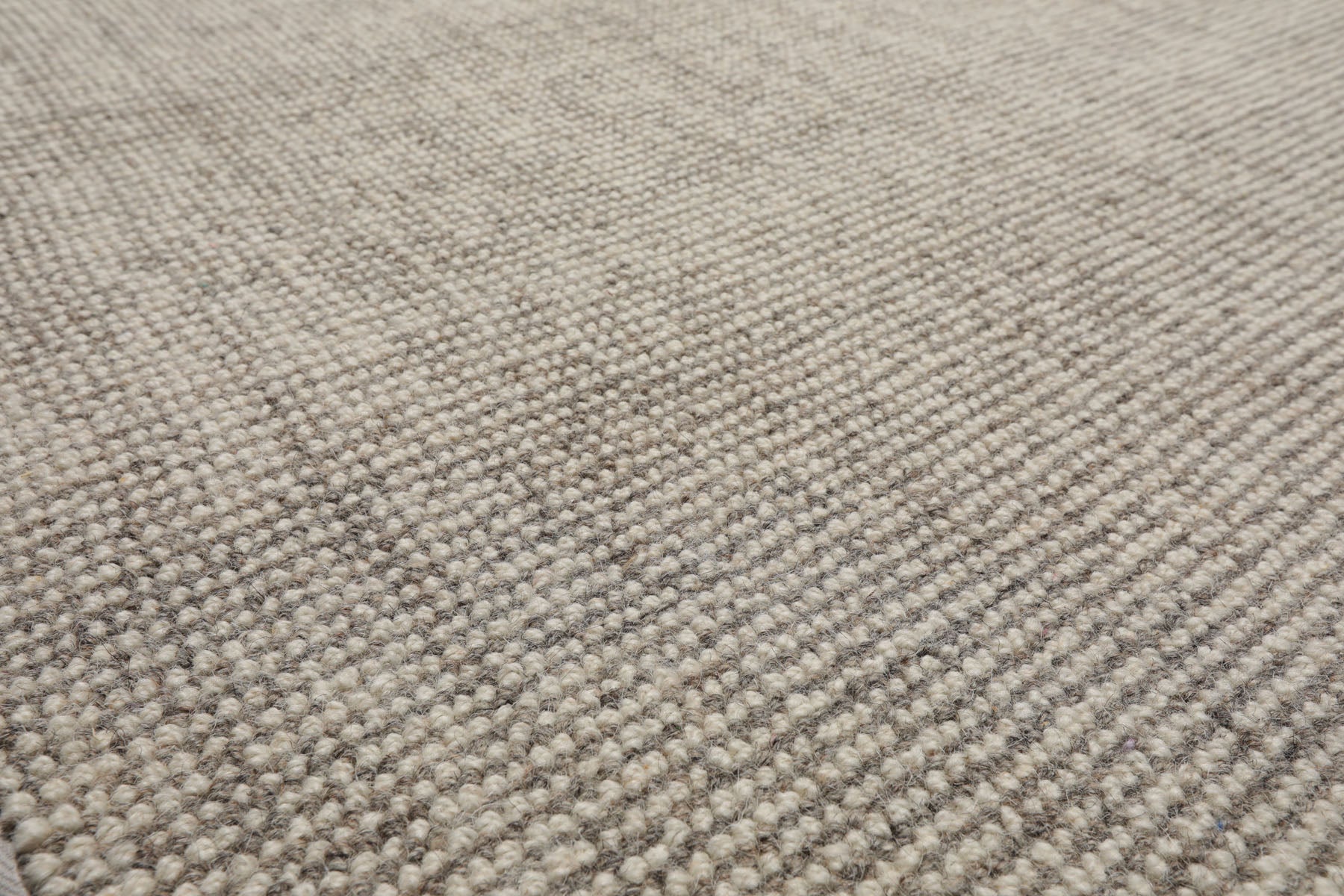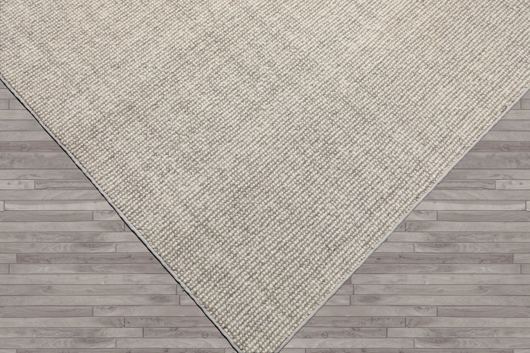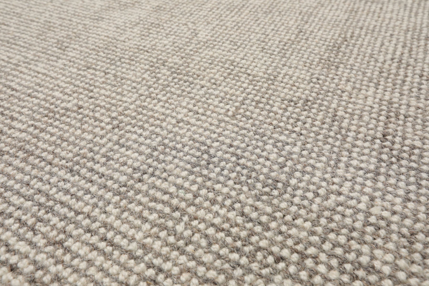 The ash gray Designer Textures Berber rug from India is crafted from 100% New Zealand wool, showcasing soft natural elegance with its intricately woven loops. The blend of ivory and gray tones makes this rug versatile enough to suit any decor style. The looped texture adds depth and dimension, providing a subtle pattern that enhances its visual appeal. Its loop pile construction offers a durable yet cushioned feel, making it comfortable underfoot and highly resilient. Designed for high-traffic areas, this dense Berber rug delivers both style and functionality with no shedding.