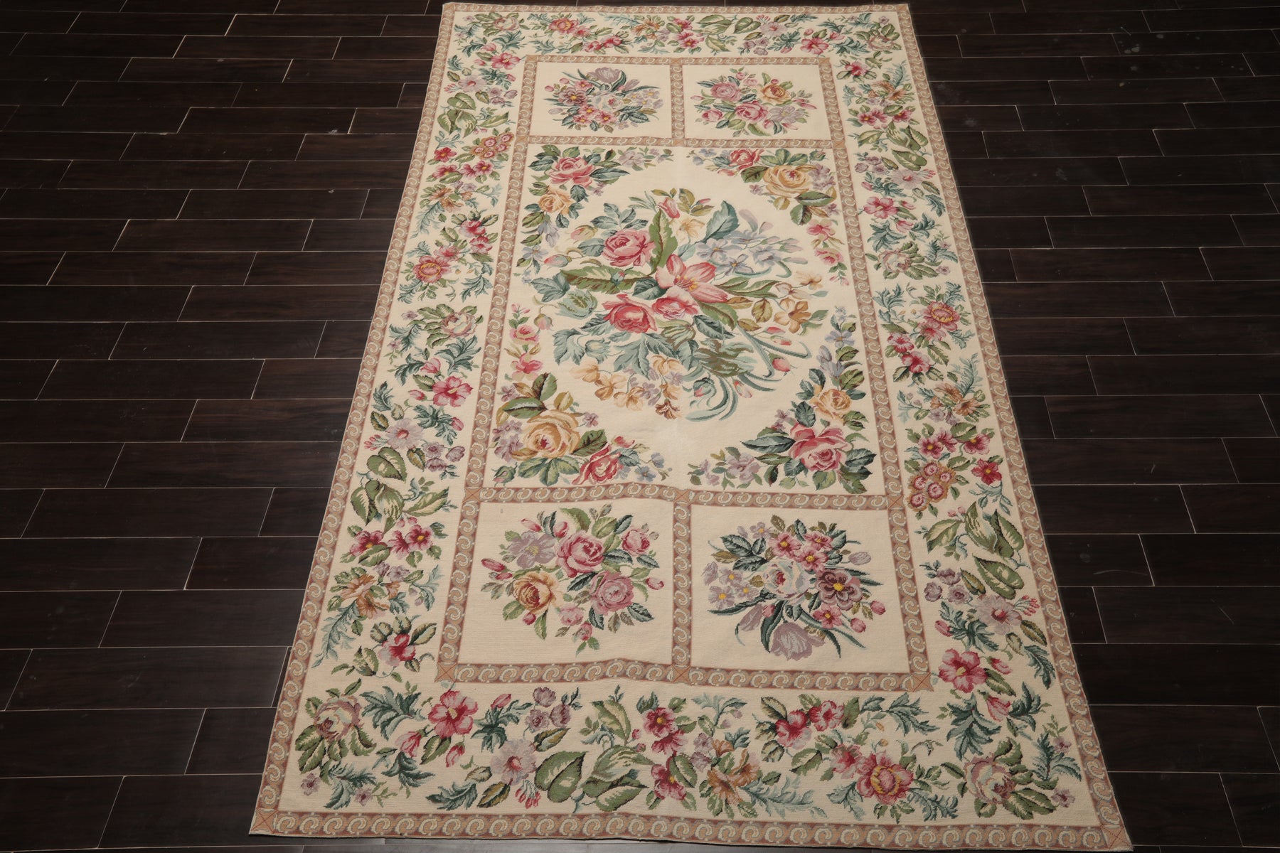 6x10 Ivory, Aqua, Rose Color Hand Woven Aubusson Needlepoint Wool Traditional Oriental Rug