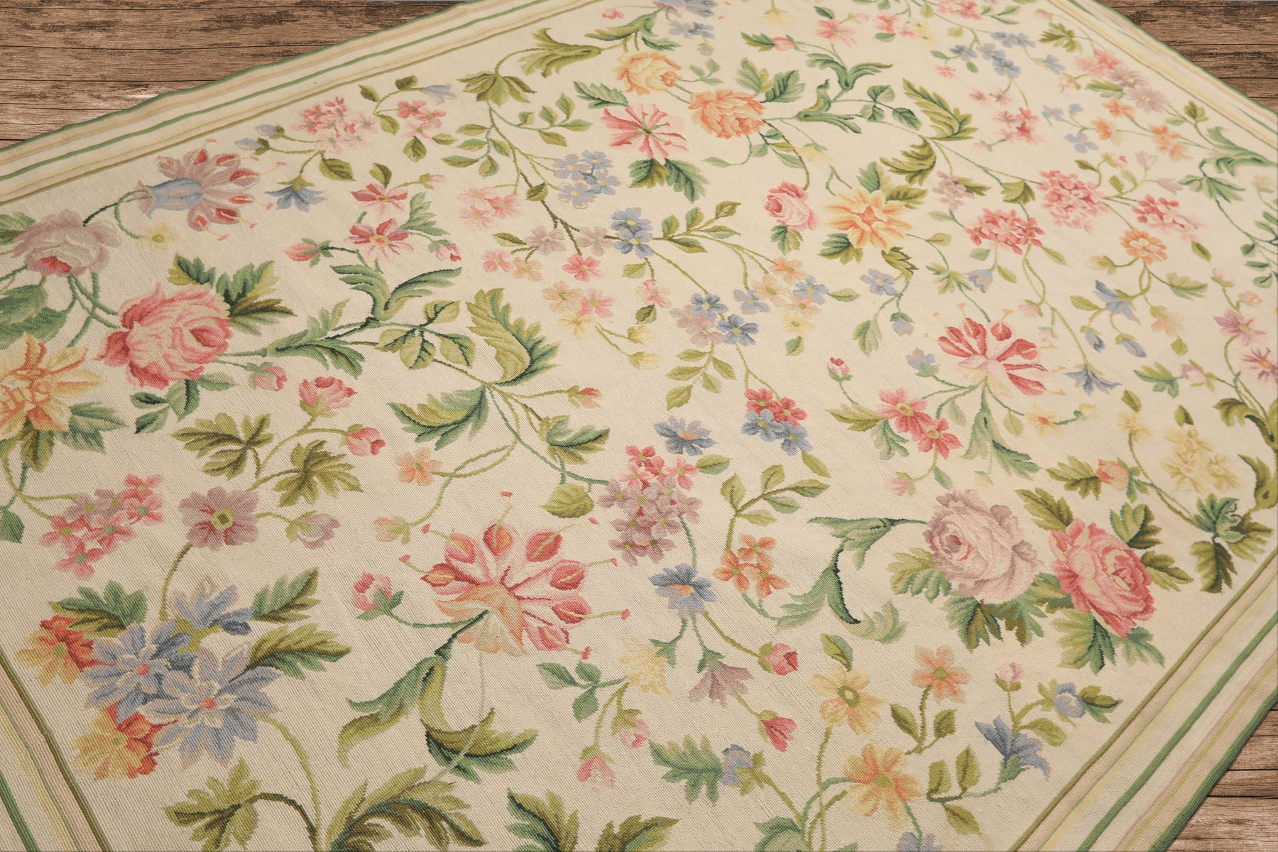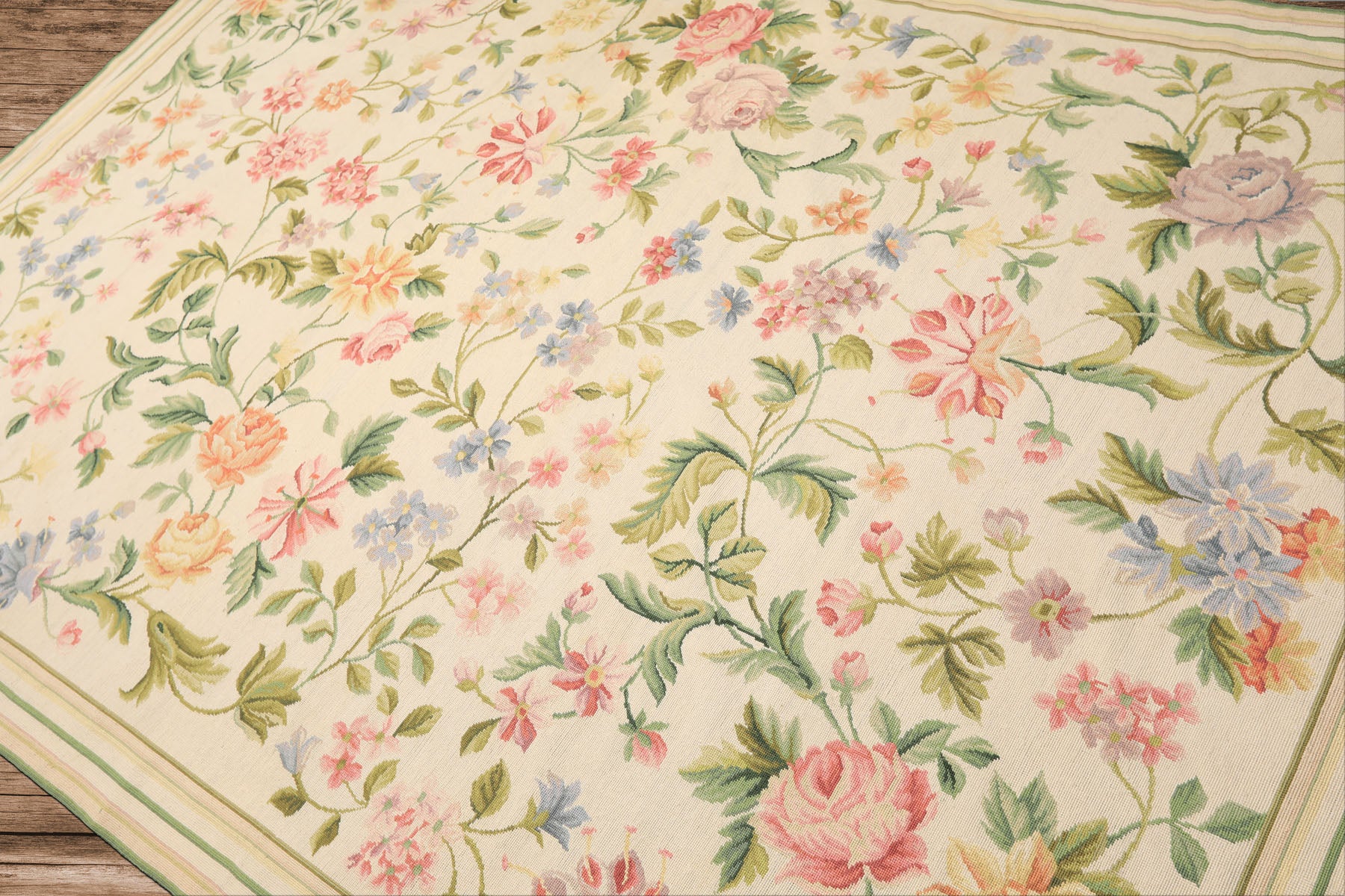 A refined tribute to French textile tradition, this hand-woven needlepoint Aubusson rug captures Old World romance with a luminous ivory field blooming with an elegant garden of roses, peonies, and delicate blossoms in soft pink, blue, and peach. Flowing floral vines drift across the wool surface in graceful, naturalistic movement, forming a gentle botanical tapestry enriched by verdant green foliage and warm highlights of gold and orange that add depth and dimension. Woven by hand using traditional needlepoint techniques, this piece features the distinctive flatweave construction Aubusson rugs are known for—delivering a polished, tailored look along with practical durability and an easy-to-place profile. The harmonious palette of ivory, pink, blue, and lime creates a serene foundation that suits many U.S. interior trends, from French country and classic traditional to transitional and shabby chic, making it an ideal match for shoppers searching Aubusson rug, needlepoint rug, French floral area rug, and ivory floral rug for living rooms, bedrooms, and formal spaces. Invite timeless European elegance into your home with this heirloom-style botanical treasure, crafted to deliver enduring beauty and refined character.