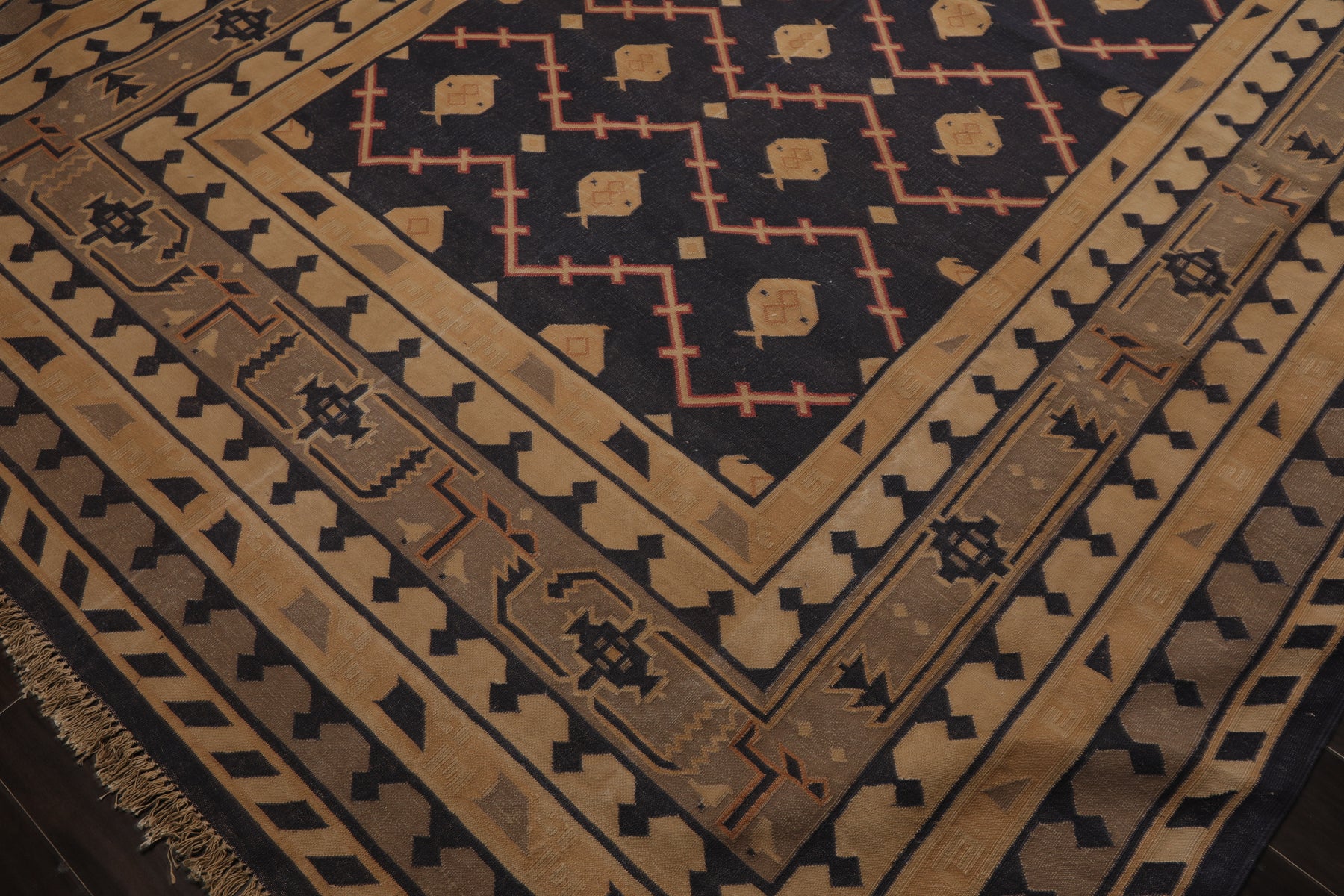 Woven in India, this wool Kilim features geometric and tribal motifs in navy, tan, beige, and rouge. Supported by a cotton foundation, the 0.1" flat profile is lightweight, decorative, and versatile—ideal for low to moderate traffic environments. Its bold contrast and tribal aesthetic make it a powerful accent for interiors ranging from eclectic and bohemian to classic and transitional.
