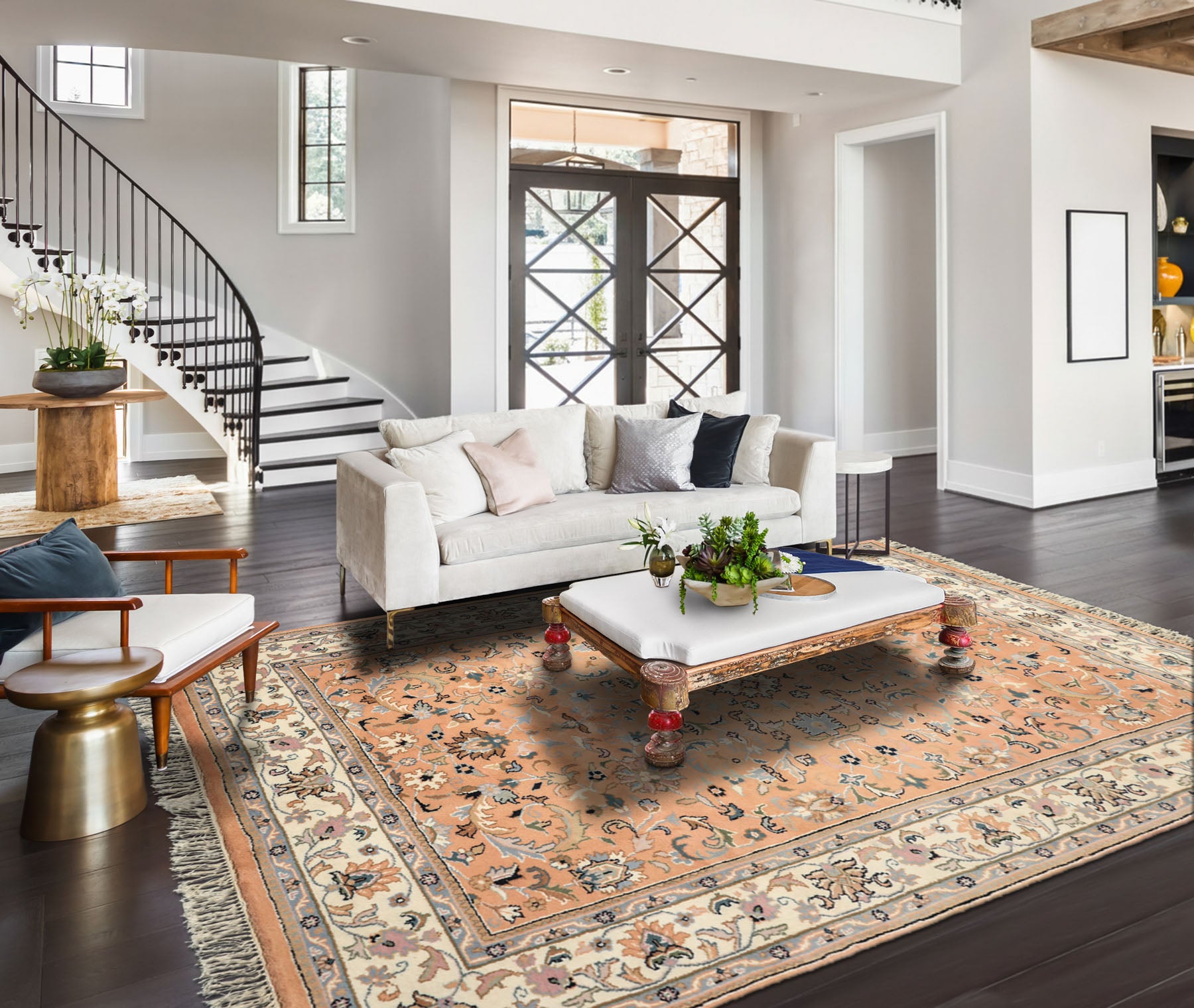 Story Behind the Art: Modern Indo-Kashan rugs are woven in India as faithful interpretations of historic Kashan carpets from Iran. Featuring medallion-centered or Shah Abbas all-over floral designs, these rugs are hand-knotted using wool piles on cotton foundations at 150–250 knots per square inch. Premium versions incorporate New Zealand wool and silk accents, adding sheen, texture, and depth valued in luxury wool area rugs.