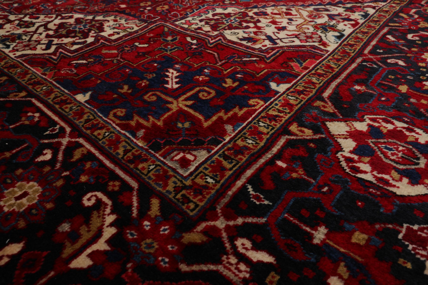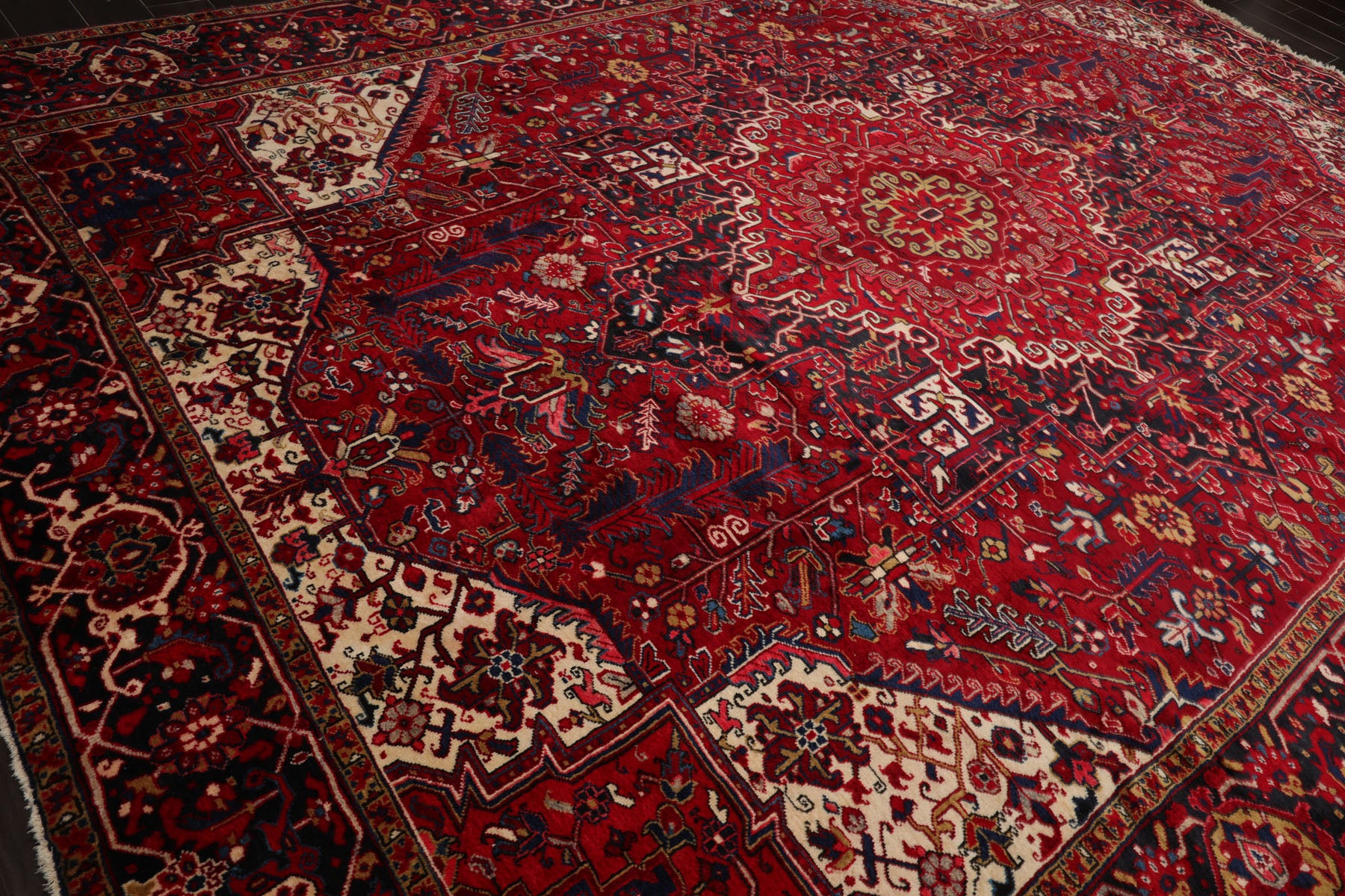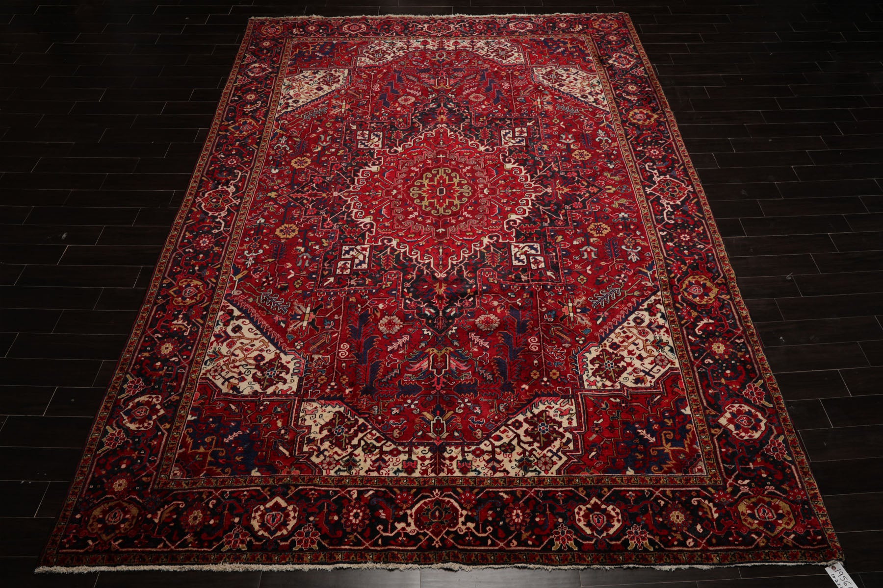 Story Behind the Art: Heriz rugs, woven in the mountainous region of northwestern Iran near Tabriz, are renowned for their bold artistry and exceptional durability. Gracefully crafted from robust local wool rich in natural lanolin, they possess a resilience that makes them ideally suited for generations of use. Their hallmark design is the striking angular medallion large, geometric, and commanding framed by stylized leaves and bold motifs that radiate across the field. Rendered in a palette of deep reds, indigos, ivory, and earthy tones, Heriz rugs convey a powerful, architectural presence. Valued for both their strength and their dramatic visual impact, they remain timeless symbols of Persian village weaving, equally admired as practical floor coverings and statement pieces in refined interiors.