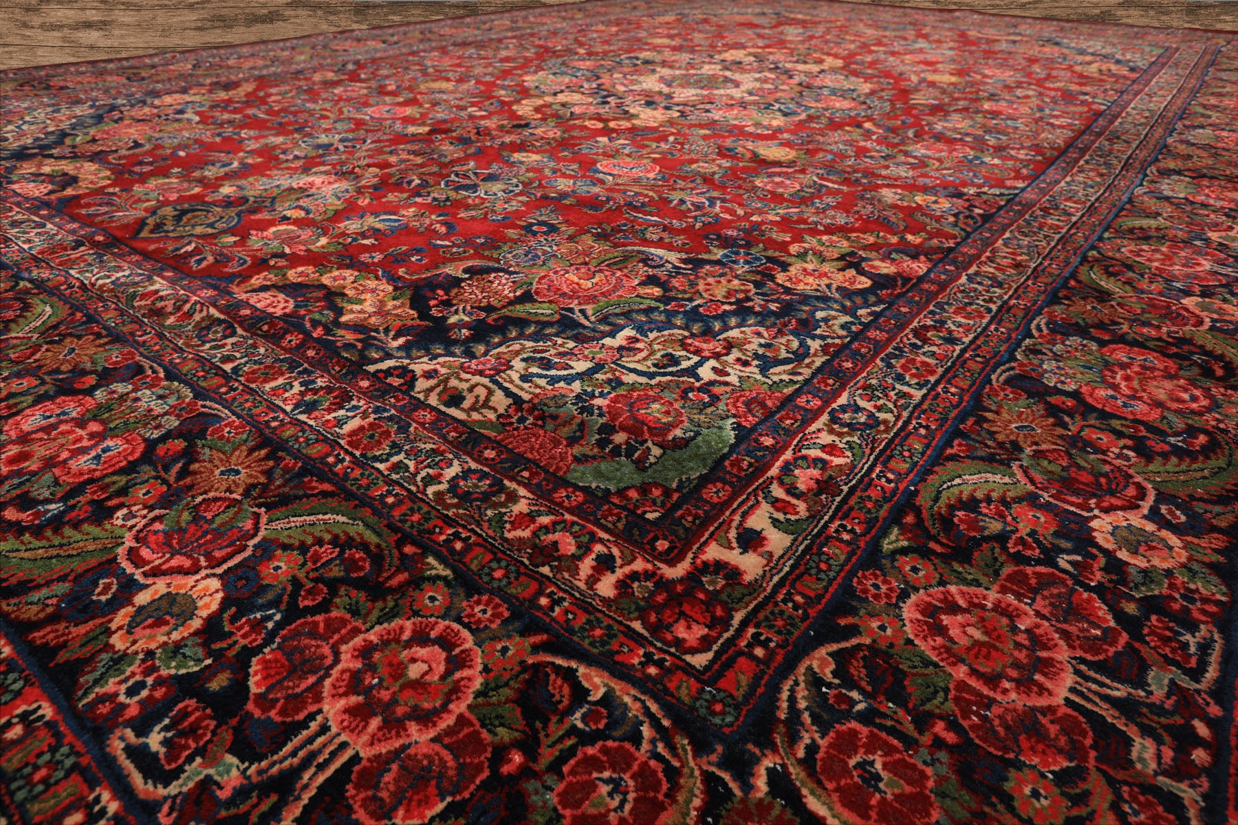 This 10x15 ft hand-knotted Persian Tabriz rug from Iran exemplifies heirloom-quality craftsmanship and artistic grandeur. Woven with premium wool on a durable cotton foundation, it features a 0.60-inch plush pile that combines luxurious comfort with intricate detailing. The elaborate central medallion pattern, framed by floral borders, radiates a rich palette of red, navy, ivory, gold, green, aqua, and pink, hallmark hues of traditional Tabriz artistry. Its precision knotting ensures symmetry and balance, embodying the heritage of authentic Persian rugs. Perfect for living rooms, dining areas, or grand studies, this vintage Tabriz rug blends timeless design, cultural prestige, and durability—a statement piece for refined interiors and collectors.