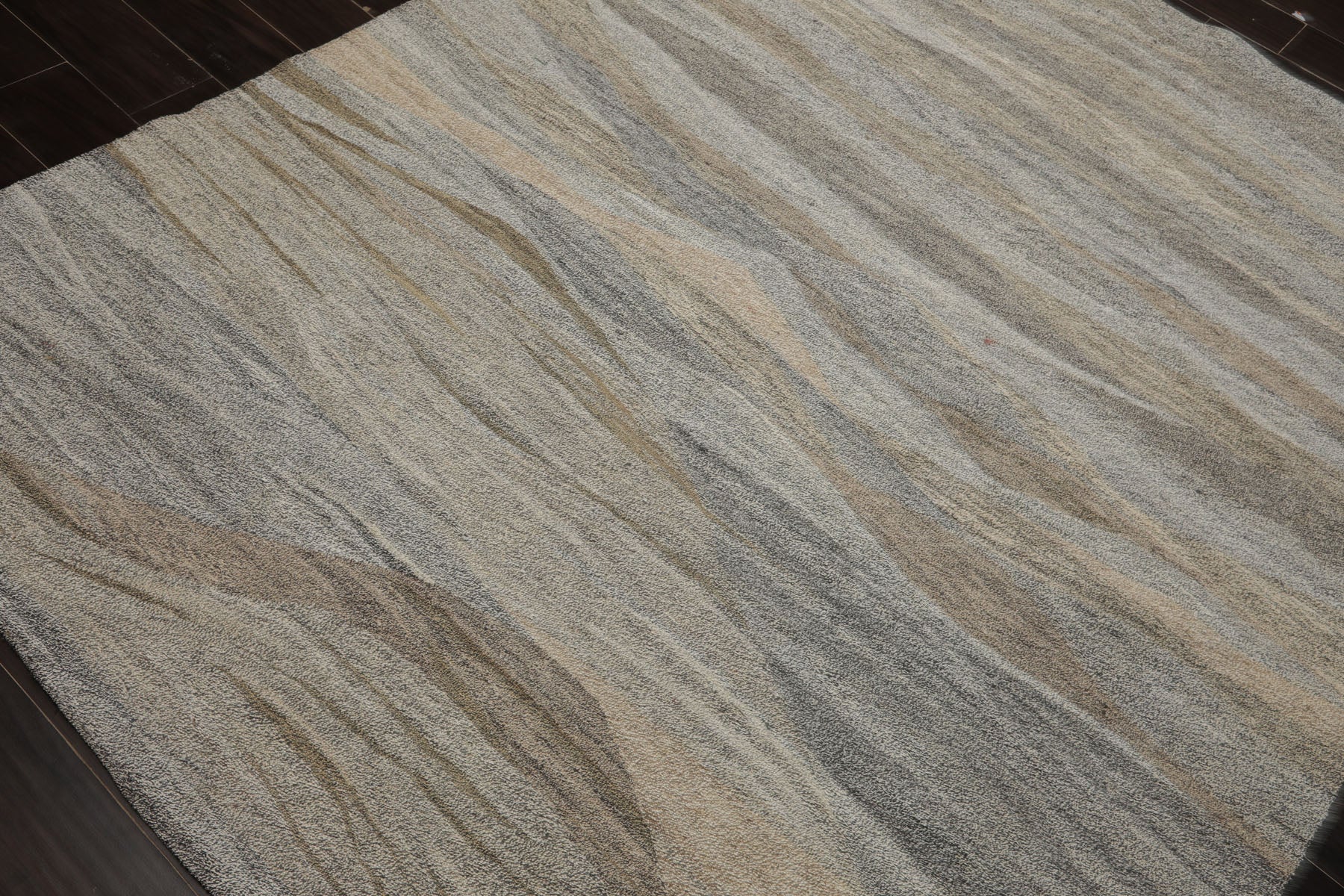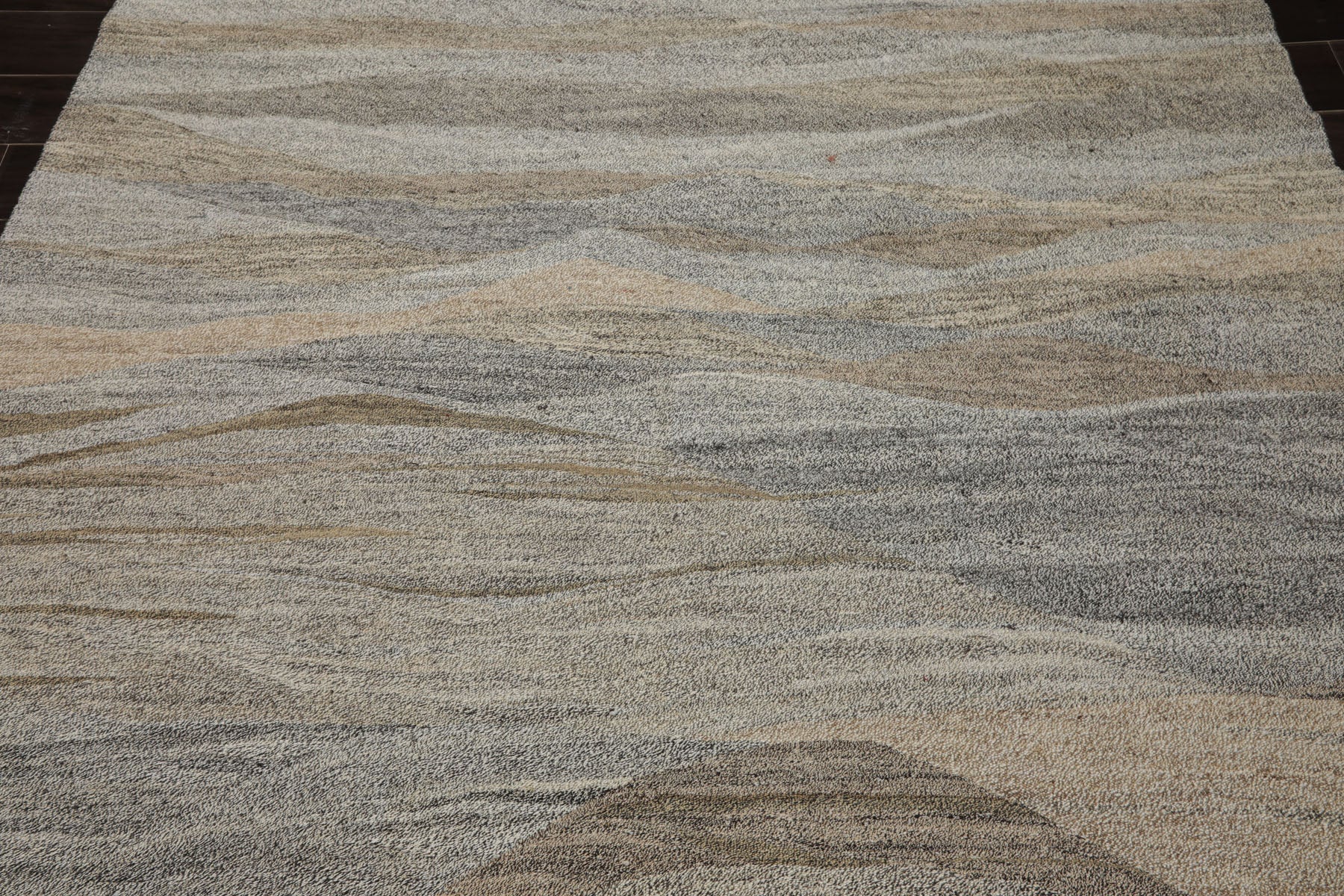 The 5'11" x 7'7" Hand Woven Rug from India showcases a modern abstract design in a refined mix of white, beige, gray, black, and subtle multi-tone accents. Crafted from recycled PET fibers, it offers a sustainable, durable, and low-maintenance flooring solution ideal for everyday living.