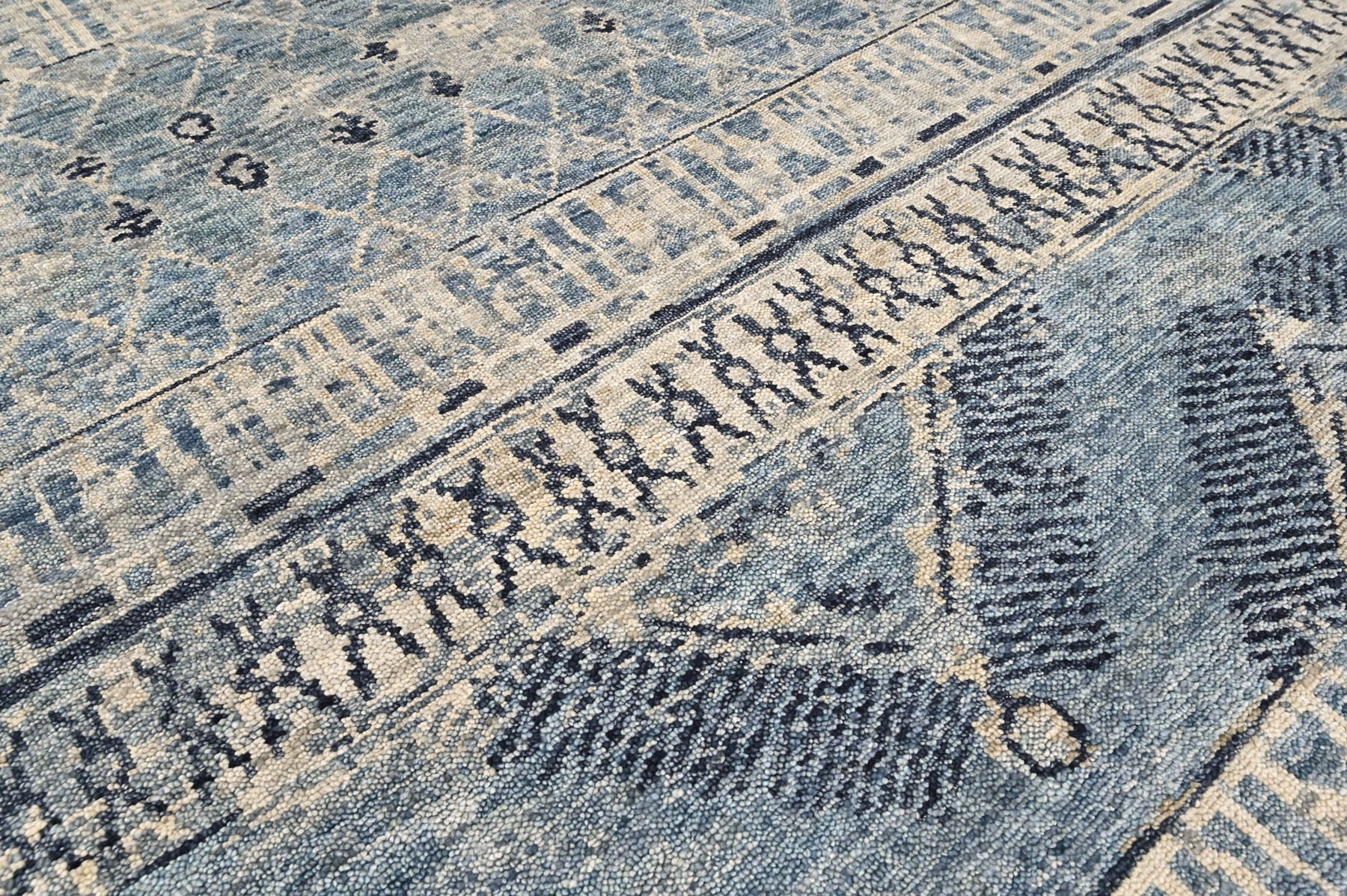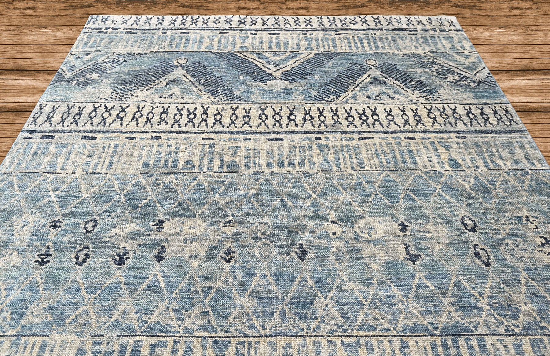 Rooted in Moroccan tribal weaving and updated for modern U.S. interiors, this hand-knotted wool blue rug features softened geometric motifs arranged in horizontal bands. Angular chevrons, abstract tribal symbols, and broken-line elements appear intentionally distressed to create texture and visual flow. The layered blue-and-gray base ranges from dusty sky to slate and navy tones, offering depth without overwhelming intensity. Subtle variation in weave and shading makes motifs emerge gradually, giving the rug an authentic, vintage-meets-modern feel. Ideal for spaces seeking “blue Moroccan rugs,” “geometric boho rugs,” or textured contemporary designs.