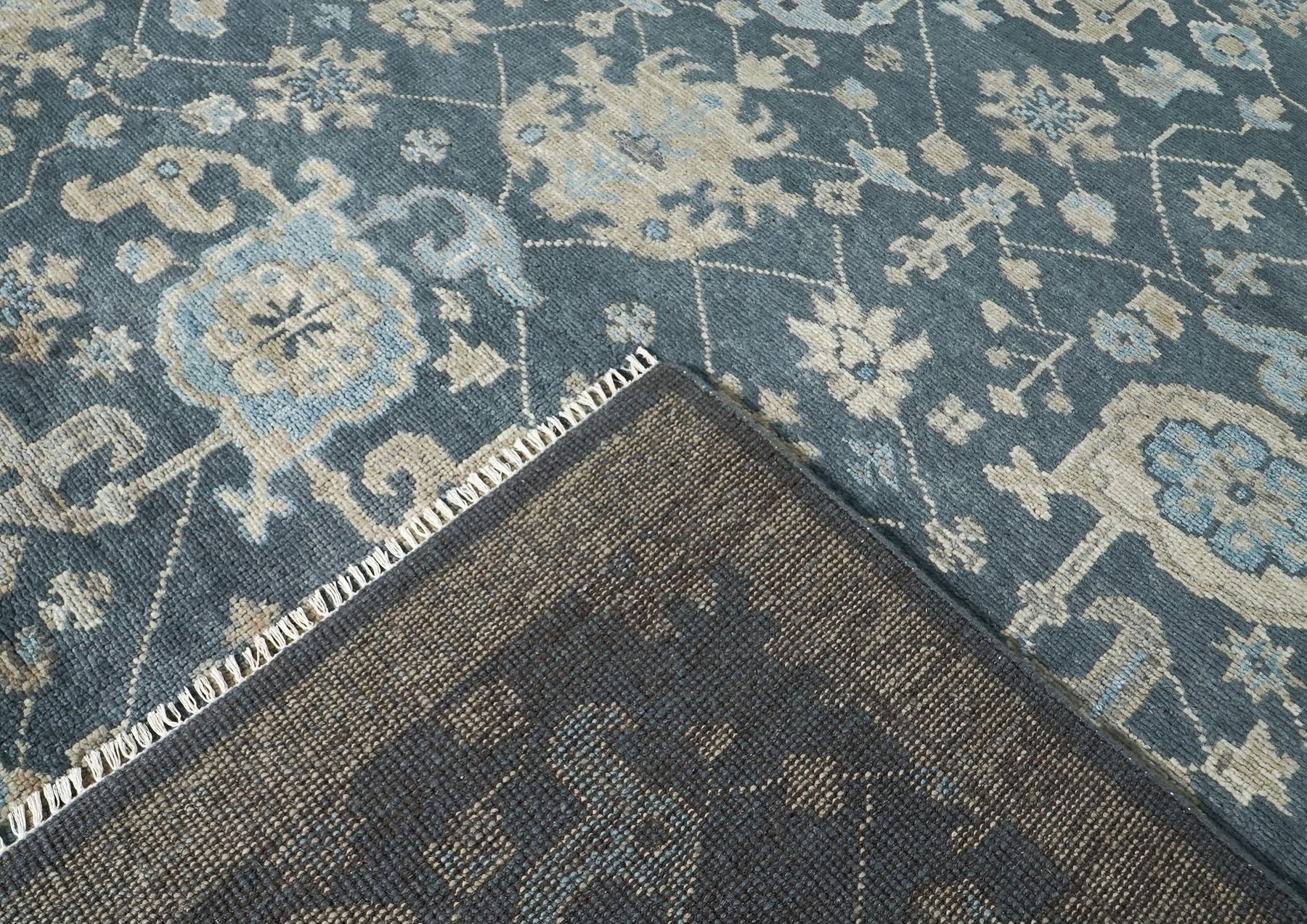 This hand-knotted Oushak rug combines bold geometric precision with rustic elegance. Featuring a commanding central medallion in rich rust-red, surrounded by intricate geometric patterns in navy, ivory, and light blue, the design captures the visual power and structure of traditional Heriz design. Crafted from premium wool on a durable cotton foundation, this piece exudes both strength and beauty. The geometric florals and angular motifs add dynamic visual interest, while the striking rust-red border enhances the overall composition. This rug will bring architectural sophistication and lasting appeal to any interior, making it a timeless investment for discerning homeowners.