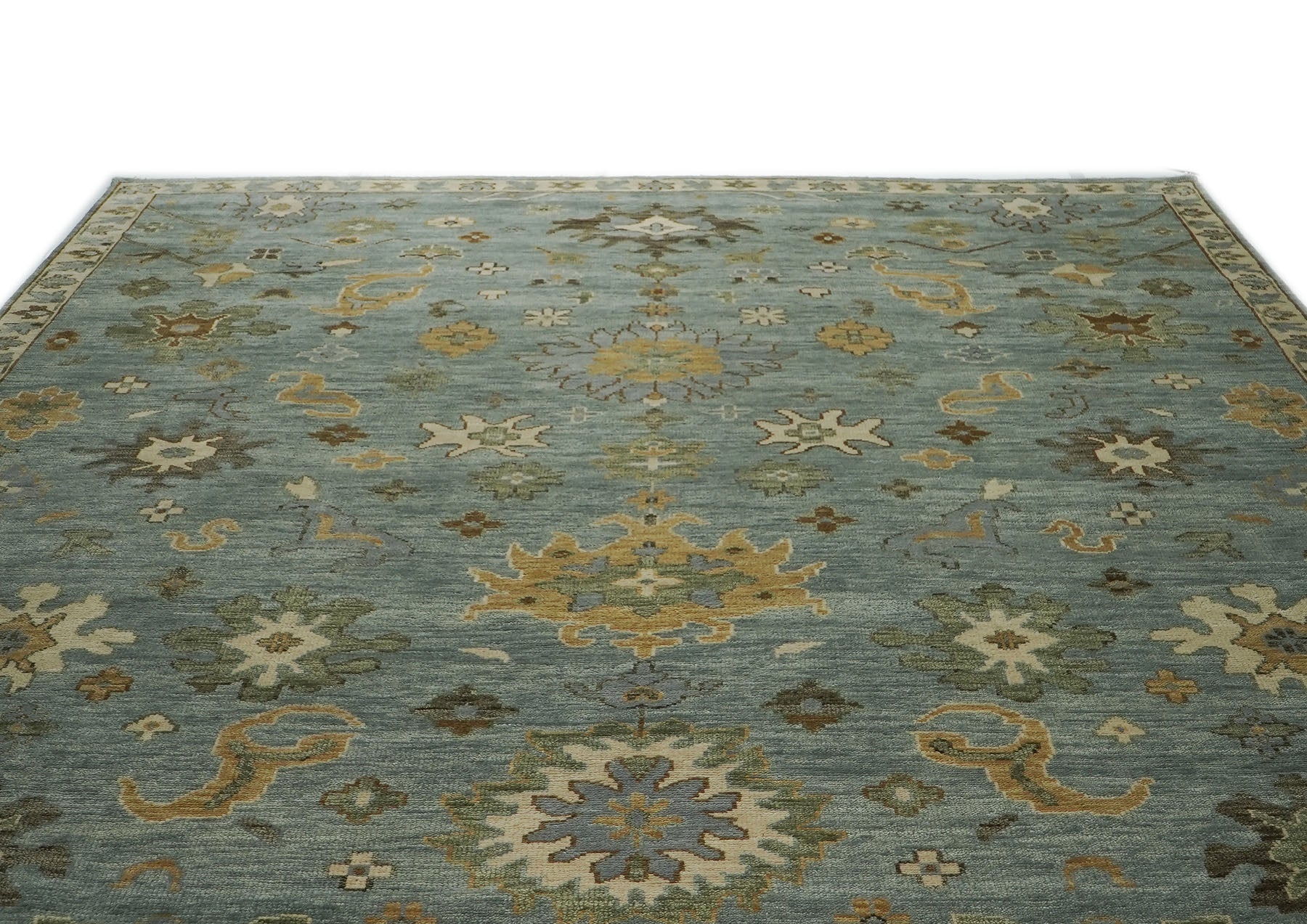 Add tranquility to your space with this stunning hand-knotted Oushak rug, featuring a serene sky blue field adorned with medallions, florals, and organic motifs. Crafted from premium wool on a robust cotton foundation, this rug’s design is a harmonious mix of cool blue, warm golden yellow, creamy beige, subtle green, and rich brown accents, creating a layered, inviting look. The soft beige border, accented with repeating floral and geometric motifs, frames the composition with gentle definition, enhancing the rug’s airy elegance. The transitional style effortlessly adapts to both modern and traditional interiors, offering a blend of calming colors and timeless charm. The luxurious wool pile provides unmatched comfort and durability, making this rug a true investment for your home.