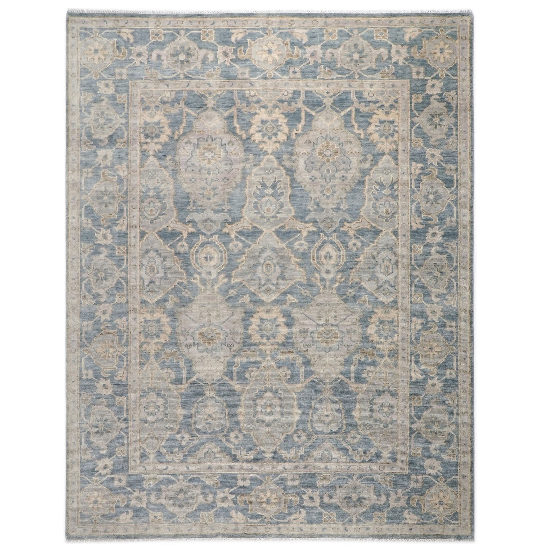 This hand-knotted Oushak rug features a serene blue field with intricate geometric medallions and organic motifs that float across the surface with effortless grace. The soft color palette, which includes subtle shades of ivory, rose, and aqua, creates a calming and sophisticated atmosphere. The delicate beige border, adorned with stylized floral and geometric motifs, frames the composition with minimal contrast, maintaining the overall serenity of the design. Expertly woven from premium wool on a durable cotton foundation, this transitional rug brings timeless beauty and comfort to your home while offering remarkable durability.