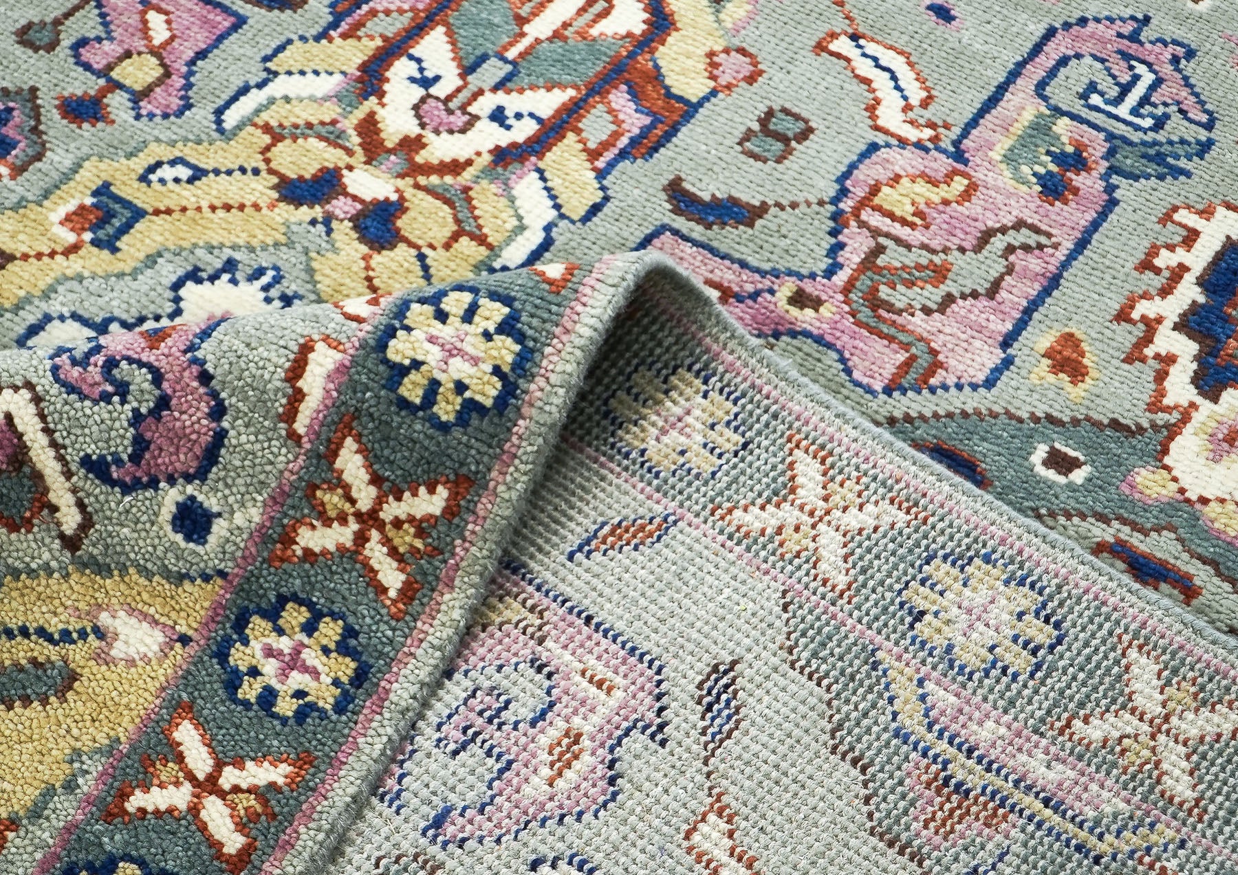 This hand-knotted wool Oushak rug features a rich gray field adorned with a captivating array of stylized florals and geometric motifs. Soft pink accents add a delicate touch, while sage-toned foliage enhances the overall design. Each element has been meticulously hand-knotted, using traditional techniques to ensure exceptional durability and luxurious texture. The subtle gray border, embellished with complementary floral motifs, frames the design with refined elegance. This rug offers a perfect balance of timeless craftsmanship and modern style, making it an investment piece that elevates any space.