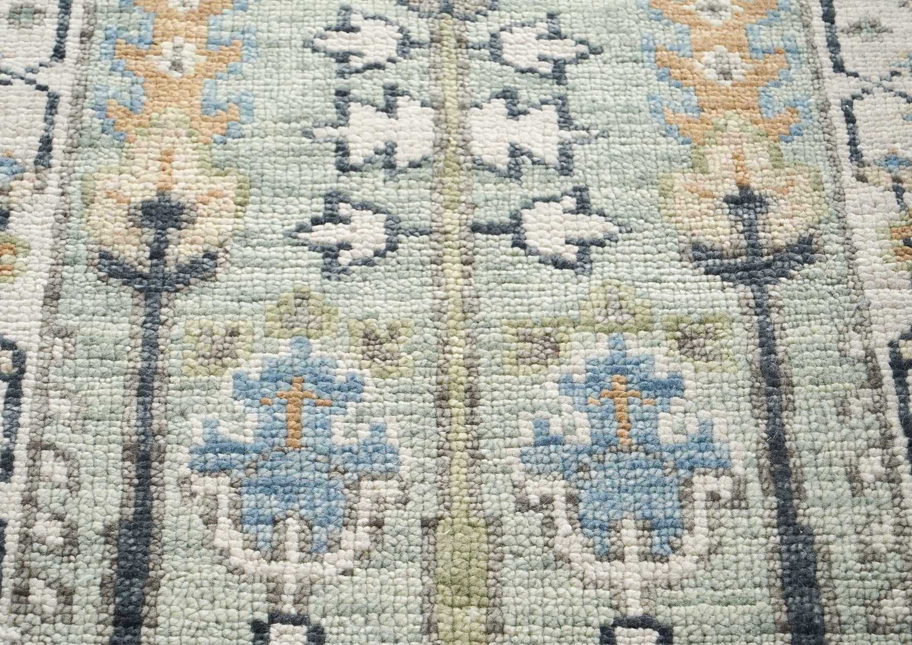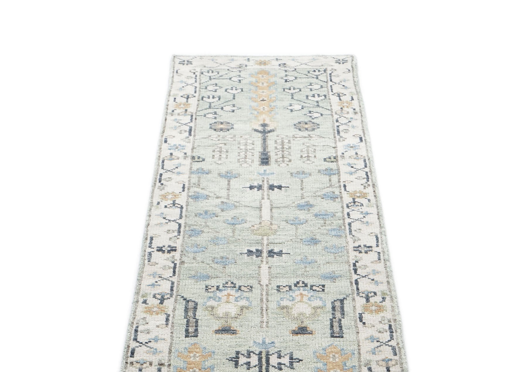 This stunning hand-knotted wool Oushak runner showcases a tranquil celadon field featuring a tree-of-life motif, surrounded by geometric medallions that provide structure and rhythm to the design. The warm beige, ivory, brown, and blue accents create a harmonious balance, infusing the composition with organic warmth. The traditional hand-knotting technique applied on a sturdy cotton foundation guarantees longevity and durability, ensuring that this rug can withstand the test of time. The elongated shape of the runner allows the intricate patterns to unfold across your space, providing a sense of flow and movement. This versatile design, with its rich, multi-tonal palette, works beautifully in both traditional and modern interiors, adding elegance and calm sophistication to any hallway or narrow space.