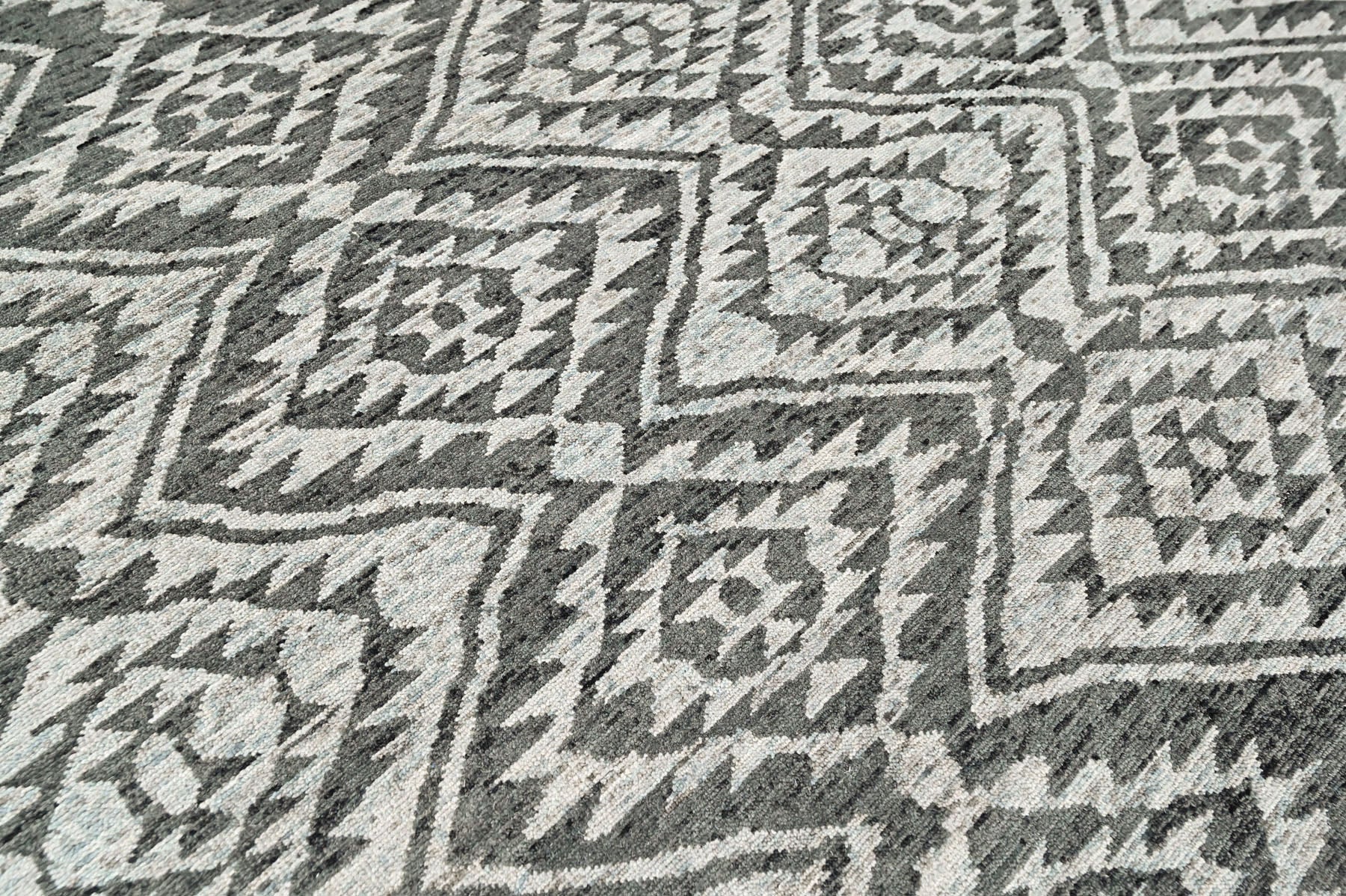 Rooted in traditional Southwestern weaving traditions, this 8'6" × 11'6" hand-knotted wool rug is built on a cotton foundation with a refined 0.5 pile that maintains clear detailing while allowing the natural texture of the weave to show beautifully. The composition features a structured lattice of interlocking diamond medallions—an iconic Southwestern motif symbolizing harmony and continuity. Multiple shades of gray establish the foundation, ranging from pale stone and soft ash to deeper charcoal, while subtle silver highlights introduce gentle contrast and a faint metallic sheen that reflects light. The pattern maintains disciplined geometry, yet slight tonal variations within each diamond soften the layout, preventing it from feeling overly rigid. This balance of structure and softness aligns with U.S. searches for “gray Southwestern rugs” and “modern tribal wool rugs.” Evenly distributed across the surface, the motif reads cohesive and expansive. With its hand-knotted quality, layered gray palette, and timeless tribal structure, this rug adds texture, depth, and quiet character to living rooms, bedrooms, and open modern interiors.
