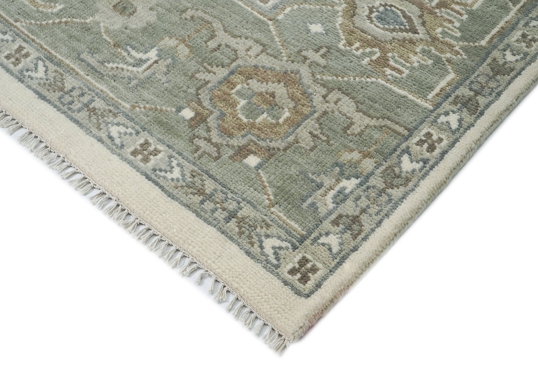 This hand-knotted Oushak rug, featuring an aqua field, combines timeless beauty and modern design with its graceful botanical and geometric motifs in soft ivory, tan, and blue. Crafted from premium wool on a durable cotton foundation, this rug offers comfort and durability while maintaining a serene aesthetic. The ivory border, embellished with delicate floral motifs, enhances the overall design. Perfect for any modern home, this rug creates a calming ambiance that balances contemporary and traditional styles seamlessly.