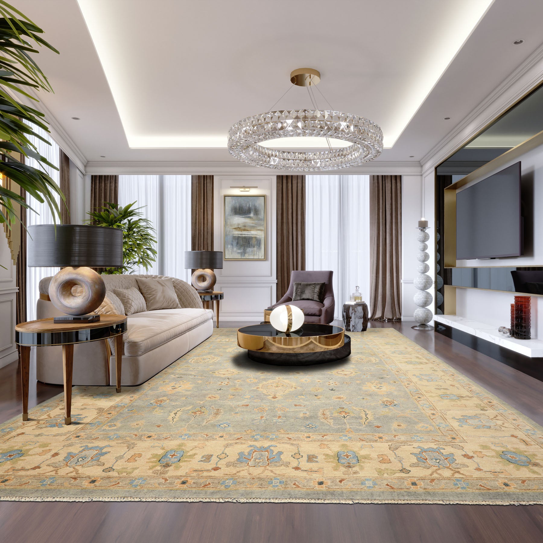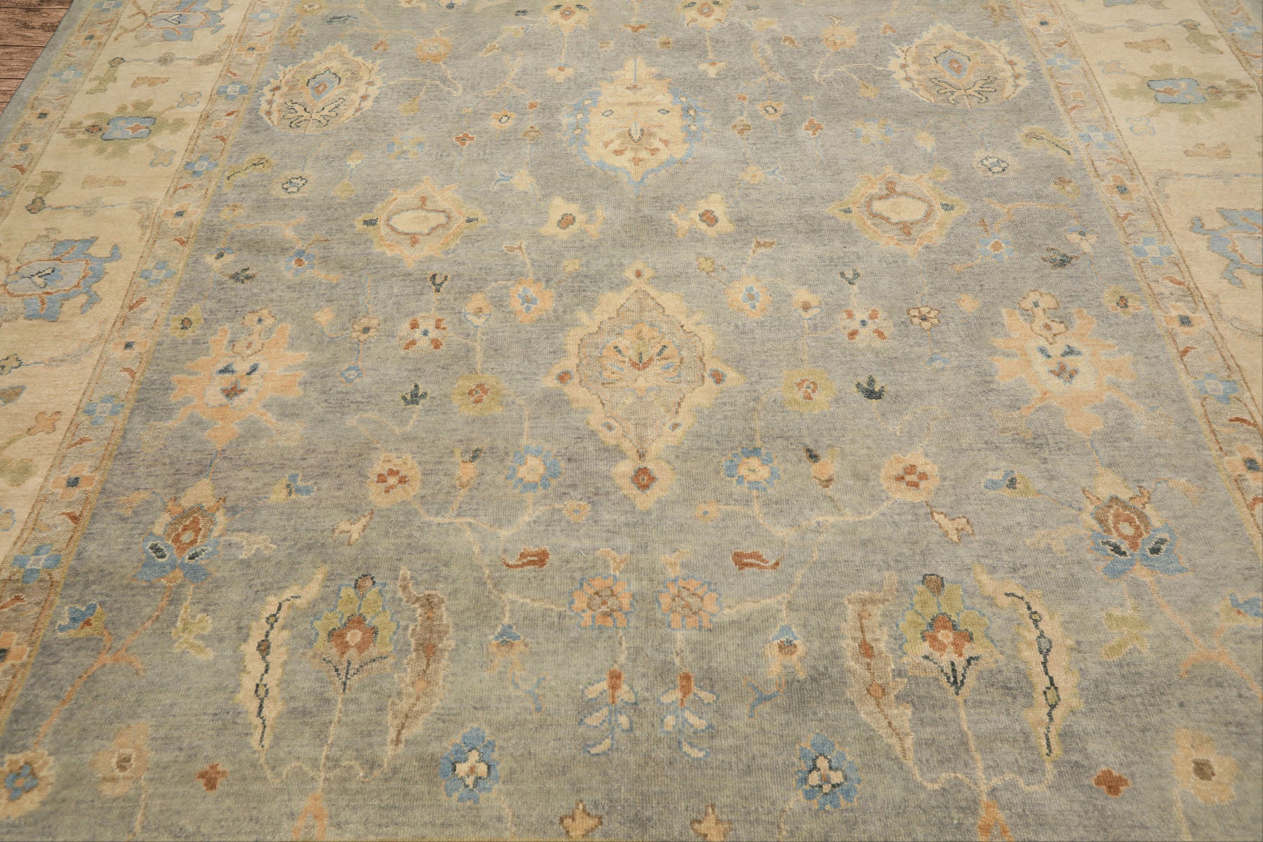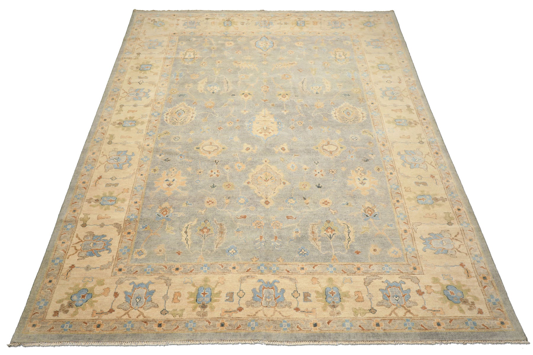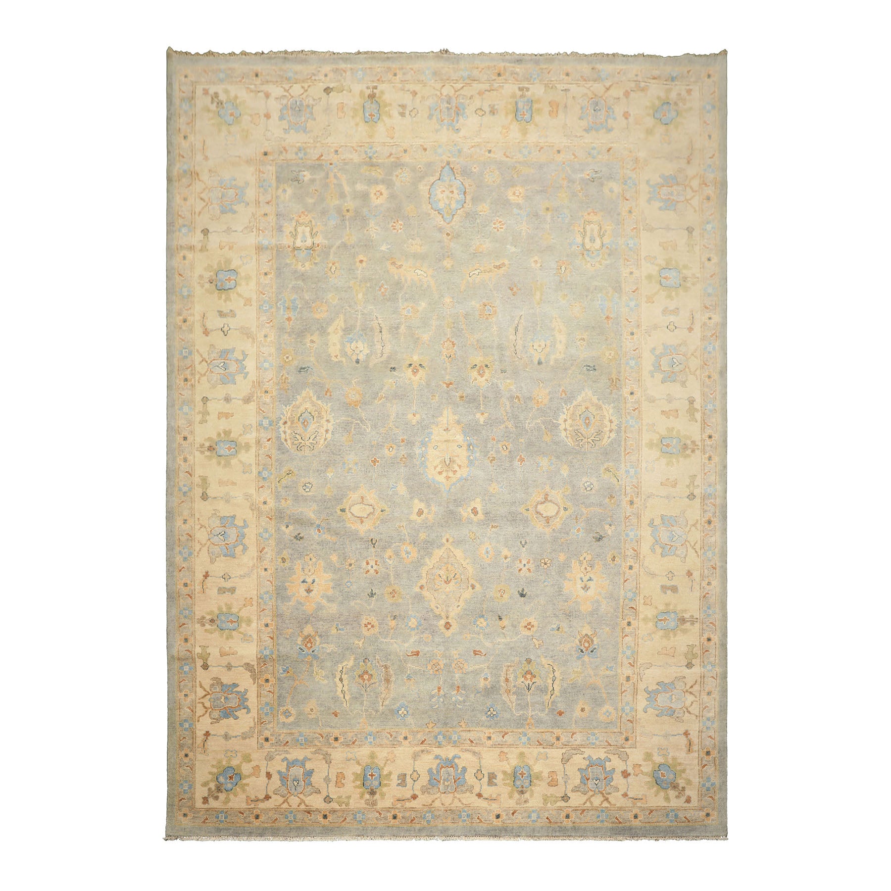 Originating from the historic Turkish weaving center of U?ak, the Oushak Oriental rug has remained one of the most sought-after rug styles since the 15th century. This hand-knotted wool example captures the essence of that tradition through a beautifully balanced composition spread across a tranquil grey field. The design features scattered palmettes, boteh motifs, and delicate floral elements rendered in a refined palette of beige, turquoise, sage, taupe, and subtle rust tones. True to the Oushak aesthetic, the motifs are arranged with generous spacing that allows the design to breathe, making the rug especially effective in large living rooms and open interior layouts. Hand-knotted in wool on a durable cotton foundation, the rug offers a supple texture and the natural luster characteristic of high-quality wool fibers. In the United States interior design market, Oushak rugs have become extremely popular for their soft palettes and relaxed elegance, often chosen by designers for transitional and modern farmhouse interiors. For homeowners seeking a luxury Turkish Oushak area rug that adds timeless sophistication without overwhelming the room, this piece delivers exactly that balance.