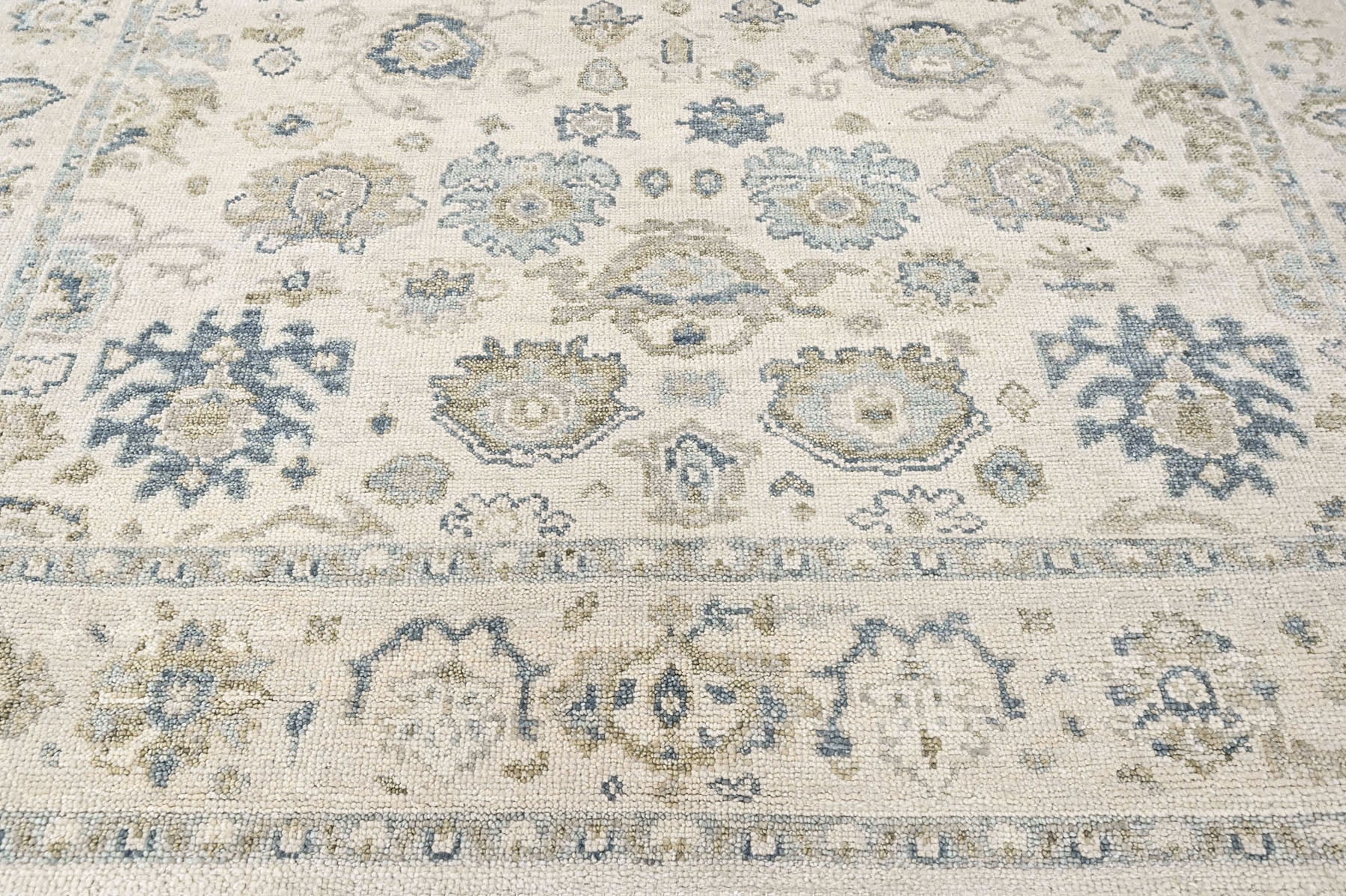 Crafted with an emphasis on quiet sophistication, this 9x12 hand-knotted wool ivory rug offers a harmonious blend of texture, openness, and timeless pattern. The design reflects softened Persian influences, featuring an airy, all-over arrangement of floral rosettes, palmettes, and subtle medallion fragments. An ivory-and-beige ground forms a light canvas enriched with soft gray layering that contributes depth and a gently timeworn feel. Slate accents define selective motifs, lending structure and clarity while preserving the rug’s serene neutrality. The border echoes the interior pattern with delicately rendered floral detailing in matching ivory, gray, and slate tones, completing the layout without overwhelming it. Well suited for living rooms, bedrooms, entry spaces, and open-plan interiors, this transitional ivory rug matches U.S. market preferences for bright, neutral foundations that pair effortlessly with both contemporary and classic furniture.