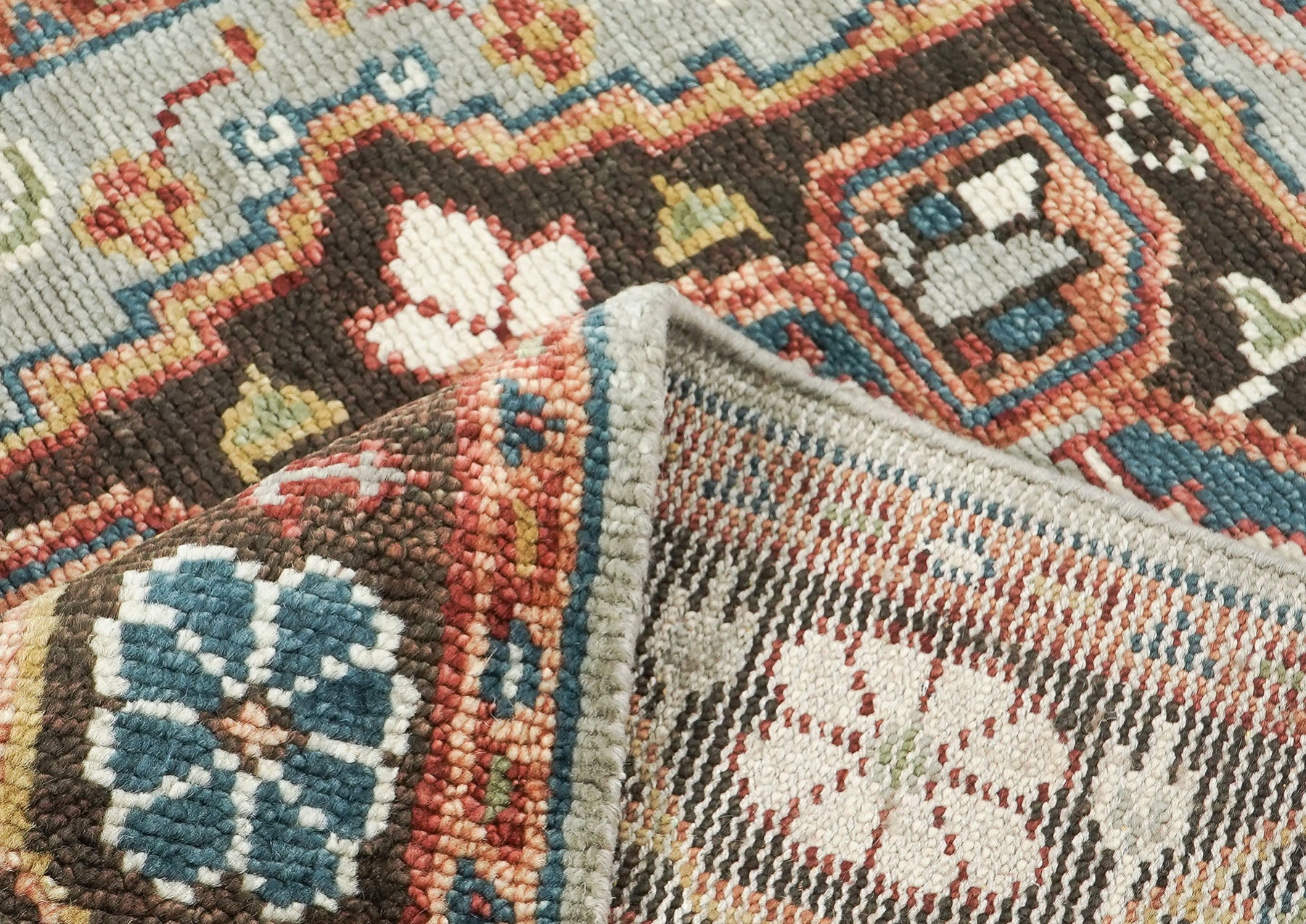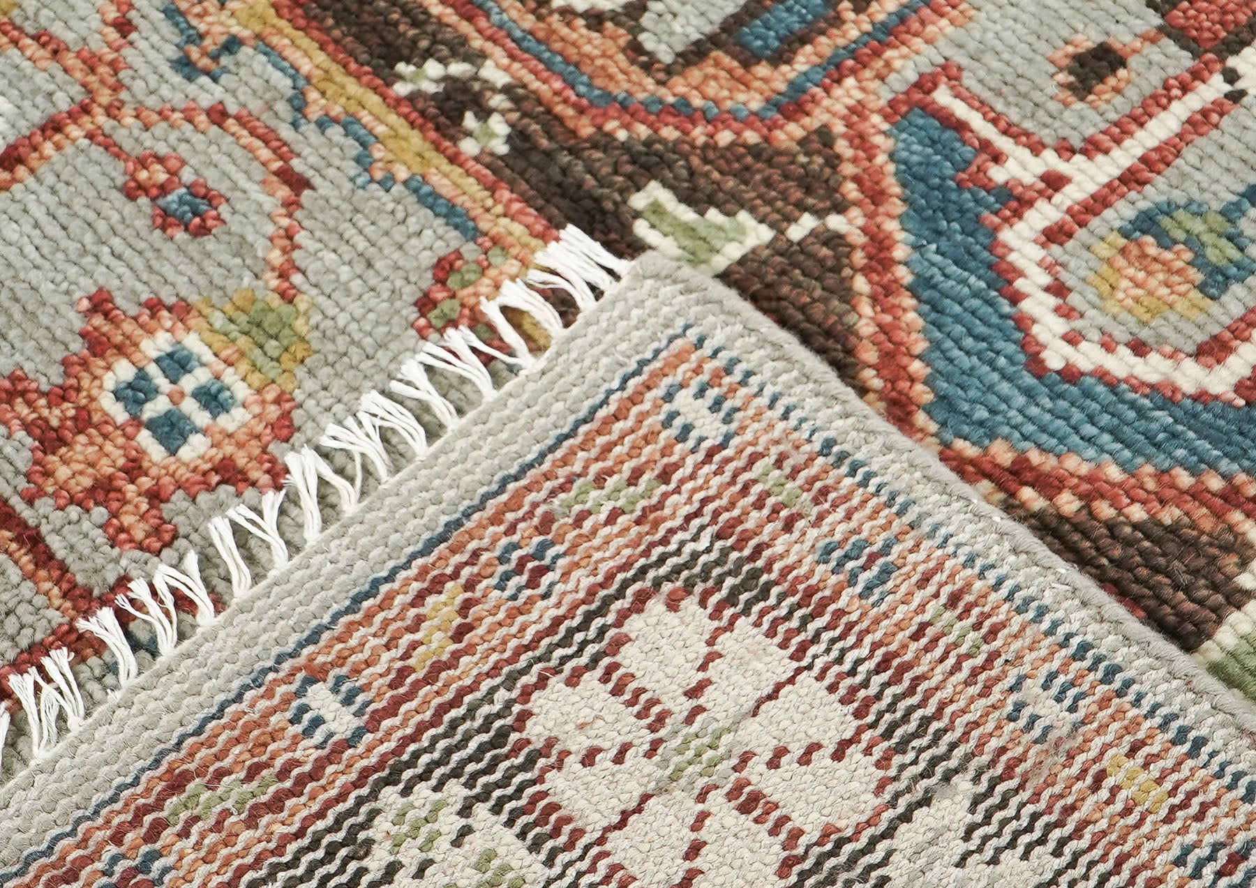 This hand-knotted wool Oushak rug showcases a refreshing mint field adorned with a striking geometric medallion in rich brown and teal. The design features ornamental motifs in gold, blush, and green, radiating throughout the composition, while delicate botanical elements add organic beauty and depth to the luxurious wool surface. Handcrafted using traditional techniques, this rug offers exceptional durability and plush texture. The rust-brown border, embellished with floral rosettes and geometric patterns, beautifully frames the rug, enhancing its multi-colored palette. The inviting combination of mint, teal, brown, and gold creates a fresh yet grounded aesthetic, making it a versatile addition to contemporary and traditional spaces alike.