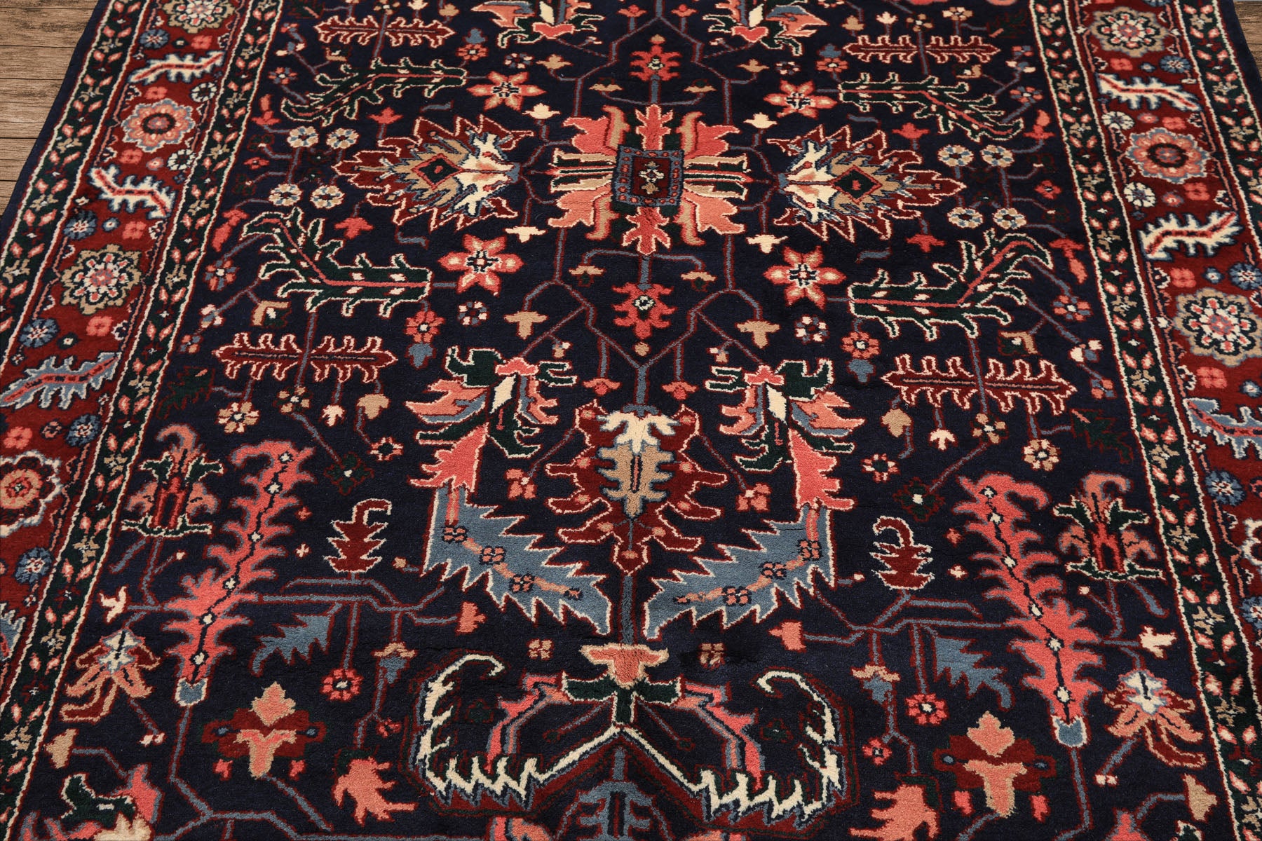 Rooted in centuries of Anatolian artistry, this 5'10" × 8'6" hand-knotted Oushak wool rug reinterprets the refined geometry of the Arts & Crafts movement through traditional Turkish weaving. Crafted with a 0.60-inch cut pile on a durable cotton foundation, it showcases a harmonious composition of navy, red, blush, and peach hues arranged in symmetrical botanical and geometric forms. The dense hand-knotted structure ensures resilience and texture depth, making this Oushak area rug ideal for living rooms, studies, or interiors that value timeless craftsmanship. With its soft underfoot feel and enduring design balance, it bridges heritage and modernity while offering quiet luxury to any decor scheme.