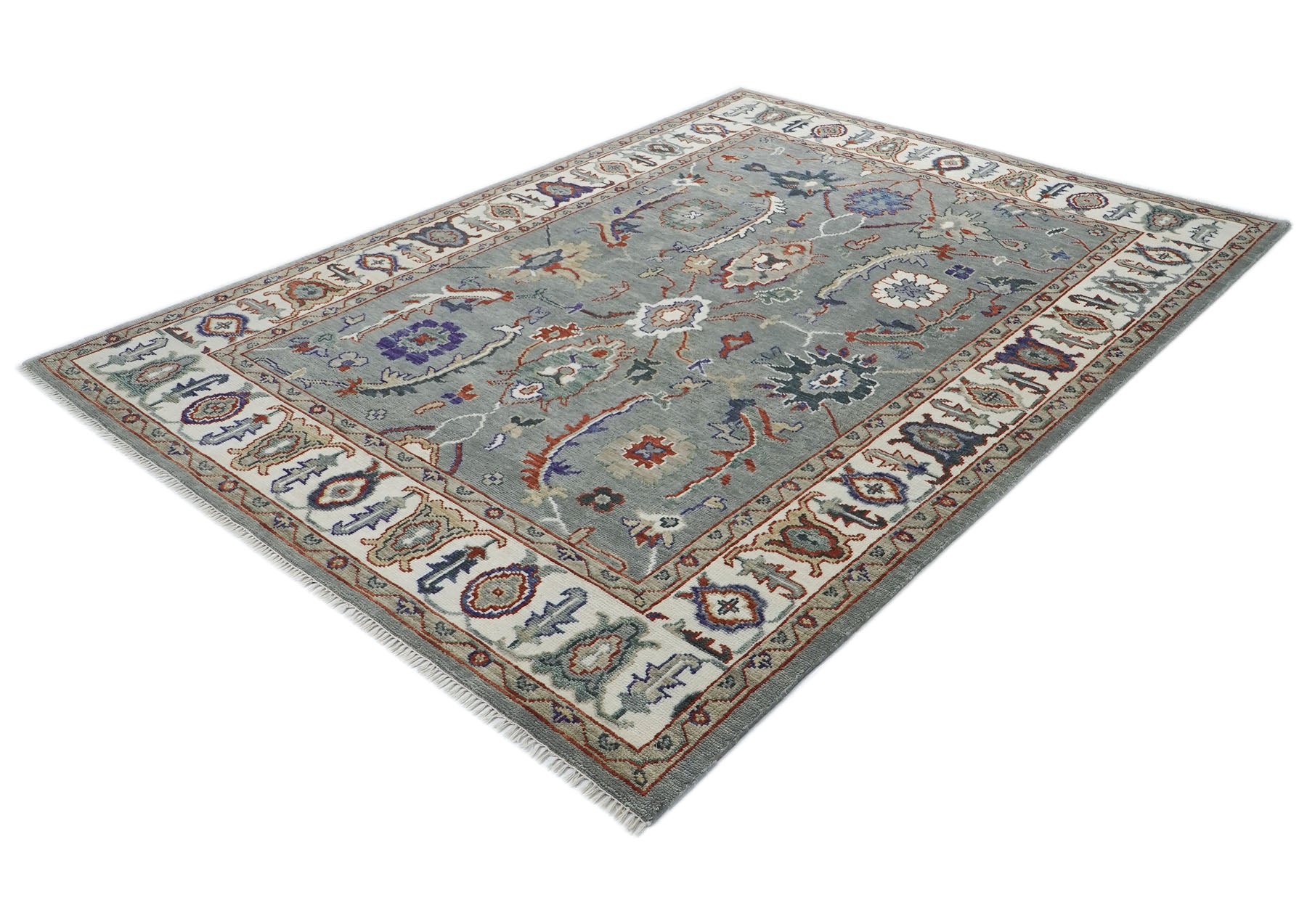 This hand-knotted Oushak rug features a sophisticated slate gray field adorned with a delicate all-over pattern of geometric medallions and organic motifs in soft ivory and warm gold. The design balances traditional motifs with a modern sensibility, offering a timeless look that complements a wide range of interior styles. The wide beige border, detailed with floral and geometric elements, provides gentle definition without overwhelming the design. Crafted from premium wool on a durable cotton foundation, this transitional rug offers both exceptional durability and luxurious comfort, making it a perfect addition to any home.