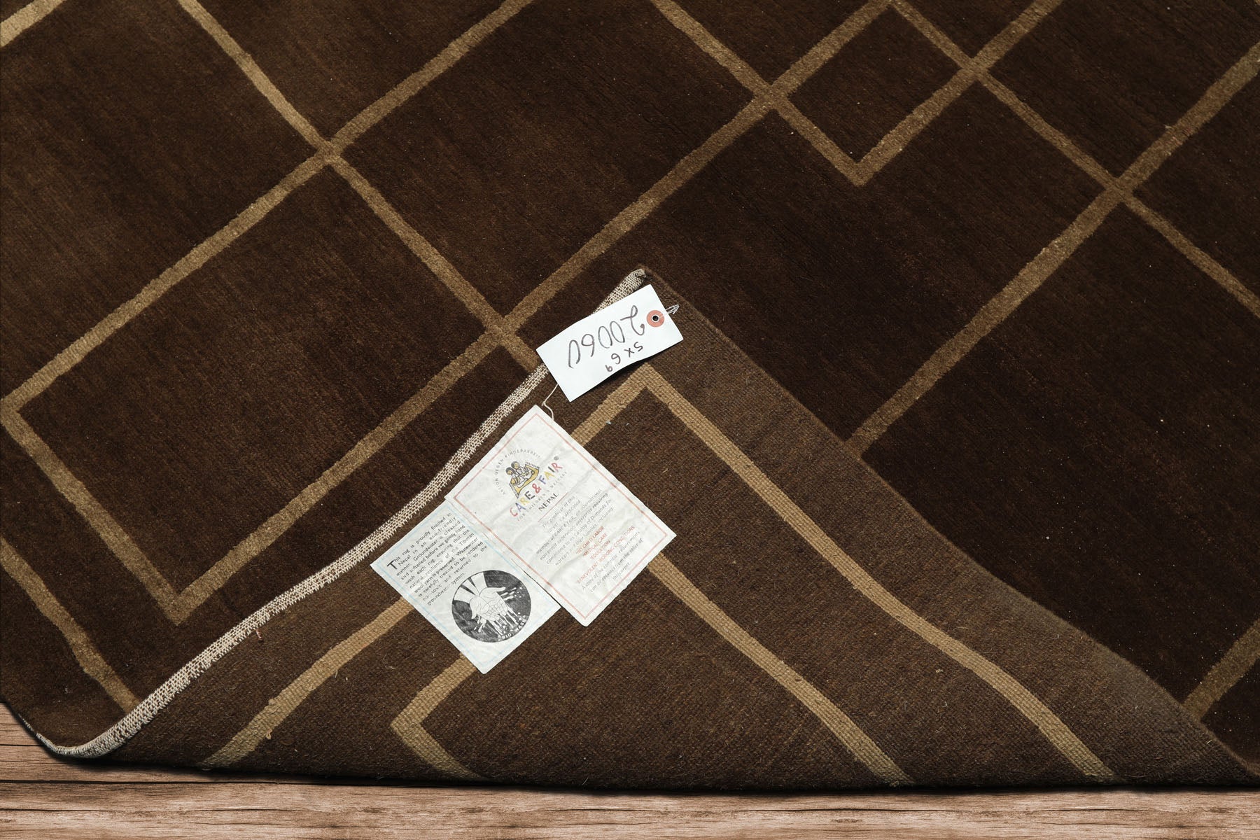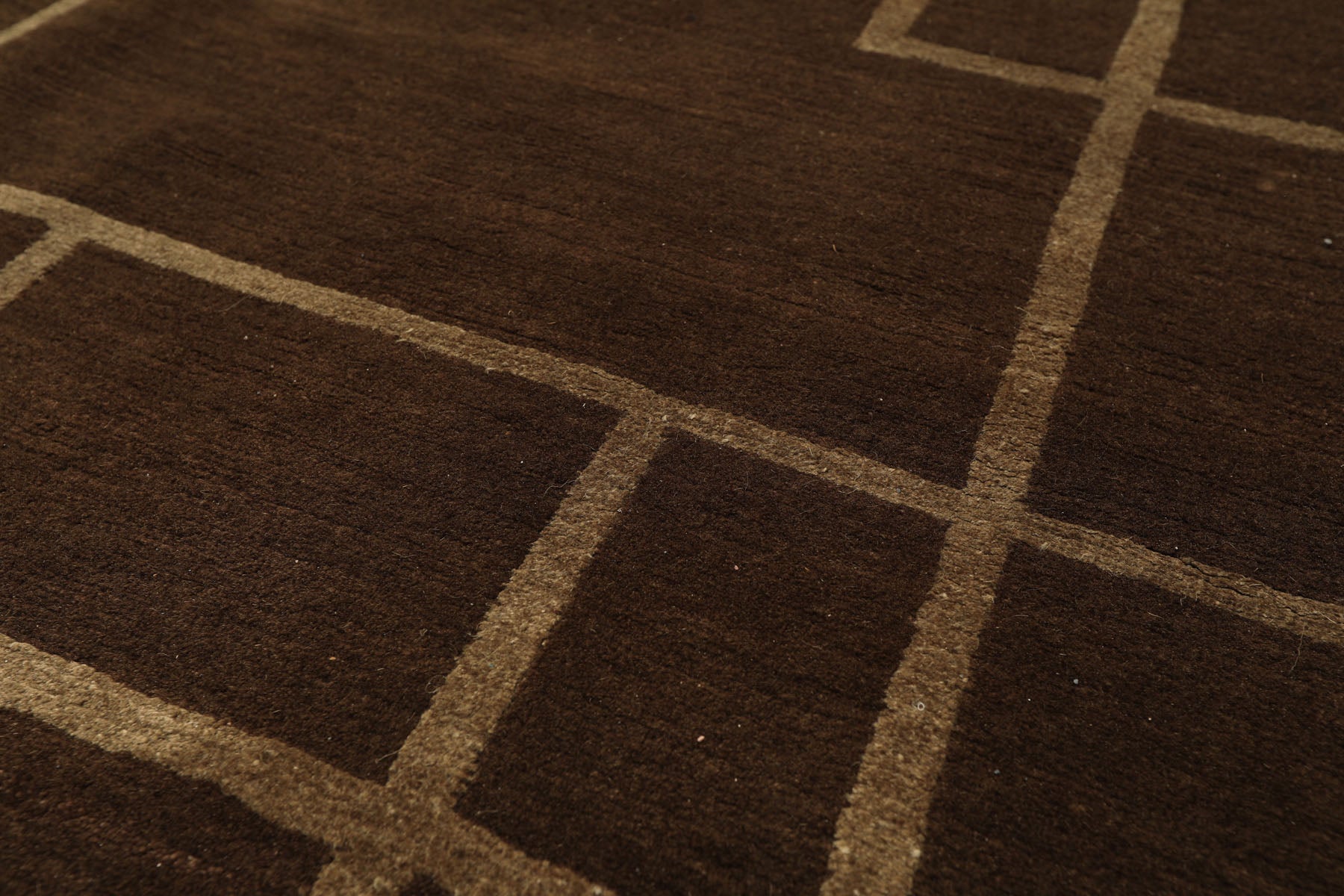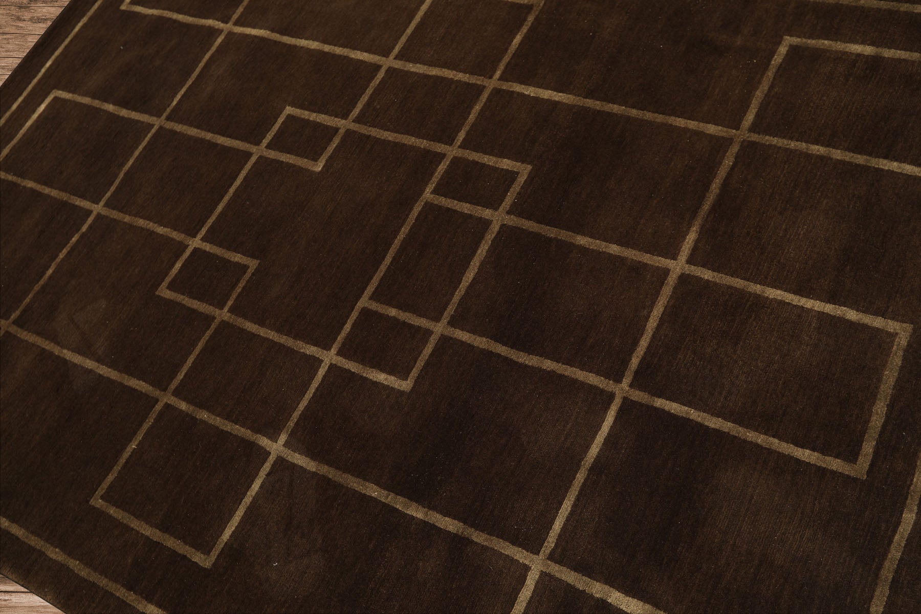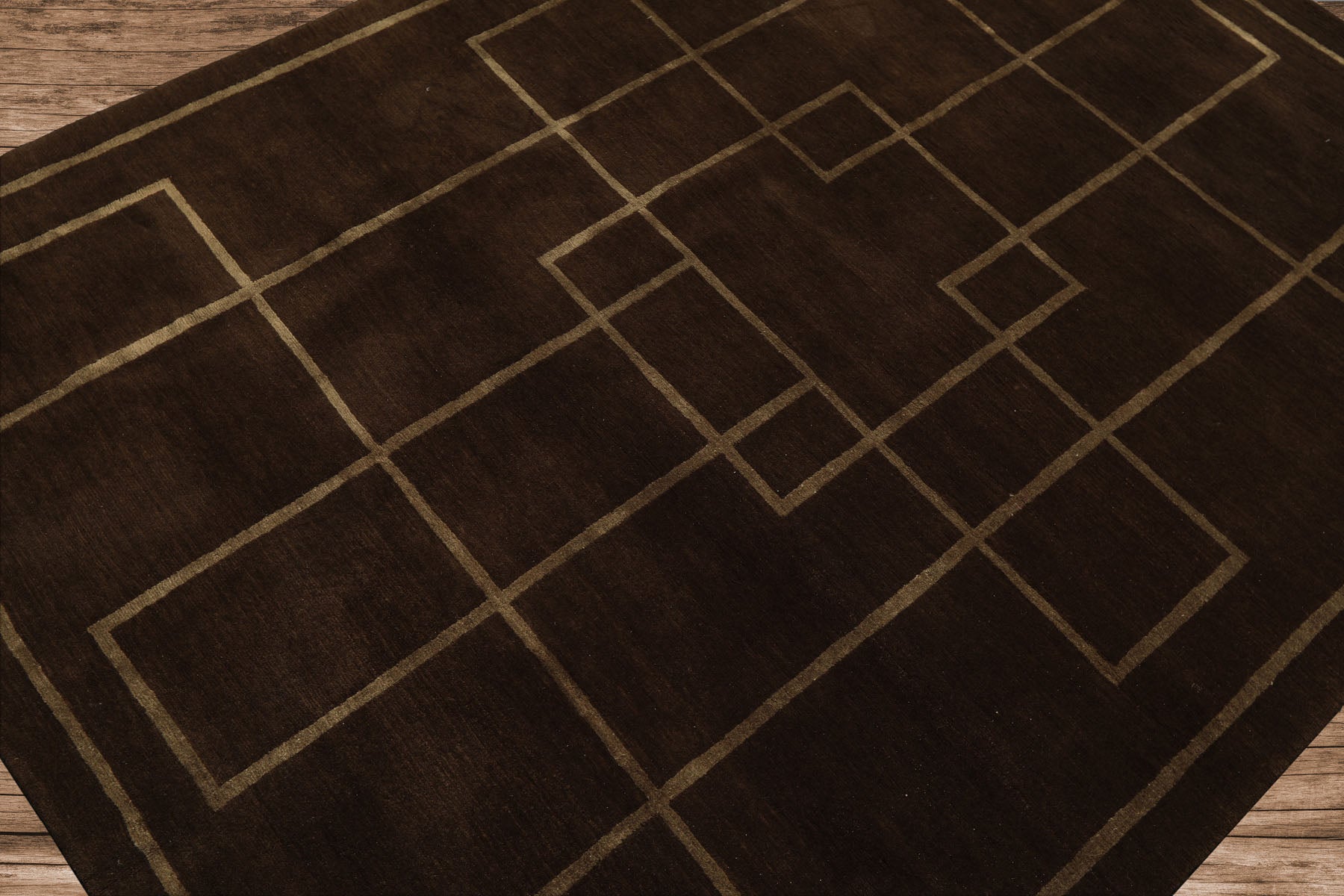 Balancing form, texture, and timeless elegance, this 5' x 6'9" hand-knotted Tibetan rug fuses Art Deco geometry with the enduring craftsmanship of Himalayan weaving traditions. Handcrafted from a luxurious blend of wool and silk on a durable cotton foundation, it features a rich brown field accented by precisely arranged gold linear motifs, creating a composition that is both structured and tranquil.