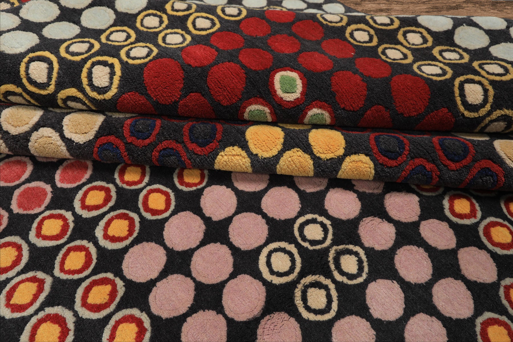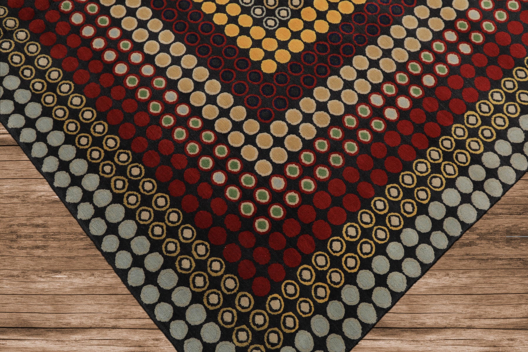 The rug’s concentric dot pattern, presented in dark gray, gold, red, blue, blush, lime, and navy, establishes a dynamic visual rhythm reminiscent of mid-century modern and optical art movements. The fluid transitions between hues create an engaging sense of depth and motion, resulting in a bold yet balanced aesthetic that enlivens any room.