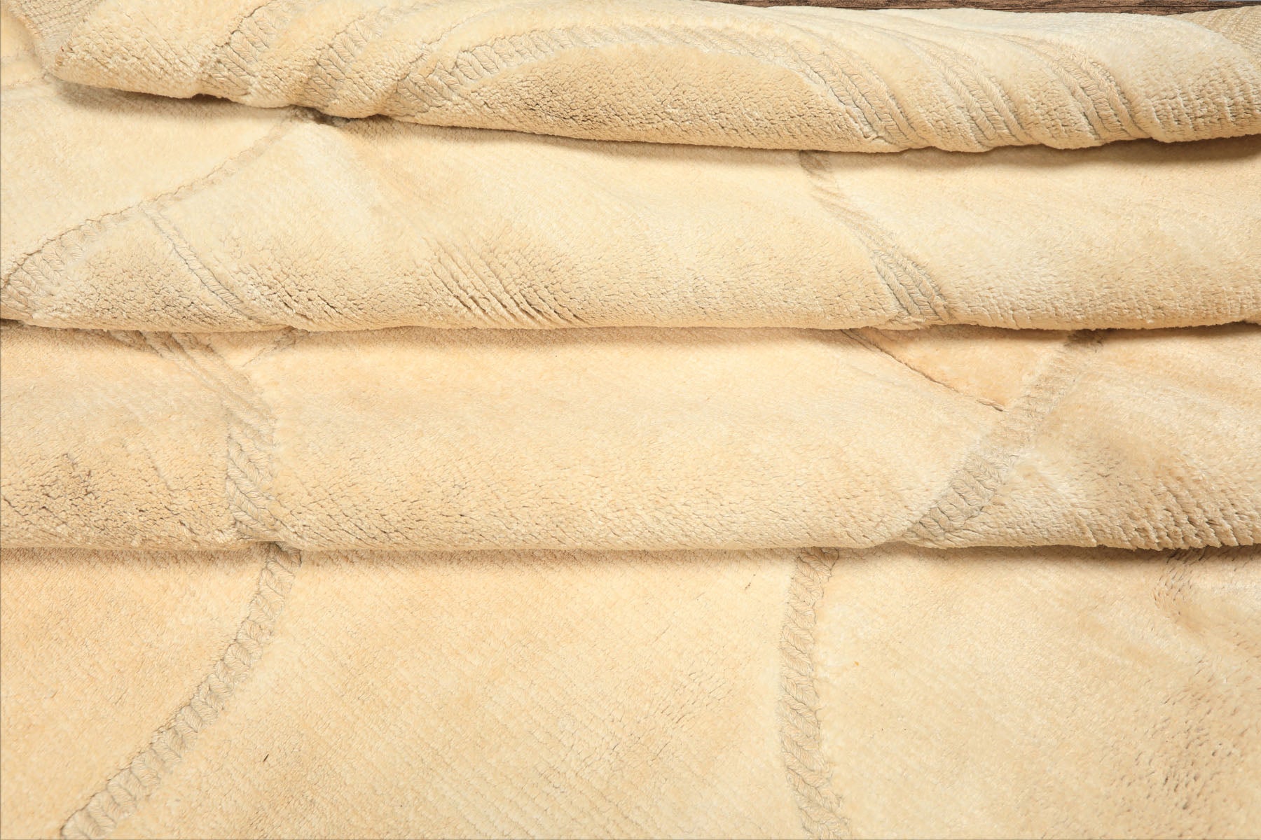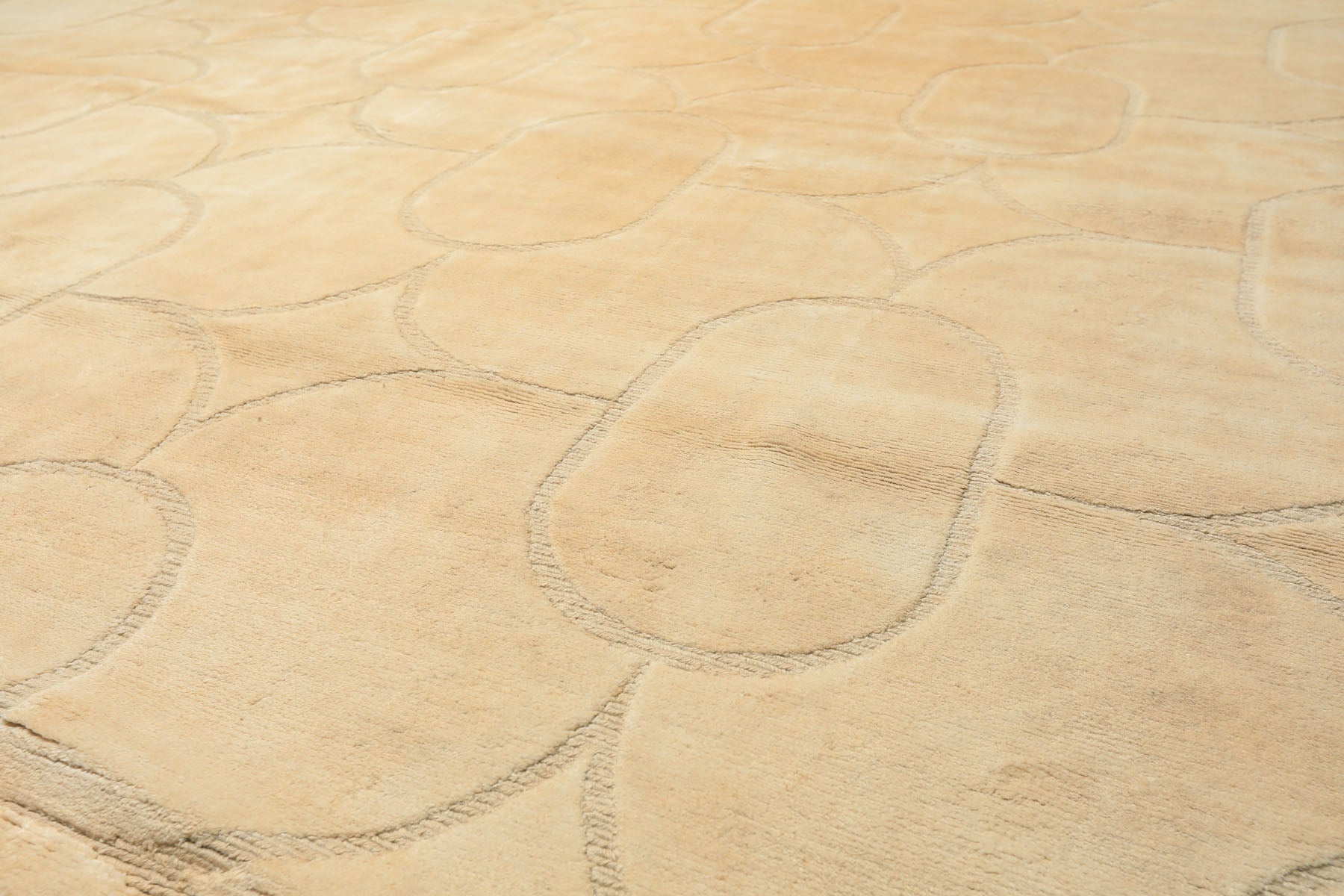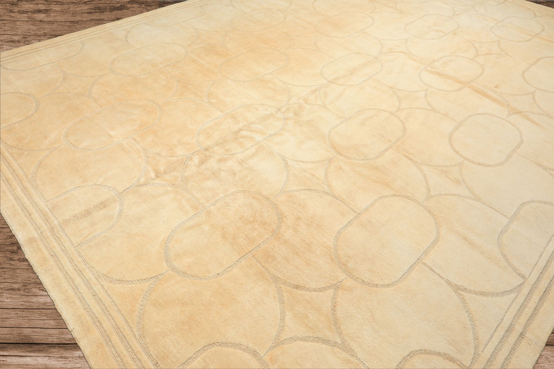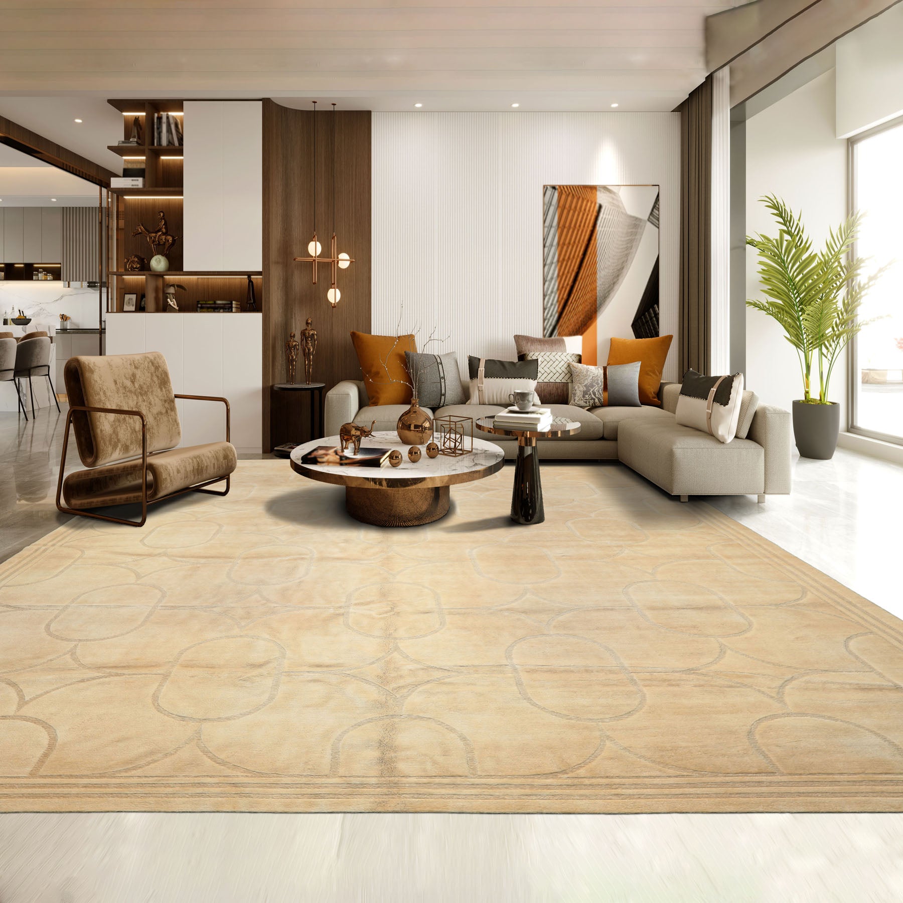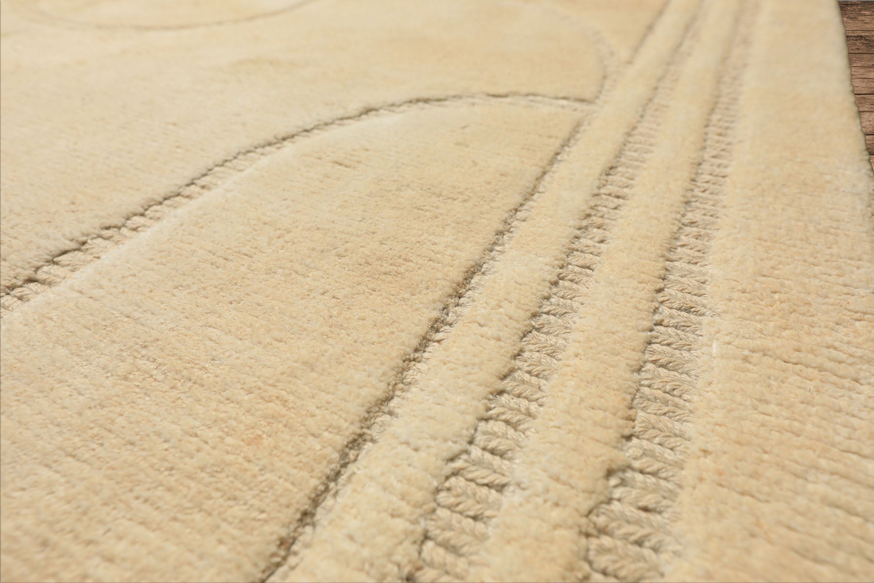 A tribute to modernist architecture, this 9'10'' × 13'10'' hand-knotted Art Deco rug blends wool and linen into a refined canvas of texture and tone. The ivory-beige palette features interlocking ovals and arcs that form a rhythmic low-relief pattern. At a sleek 0.25-inch pile, the rug offers both visual depth and tactile elegance ideal for contemporary spaces seeking quiet luxury. Handwoven on a cotton foundation, this modern Tibetan-inspired piece exemplifies balance, geometry, and artisanal discipline — a perfect fit for minimalist interiors.