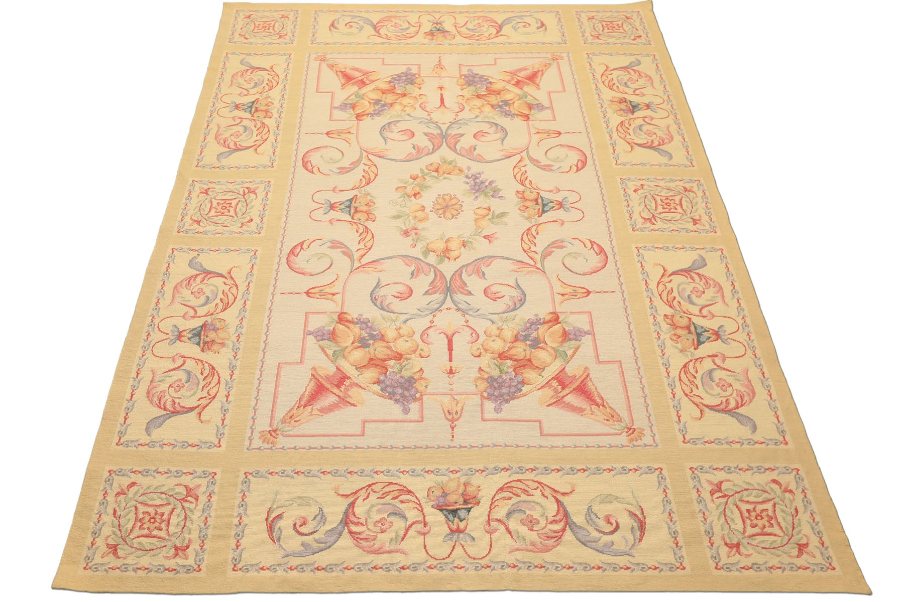 6x8 Beige, Rose, Lavender Color Hand Knotted French Aubusson Wool Traditional Oriental Rug