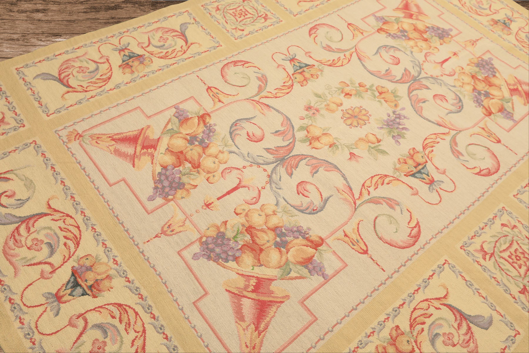 Few rug styles carry the historical prestige of the French Aubusson tradition, a weaving heritage that originated in the royal tapestry workshops of 17th-century France. This hand-knotted wool needlepoint rug beautifully reflects that legacy through a richly detailed symmetrical composition. Across a warm butter-yellow field unfold bold acanthus scrolls, cornucopia motifs overflowing with fruit, and delicate floral medallions arranged with classical balance. The palette—rose, coral, lavender, sage, and soft grey—captures the unmistakable elegance associated with French decorative arts. A structured panel border filled with repeating cartouches and floral corner medallions frames the composition with architectural precision. Hand-knotted in wool on a sturdy cotton foundation, the needlepoint construction allows intricate motifs to appear with remarkable clarity while producing a flat tapestry-like surface.