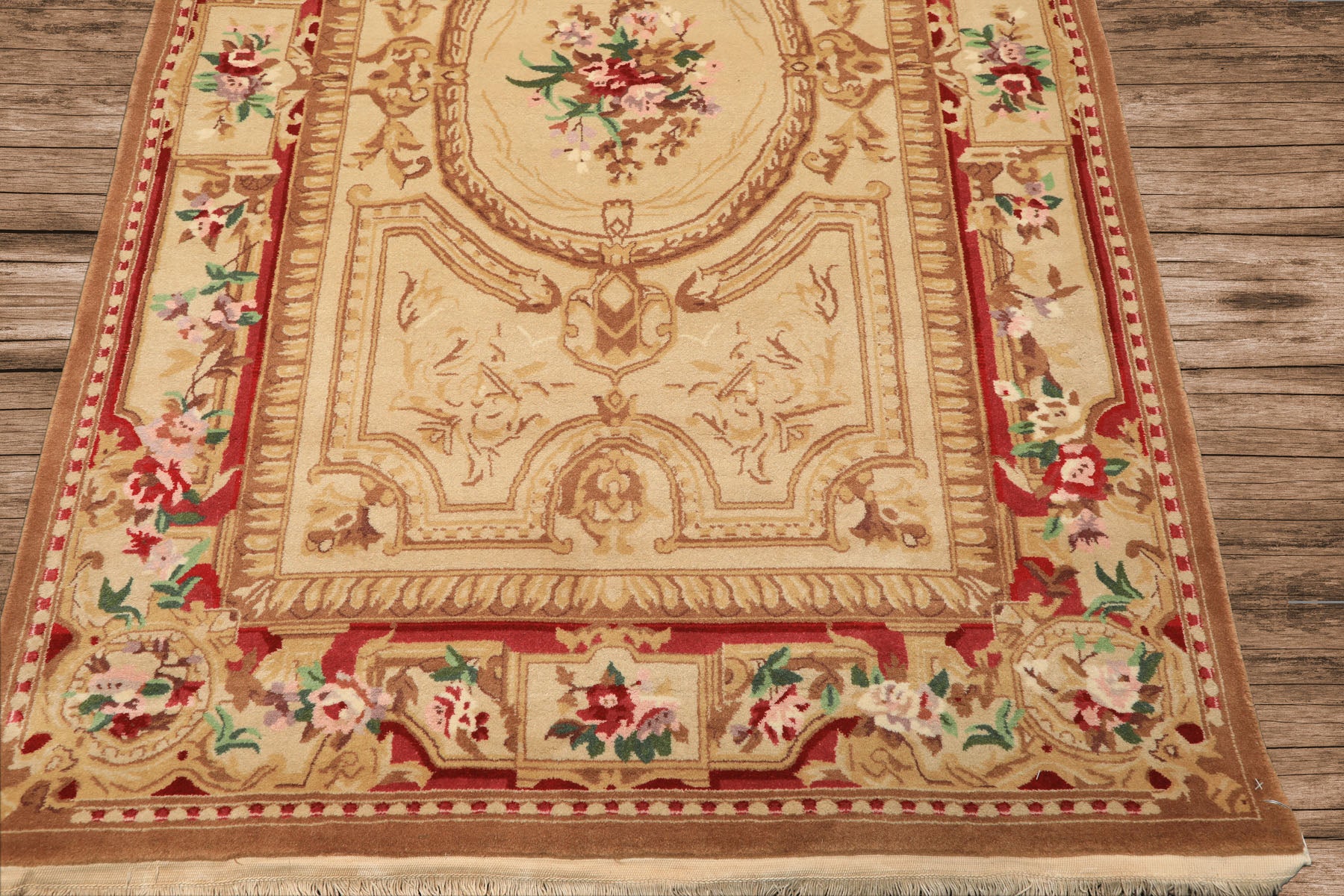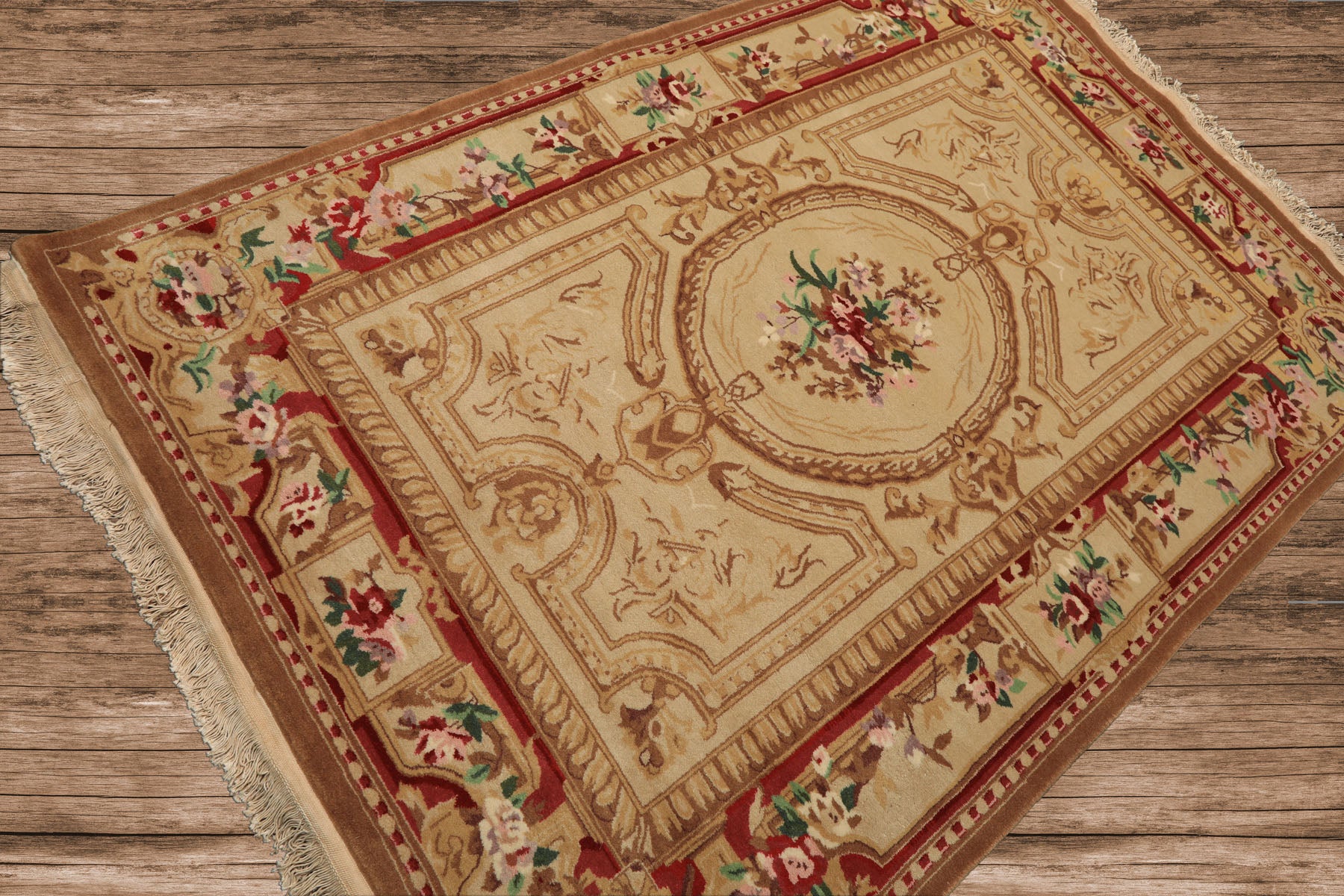 Old-world elegance defines this 4x6 hand knotted French Aubusson Savonnerie rug. Crafted from fine Asmara wool with a smooth cut pile, the rug features an ornate central medallion framed by richly detailed floral borders, woven at an impressive 200 KPSI for exceptional clarity. A beige base is layered with brown, rose, red, green, pink, and multi-tonal accents, creating a regal palette. Finished with a cotton foundation, this rug enhances formal living and dining spaces.