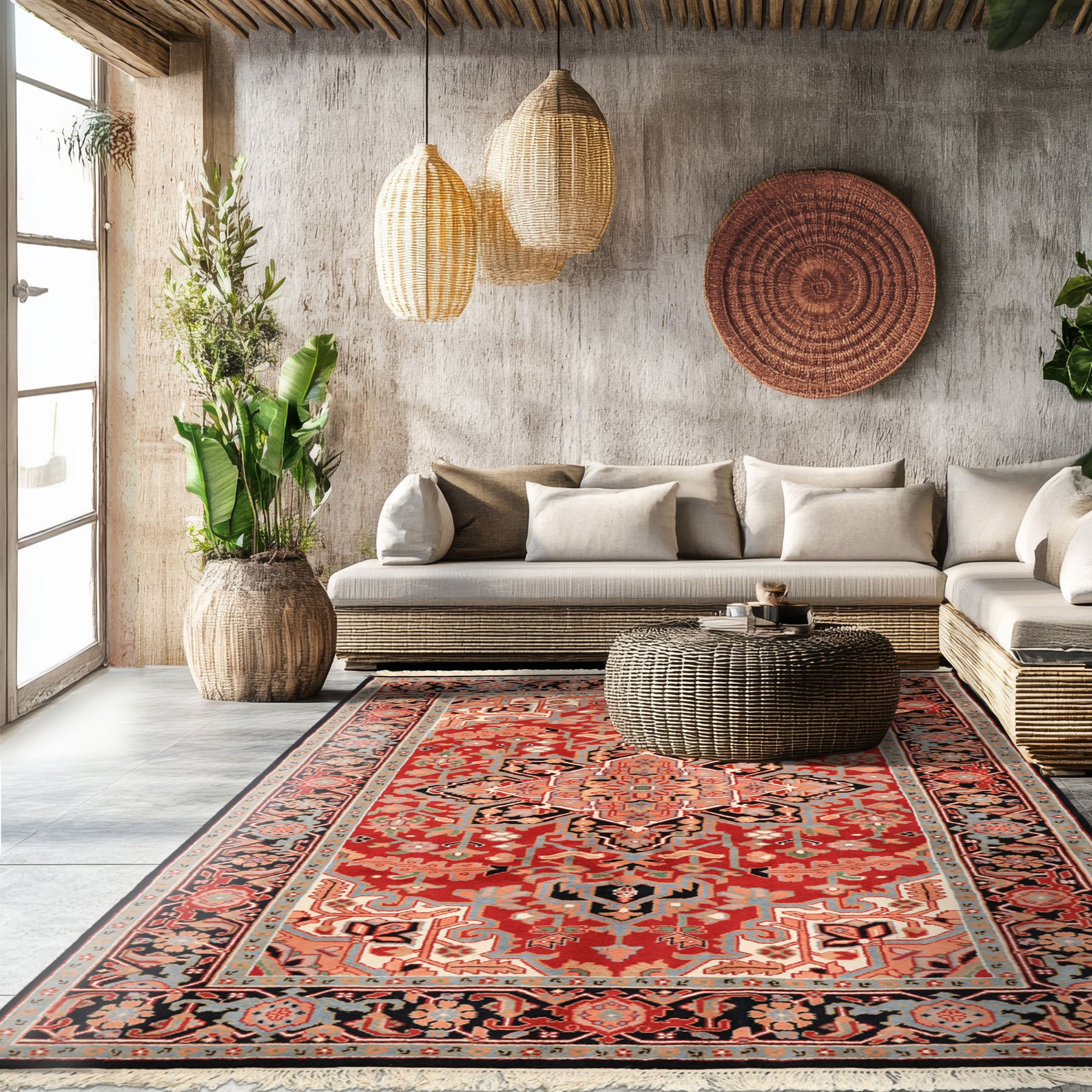 Woven in the bold architectural tradition of Indo Heriz carpets, this 5'10'' × 8'10'' hand-knotted wool rug features a medium 0.50-inch pile on a cotton foundation. A saturated red field establishes a strong visual anchor, ideal for interiors that benefit from structure and contrast. The central geometric medallion is composed of angular forms in navy, charcoal, and ivory, accented with soft aqua and muted green highlights that temper the intensity of the red ground. Stepped corner spandrels and a geometric border echo the medallion’s structure, reinforcing the rug’s architectural rhythm. Known for durability and timeless design, this Heriz-style Oriental rug works well in living rooms, dining areas, or offices with traditional or eclectic décor.